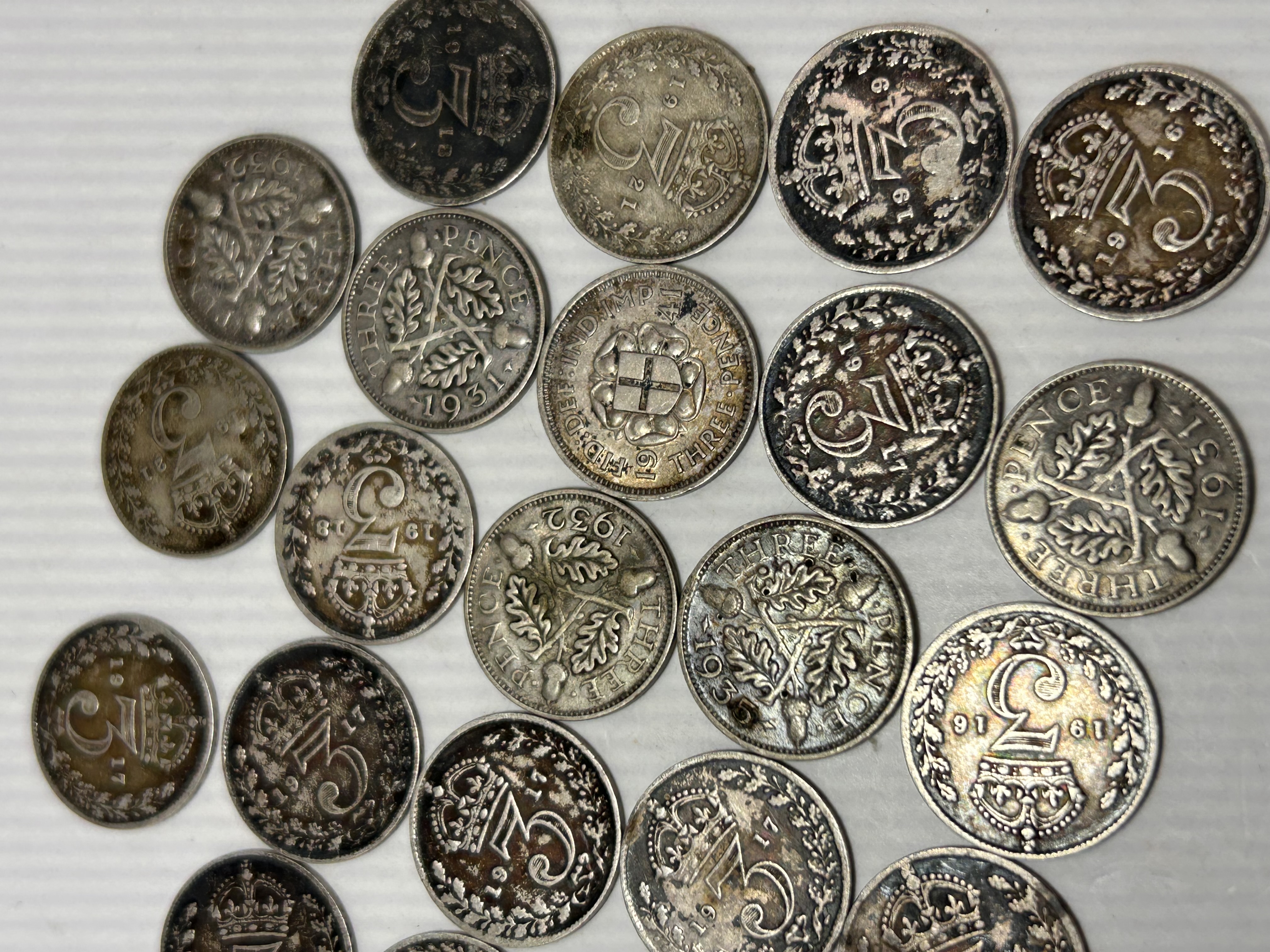 A collection of 23 circular numismatic items identified as pre-decimal British or Commonwealth silver threepence (3d) coins. The coins are struck in silver or a silver alloy, consistent with coinage standards for this denomination during the early 20th century. The collection spans the reigns of King George V and King George VI, with visible dates including 1916, 1917, 1919, 1931, and 1935. Reverses display various designs, including the large crowned numeral ‘3’, the earlier cross within a crowned shield motif, and later examples featuring oak leaves and acorns, often accompanied by the inscription ‘THREE PENCE’.