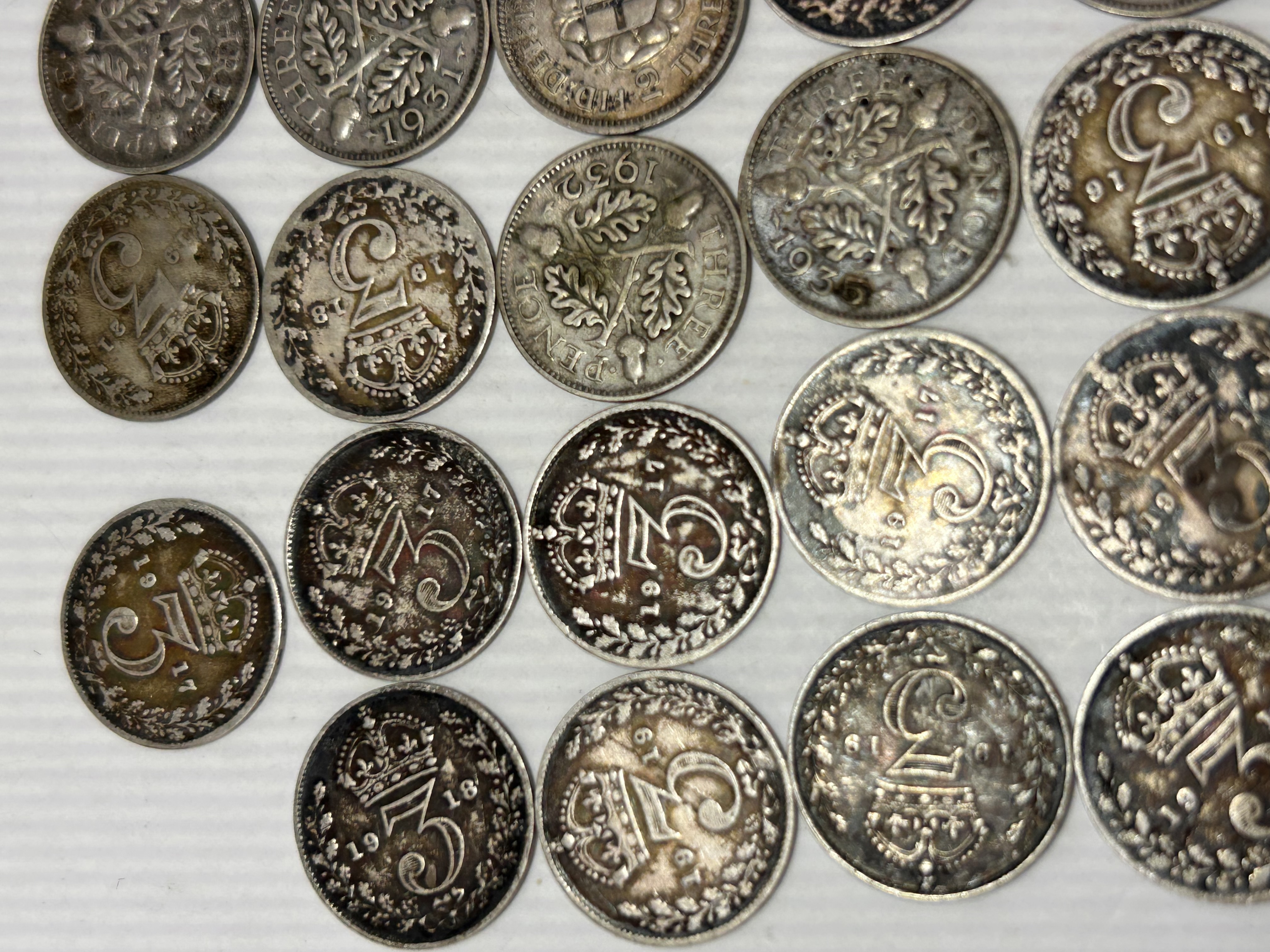 A collection of 23 circular numismatic items identified as pre-decimal British or Commonwealth silver threepence (3d) coins. The coins are struck in silver or a silver alloy, consistent with coinage standards for this denomination during the early 20th century. The collection spans the reigns of King George V and King George VI, with visible dates including 1916, 1917, 1919, 1931, and 1935. Reverses display various designs, including the large crowned numeral ‘3’, the earlier cross within a crowned shield motif, and later examples featuring oak leaves and acorns, often accompanied by the inscription ‘THREE PENCE’.