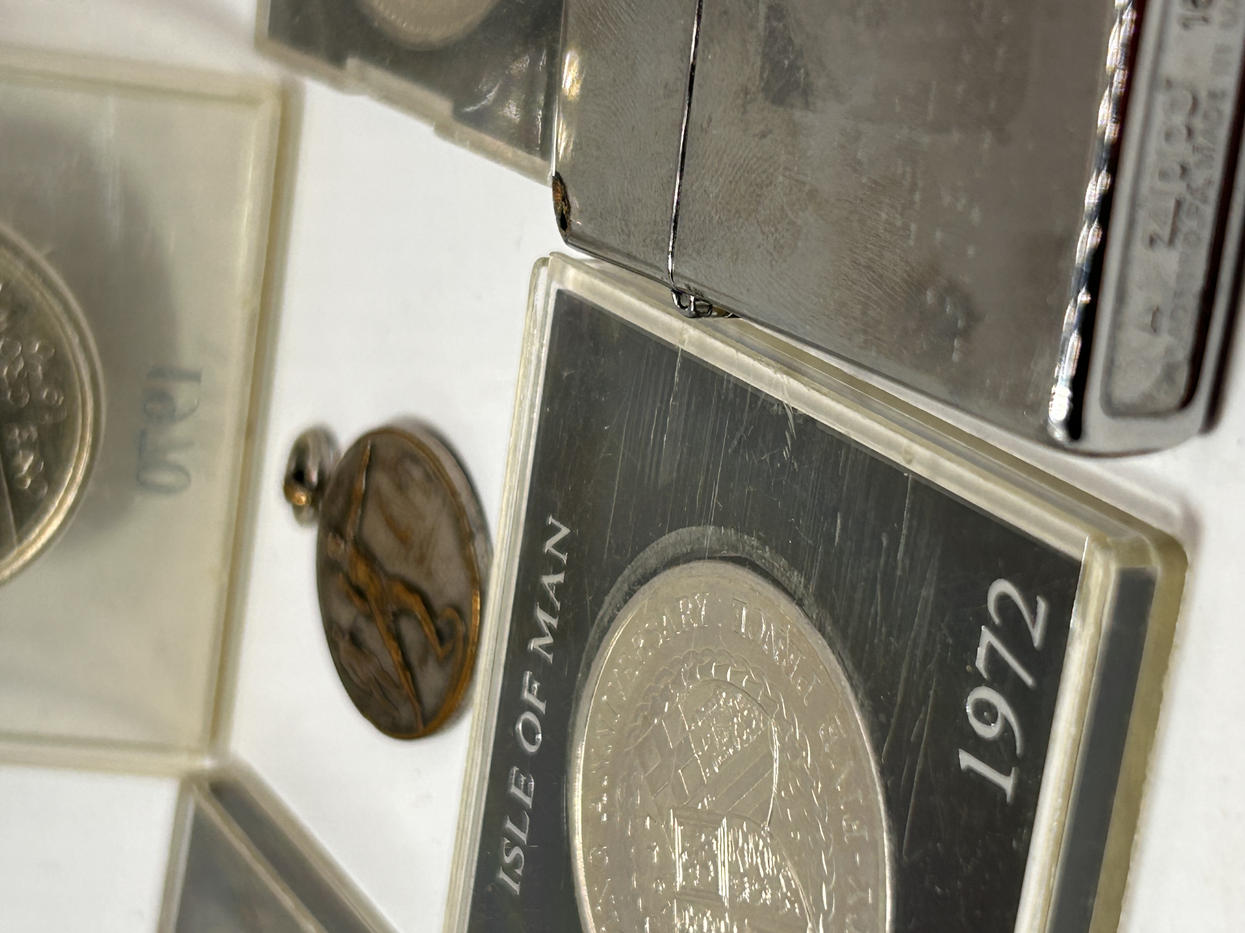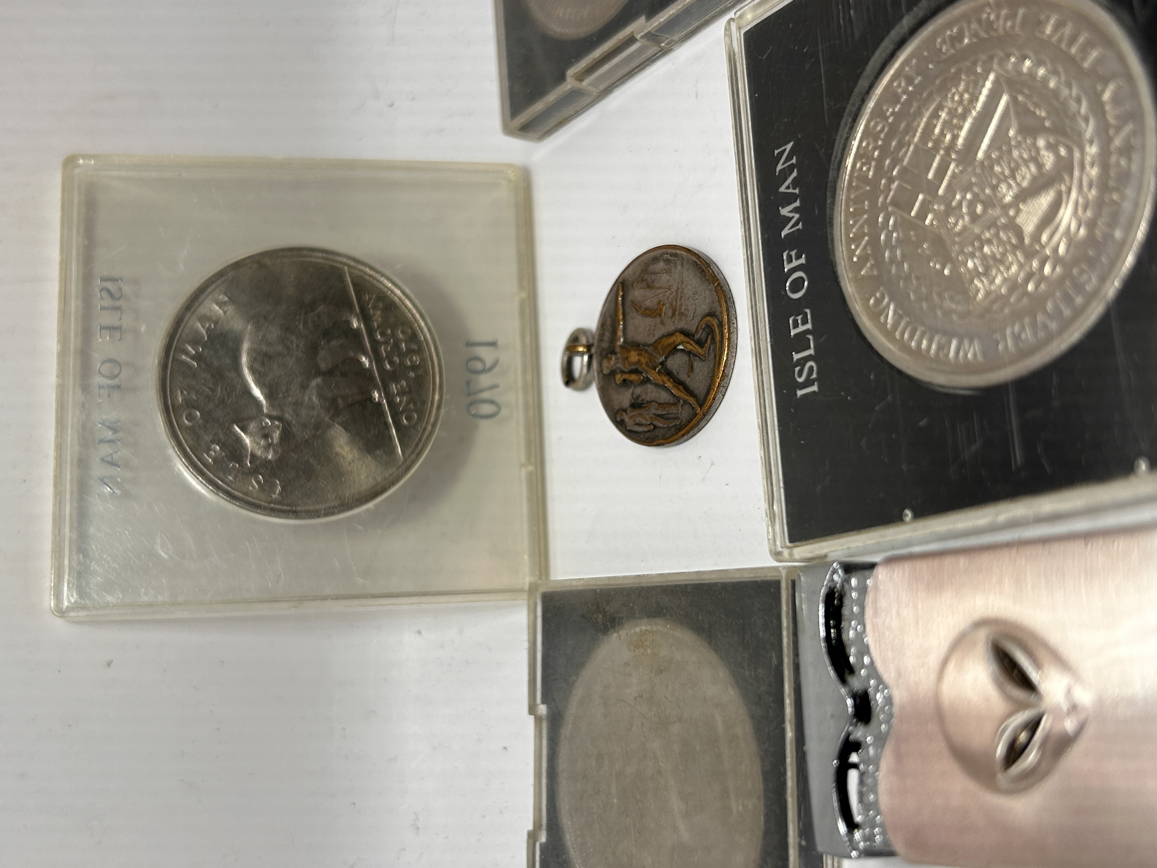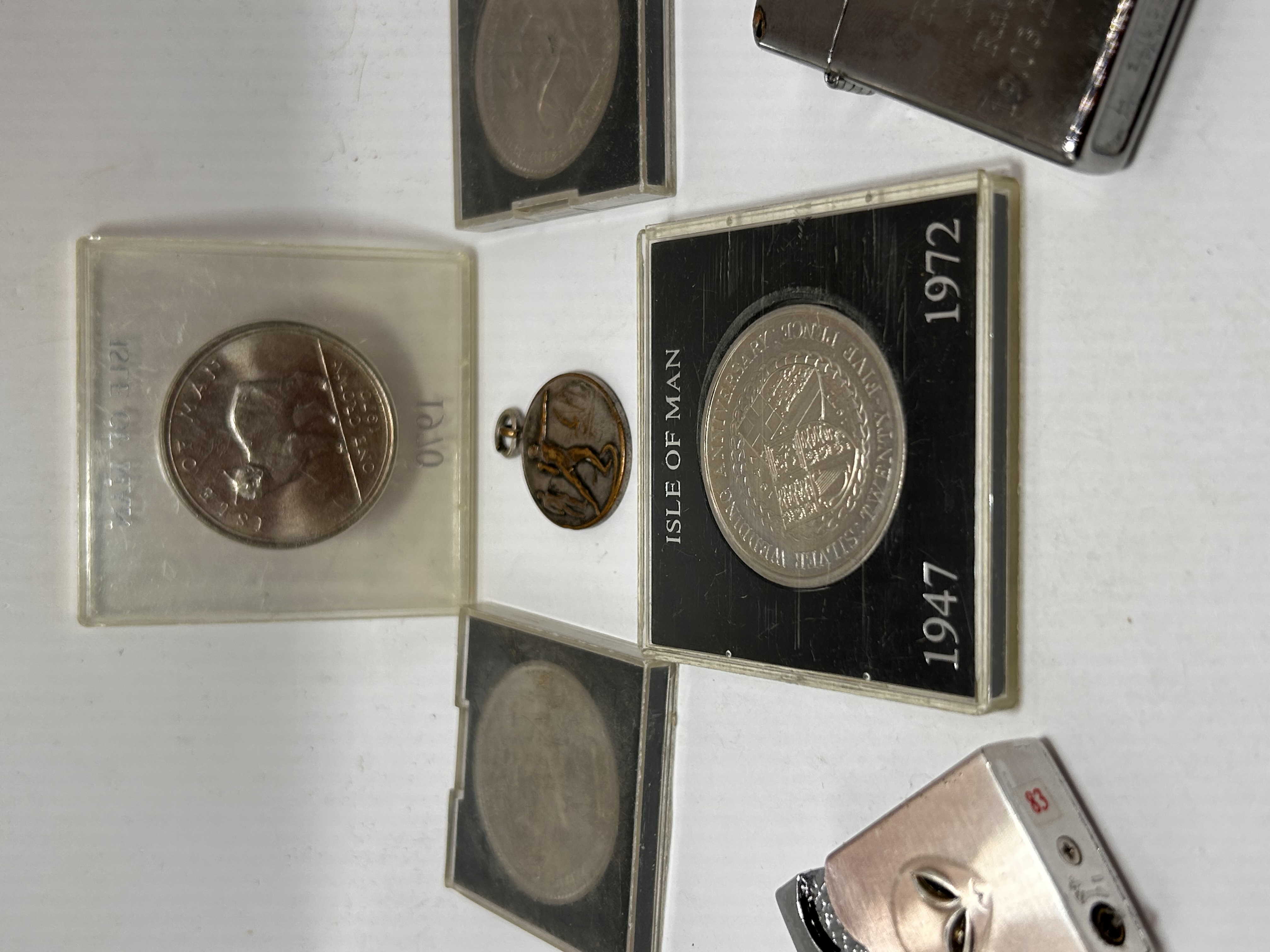 A collection of seven items consisting of cased numismatic issues and contemporary metal goods. The numismatic portion includes five items, primarily two cased Isle of Man commemorative coins. The first is a 1970 One Crown coin depicting a Manx cat, secured in a clear plastic display case. The second is a 1972 coin, identified by web consensus as the Silver Wedding Anniversary issue, marked ISLE OF MAN and TWENTY-FIVE PENCE, housed in a black plastic display case marked 1947 and 1972. Also present is a small, circular bronze-toned medal or charm fitted with a jump ring, depicting a stylized figure. Two additional black plastic coin cases are included, which appear to contain heavily obscured metallic discs. The collection also includes two contemporary metal cigarette lighters: one traditional silver-toned flip-top style lighter showing visible text suggesting the Zippo brand on the base, and one novelty lighter with a brushed metal body and copper-toned highlights, featuring a prominent raised alien head design.