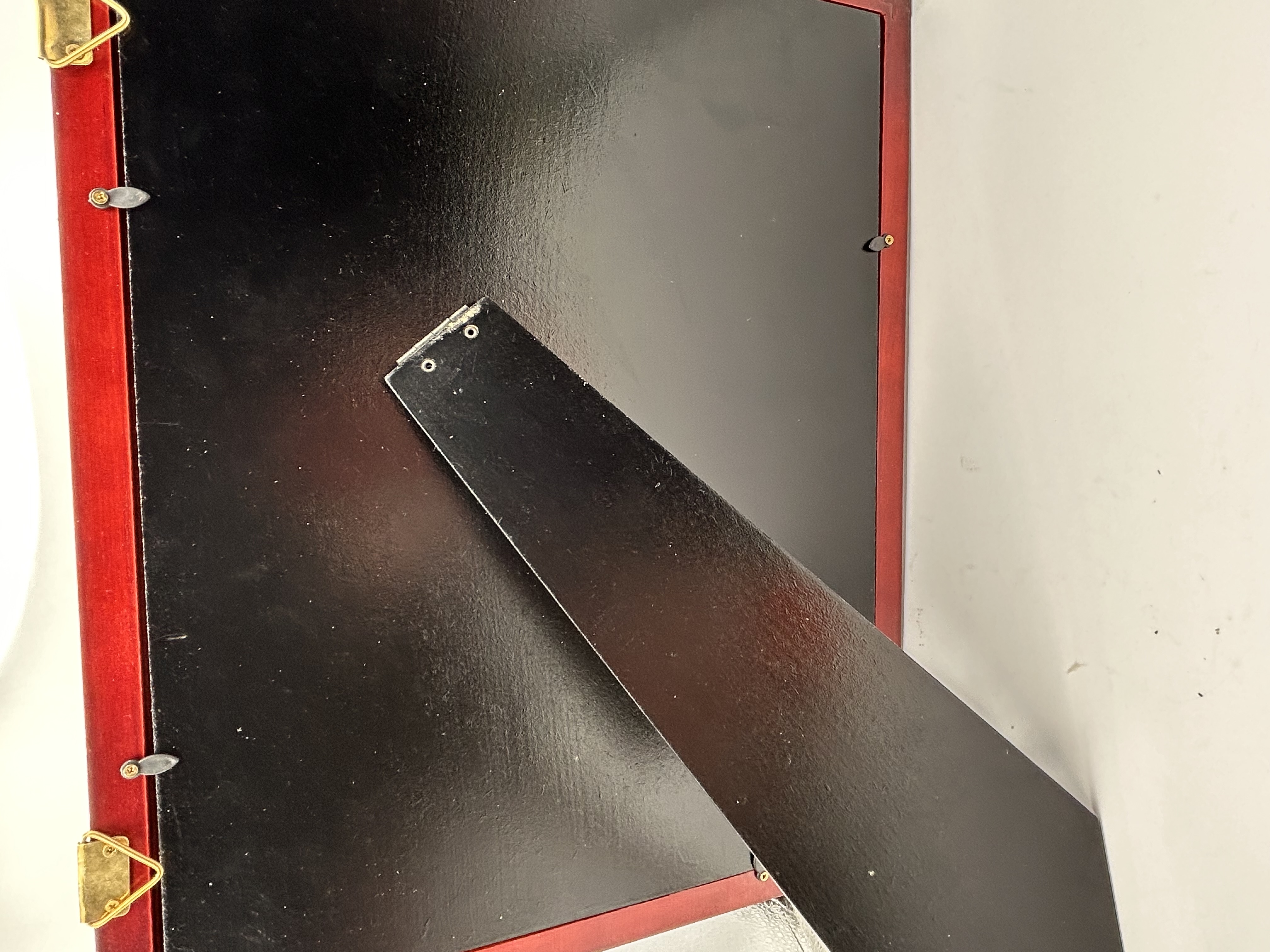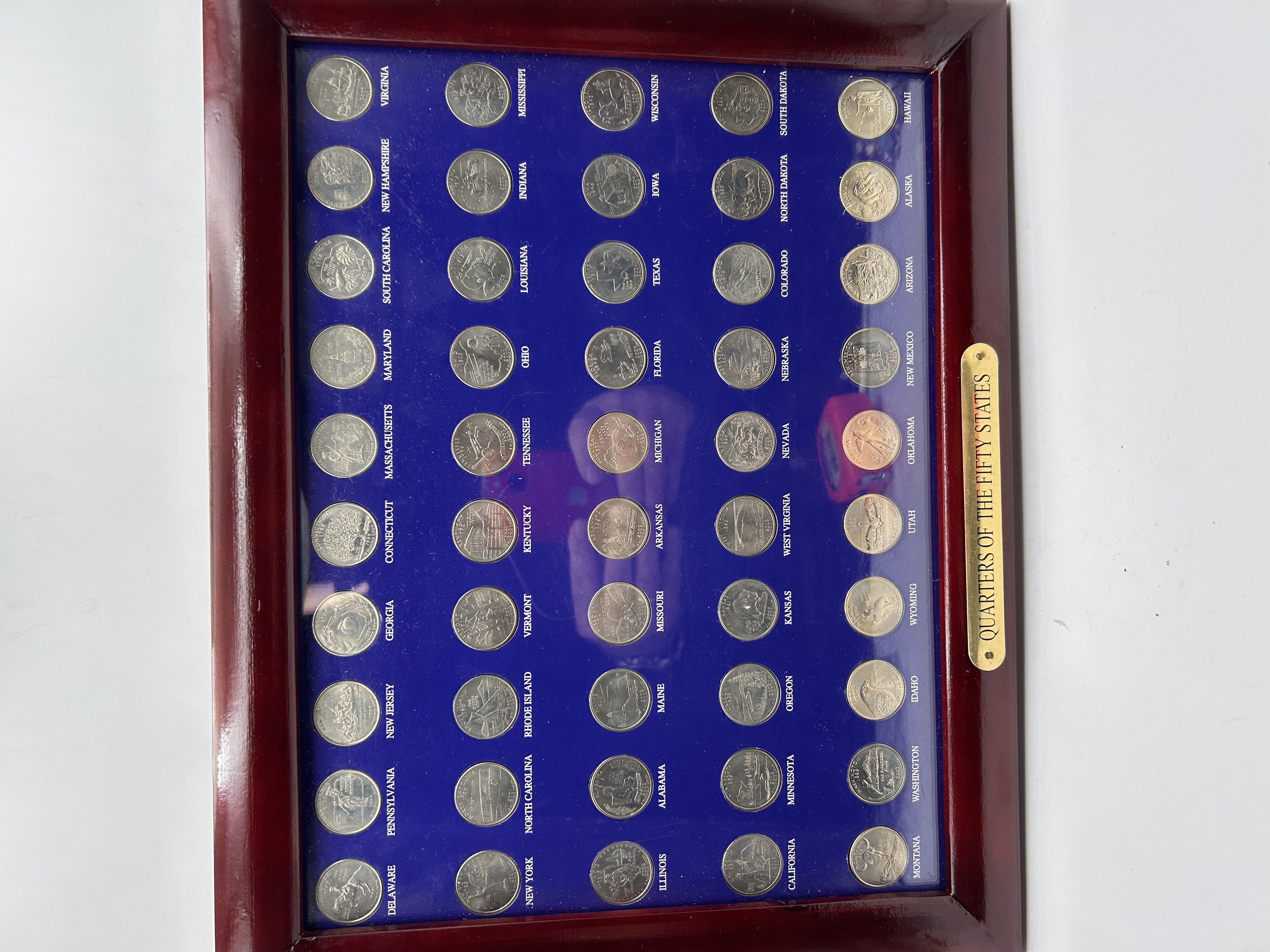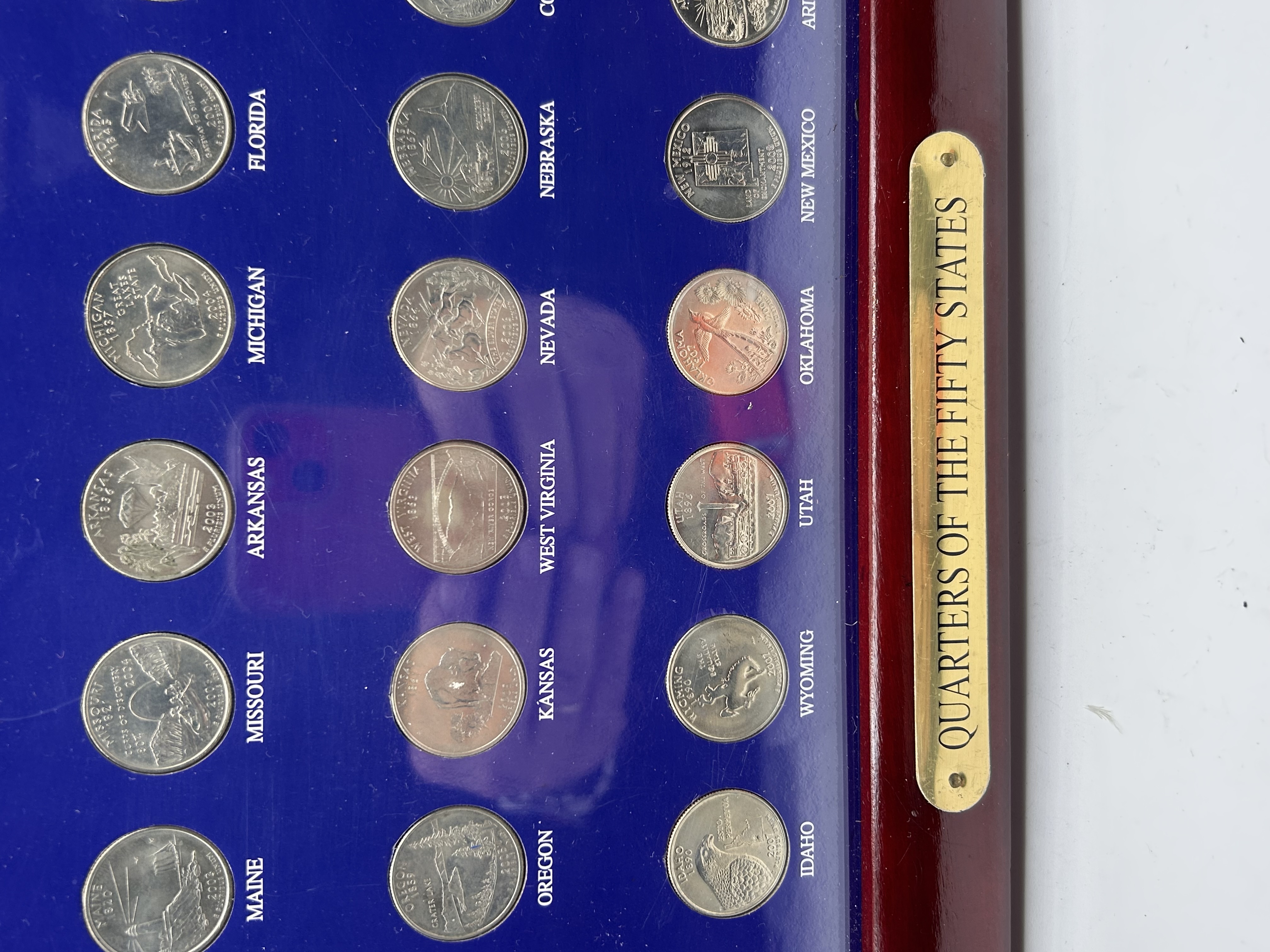 A collection of fifty (50) United States State Quarters (1999–2008) presented in a Wood Grain Collectors Showcase display frame. The collection represents the complete 50 State Quarters Program. The coins are mounted against a royal blue mat board, with each coin recessed into a circular slot labeled with the corresponding state name. The display is enclosed in a dark reddish-brown wooden frame with a transparent cover. A brass-tone plaque is affixed to the bottom center of the frame, engraved with the text QUARTERS OF THE FIFTY STATES. The 50 coins are primarily silver-toned clad examples, consistent with standard circulation issues. The coin positioned for Oklahoma exhibits distinct copper/gold toning or coloration, suggesting it may be a proof or specially toned example. The reverse features a hinged black cardboard easel stand and gold-toned metal hardware for display.