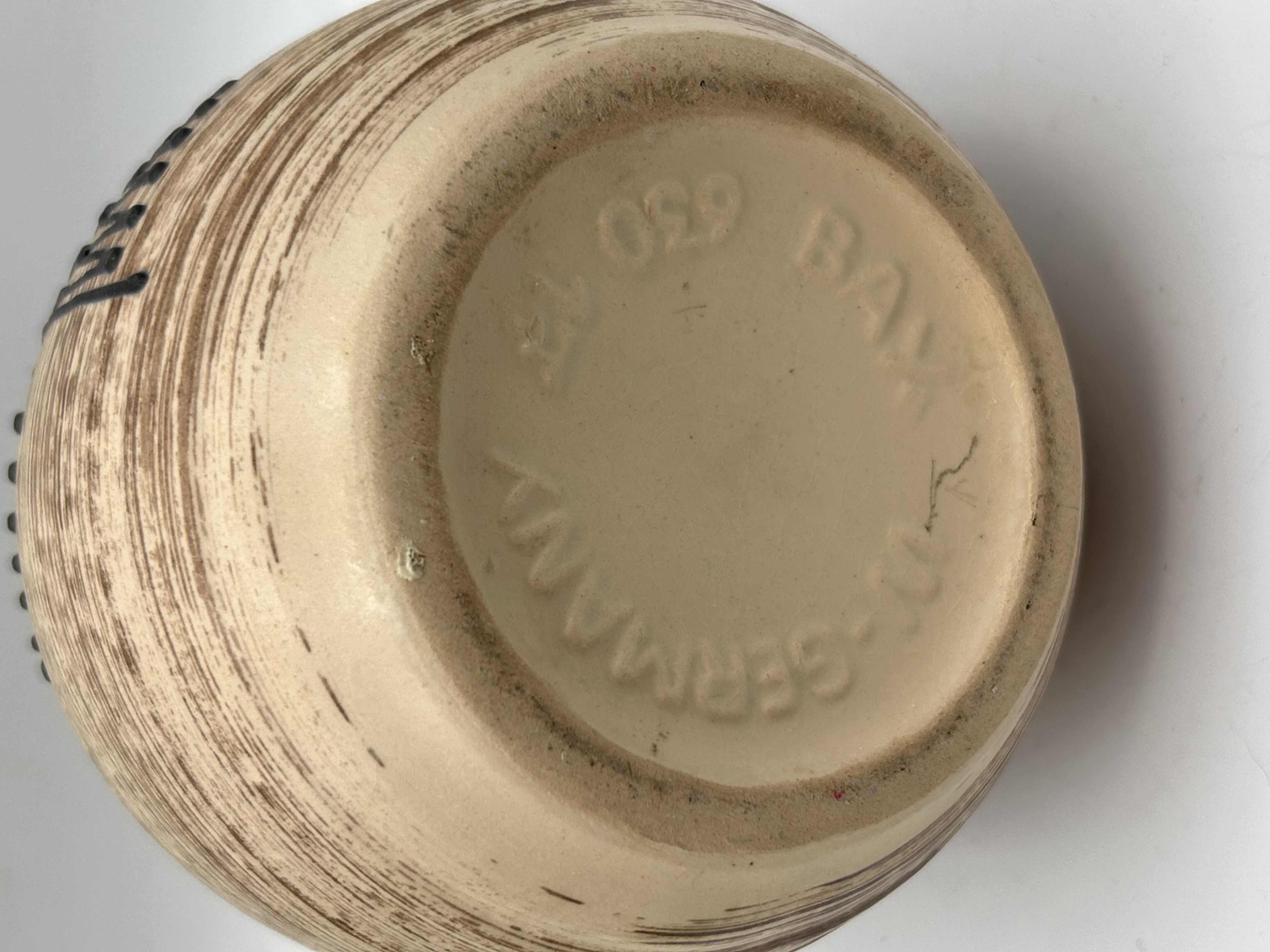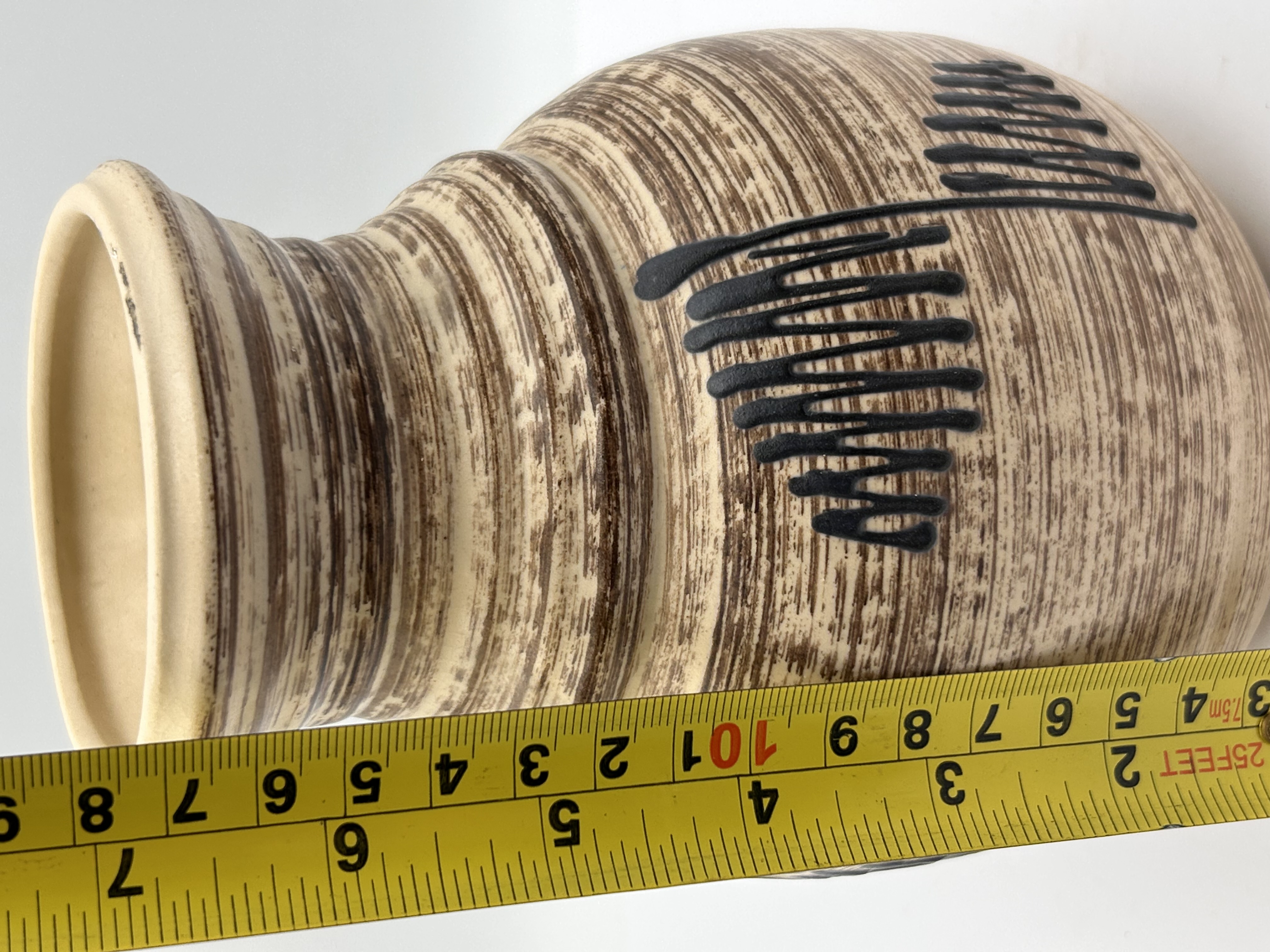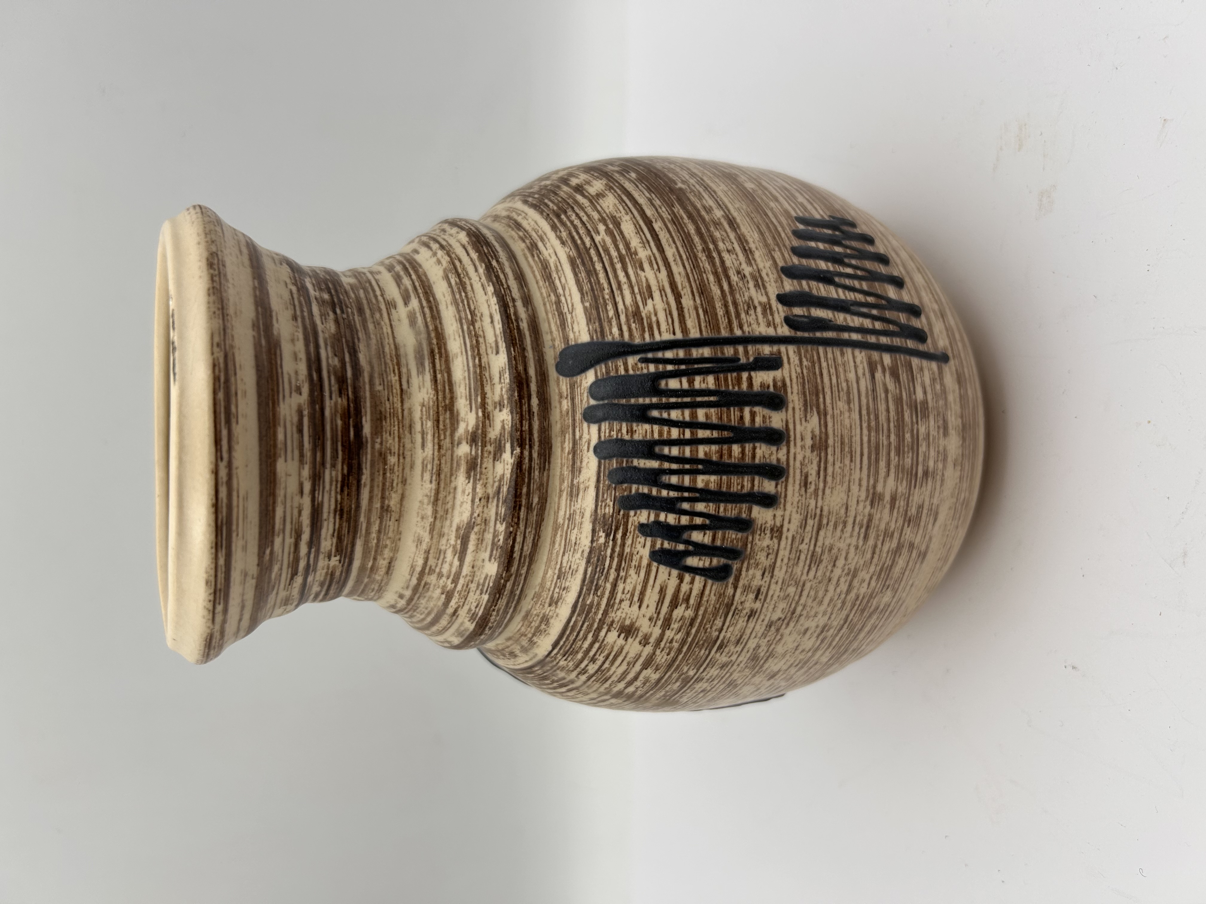 A single ceramic vase attributed to Bay Keramik, West German Pottery (WGP). The vase features a globular body rising to a flared neck. The exterior is finished with a speckled beige and dark brown streaked glaze, creating a horizontal banded texture consistent with mid-century modern design. This base glaze is overlaid with thick, glossy black abstract motifs consisting of dashes and drip patterns. The underside of the base bears impressed markings reading BAY, GERMANY, and the model number 650 (followed by obscured numbers).