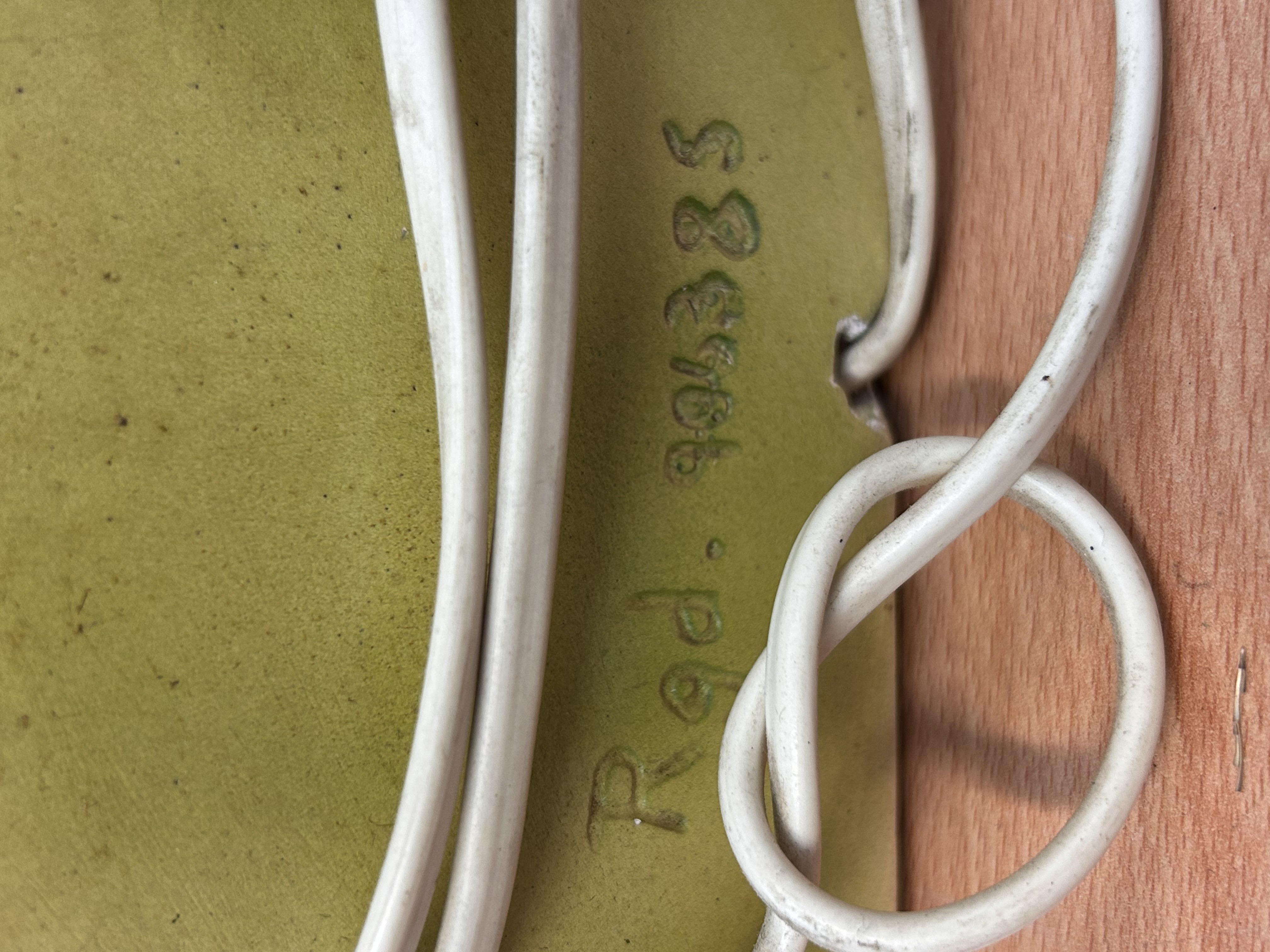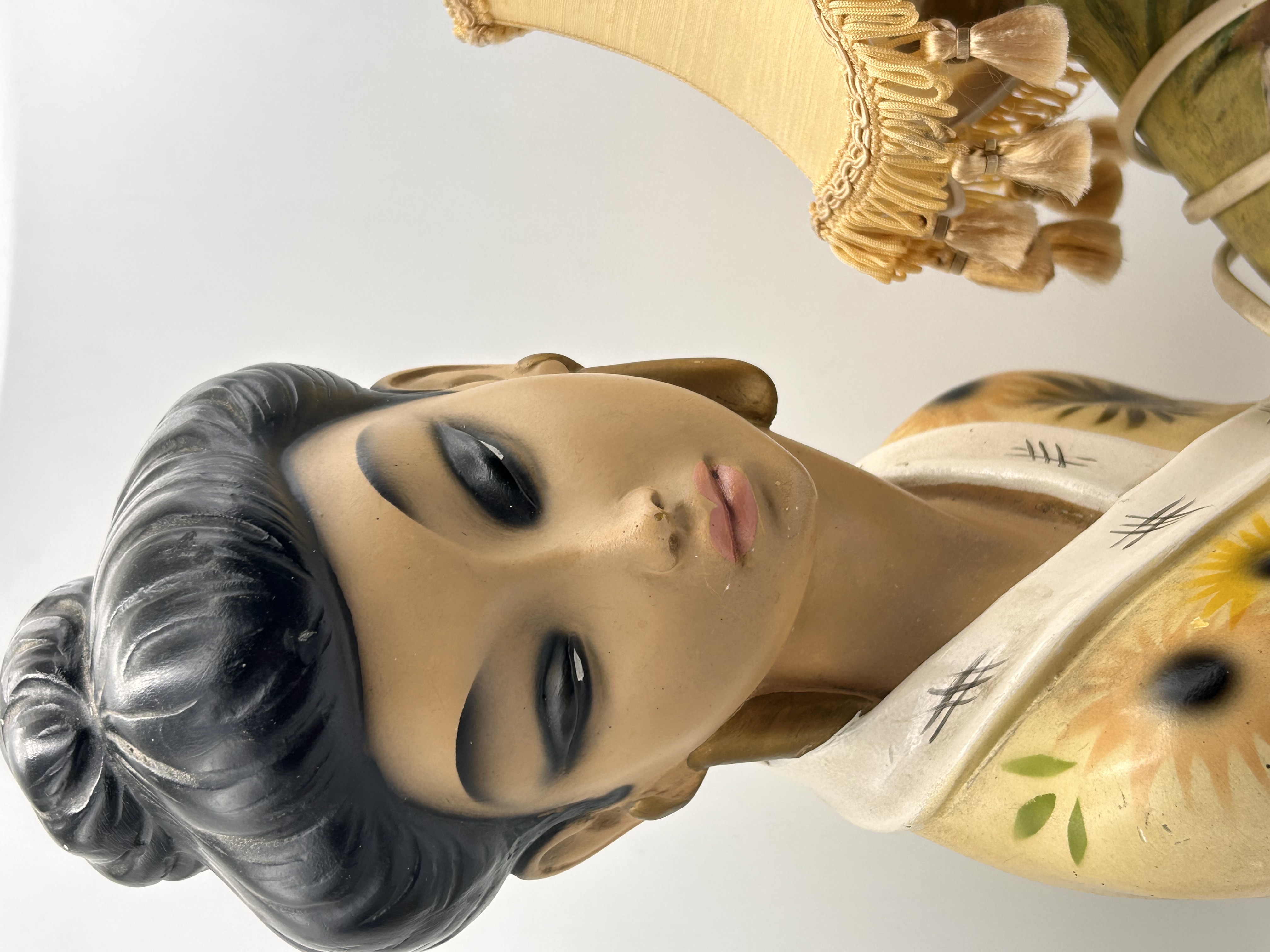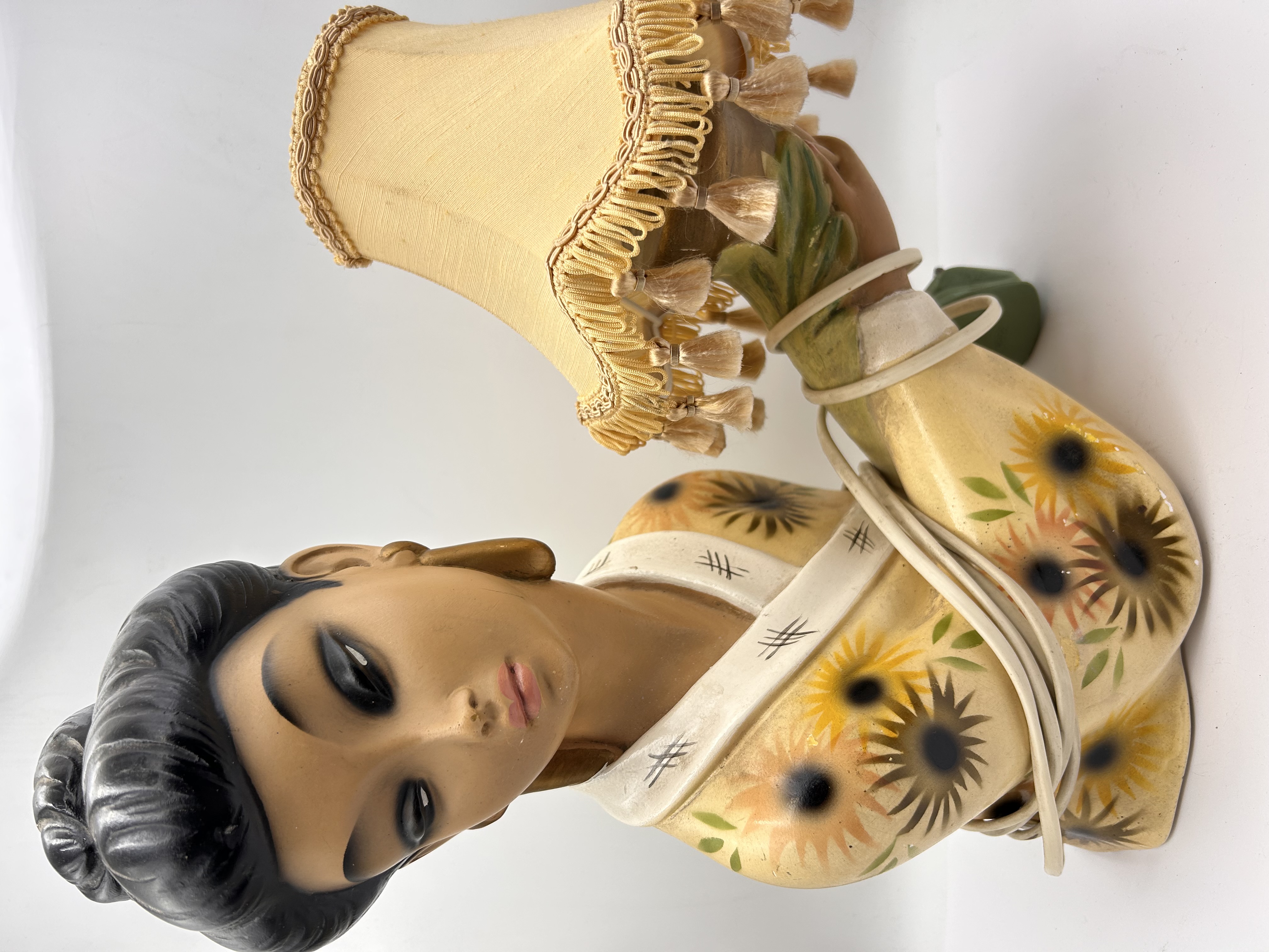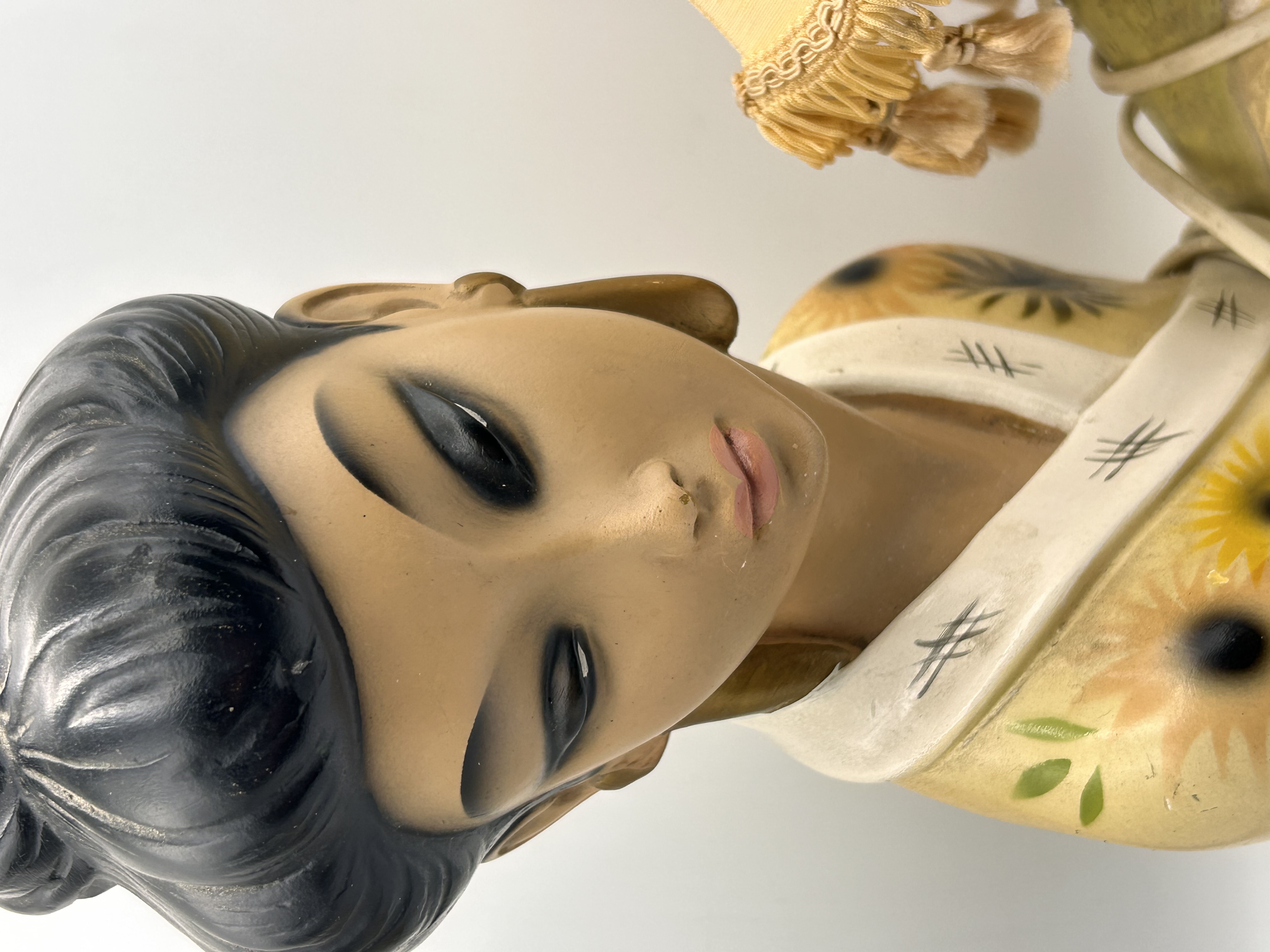 A single figural table lamp executed in painted chalkware or plaster, dating to the Mid-Century period, circa 1950s, reflecting the popular Orientalist Kitsch aesthetic. The lamp is modeled as the bust of a female figure, featuring a dramatic black updo, heavy black eye makeup, and large earrings. She is dressed in a yellow kimono decorated with bold black and yellow sunflower-like floral motifs. The figure holds a small, drum-shaped textile lampshade finished with yellow tassel fringe trim. A white electrical cord is wrapped around the figure’s body. The underside of the chartreuse green base bears the incised registration marking: Reg. 994385.