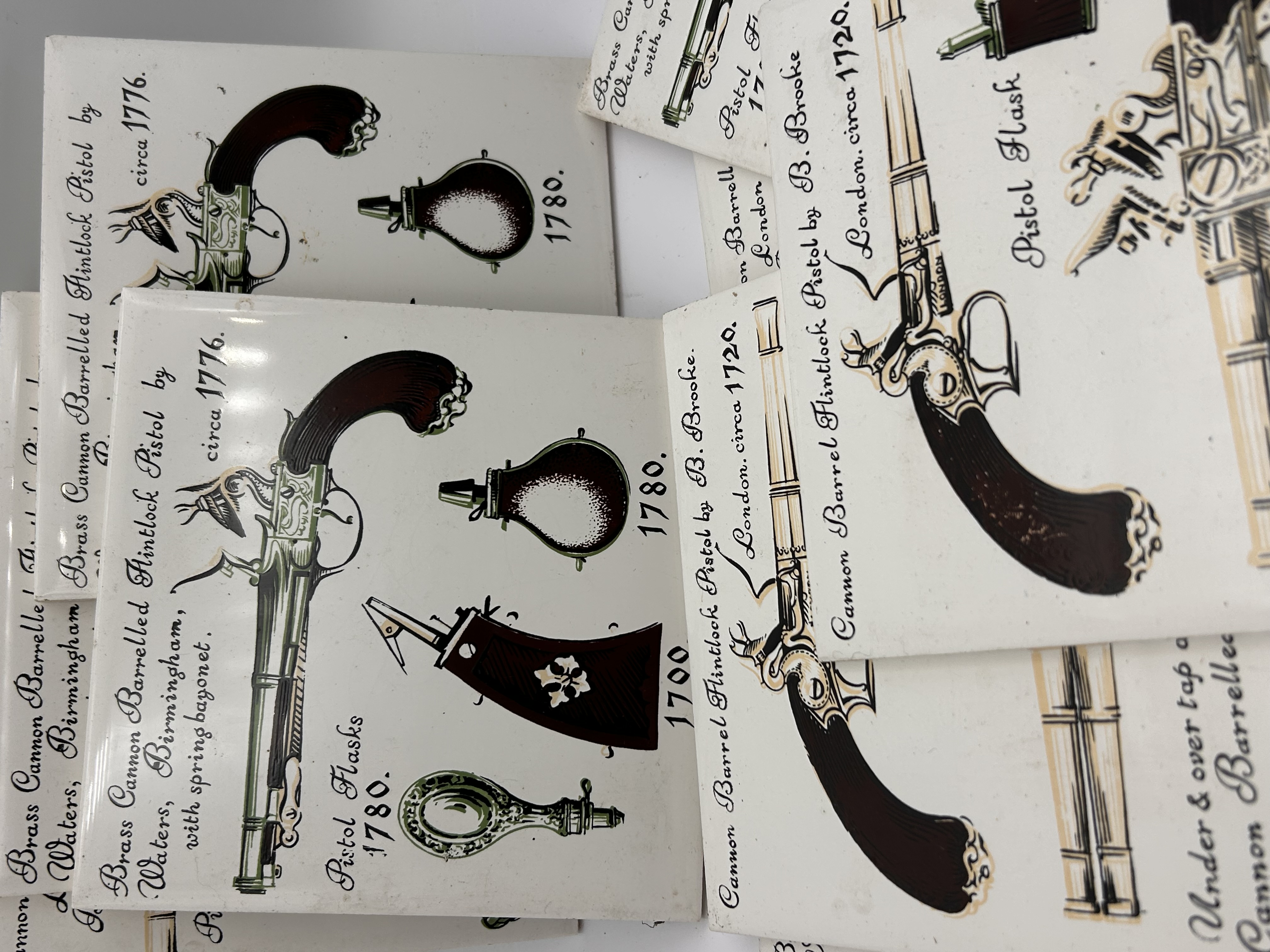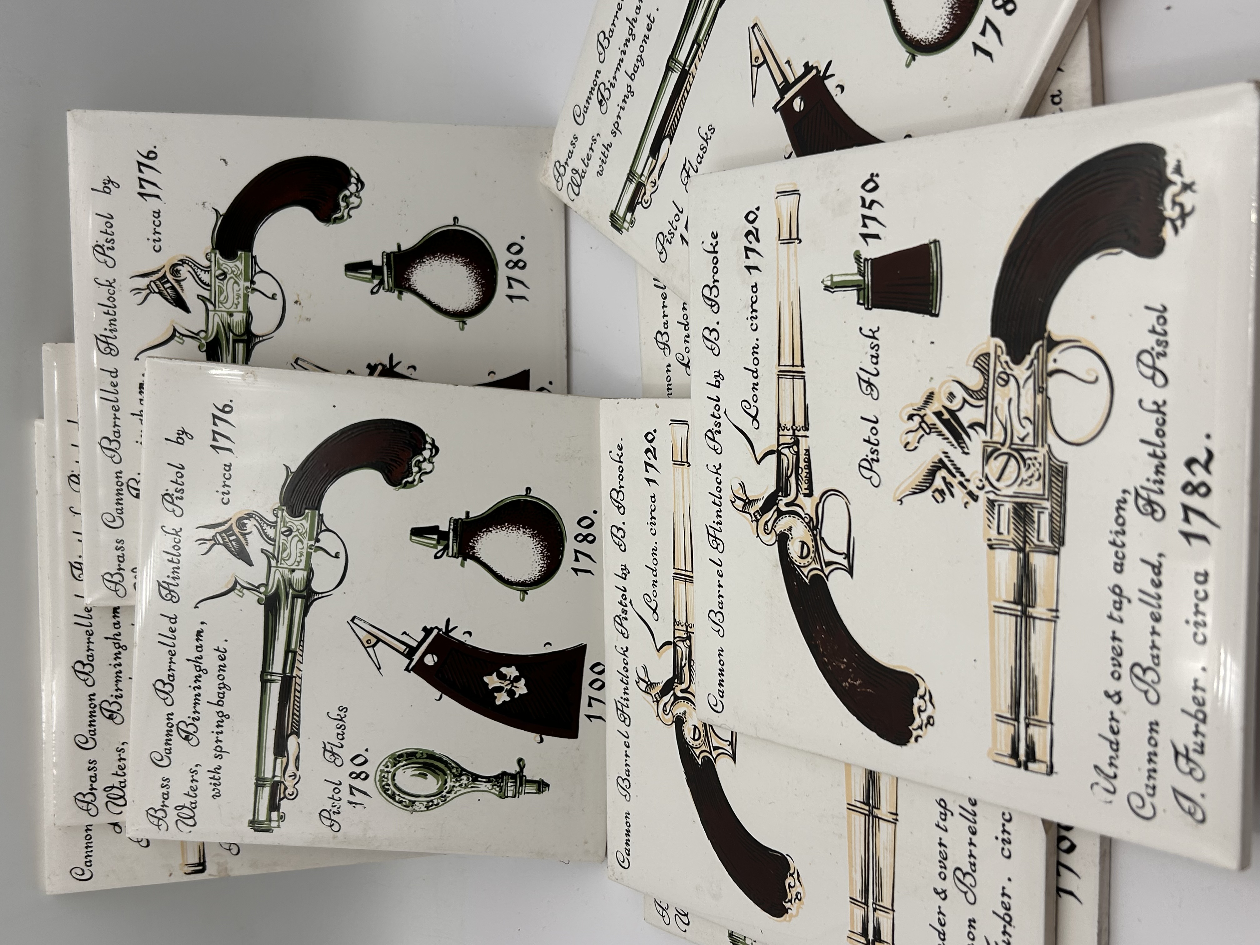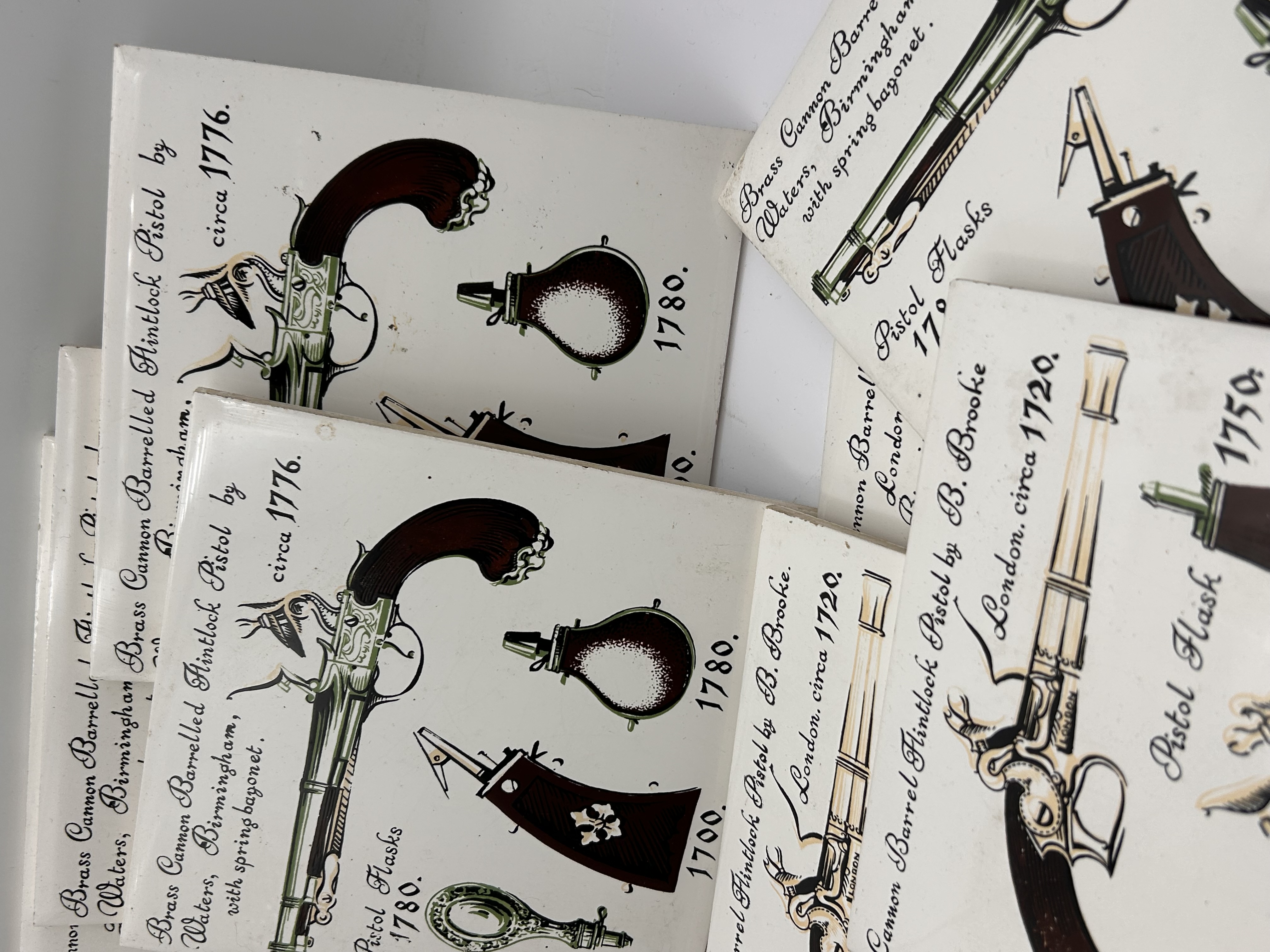 A collection of nine square decorative items, likely ceramic tiles or hardboard coasters, featuring transfer-printed illustrations of historical British firearms and accoutrements. Each item measures 6×6 inches. The decoration is executed on a glossy white ground, utilizing black, gold, and reddish-brown pigments to depict various flintlock pistol models, including cannon-barrelled and spring-bayonet types, alongside corresponding pistol flasks. Extensive black script text identifies the illustrated objects, specifying makers such as Waters of Birmingham, B. Brooke of London, and J. Furber, and dating the pieces approximately between circa 1700 and 1782. The items are suitable for decorative or functional use.