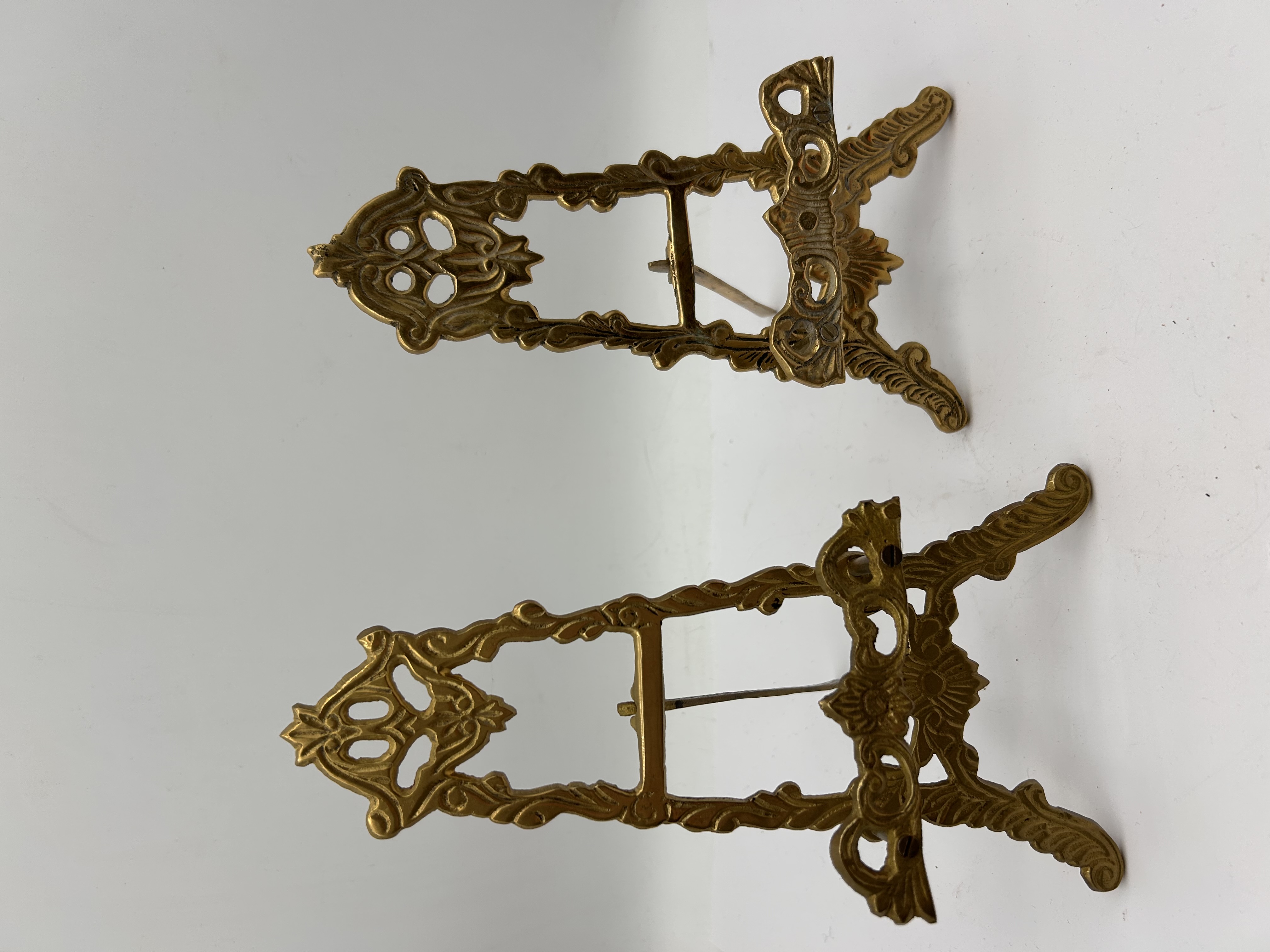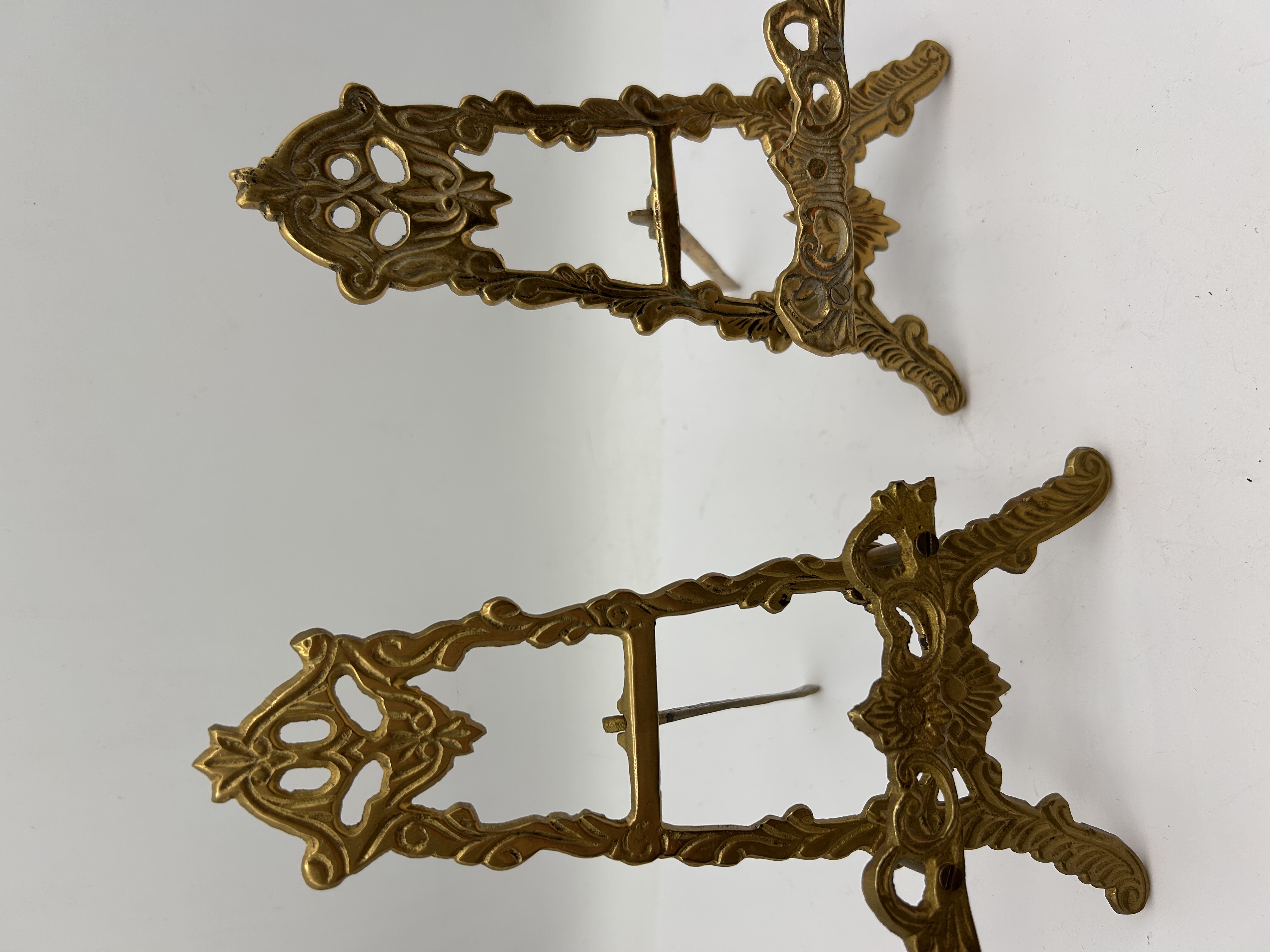 A pair of miniature display easels crafted from cast brass or brass-toned metal. The easels feature a highly decorative, pierced design characteristic of Rococo Revival or Victorian styles. The ornamentation includes scrolling foliate motifs, lobed arches, and scrolled feet. Each easel is constructed with a folding back strut designed to provide stability for displaying small plates, photographs, or miniature artworks. No visible manufacturer’s marks, stamps, or inscriptions are present on either piece.