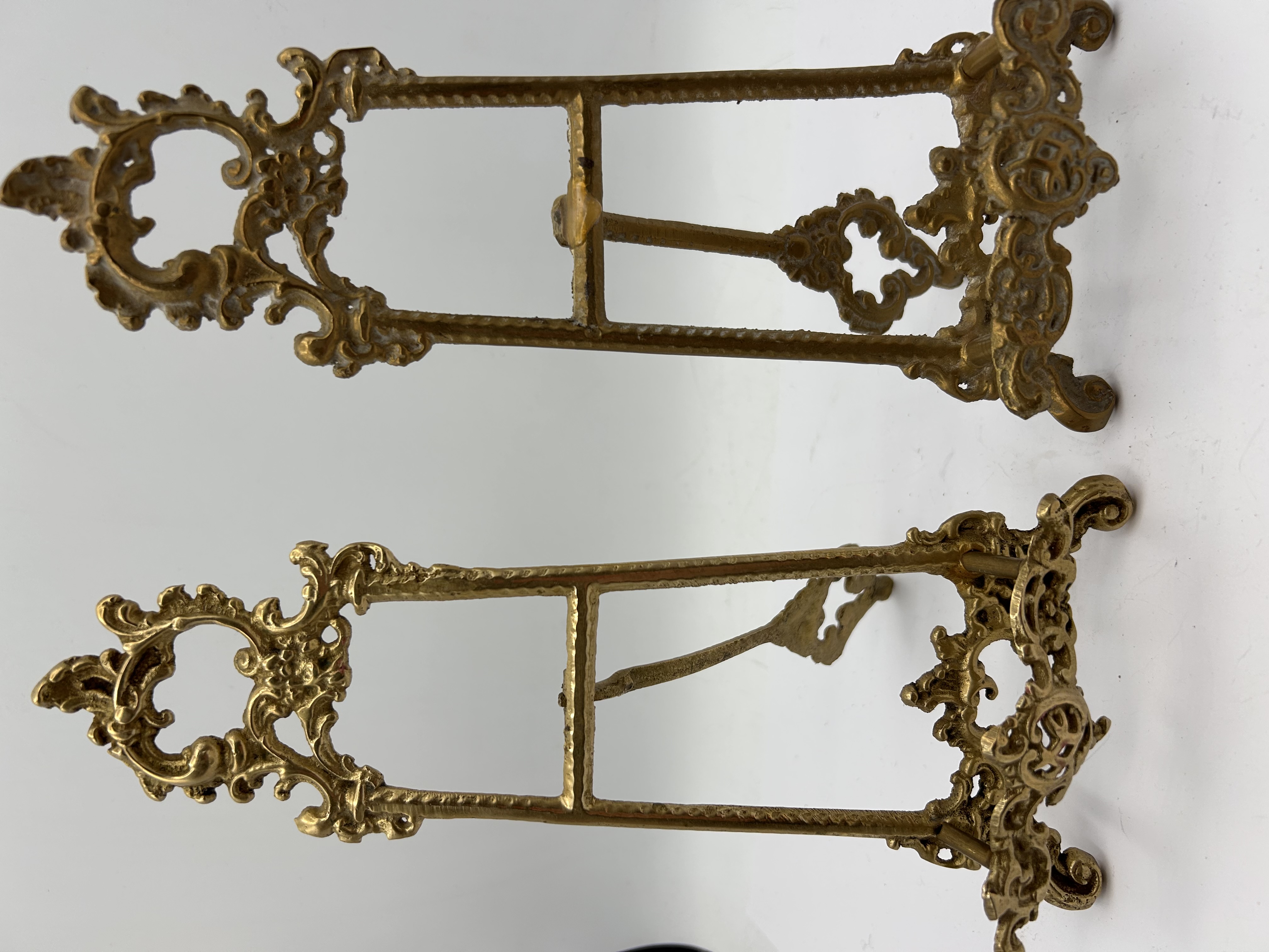 A pair of miniature decorative display easels, likely cast from brass or a gilt-finished base metal, consistent with Mid 20th Century Victorian Revival style production. Each easel features an ornate design characterized by heavy scrolling, pierced floral, and foliate motifs decorating the finials and the arched bases. The easels are designed for tabletop use, utilizing a hinged rear support leg for stability. They are intended for displaying small photographs, plates, or artwork. No manufacturer’s markings or inscriptions are discernible.