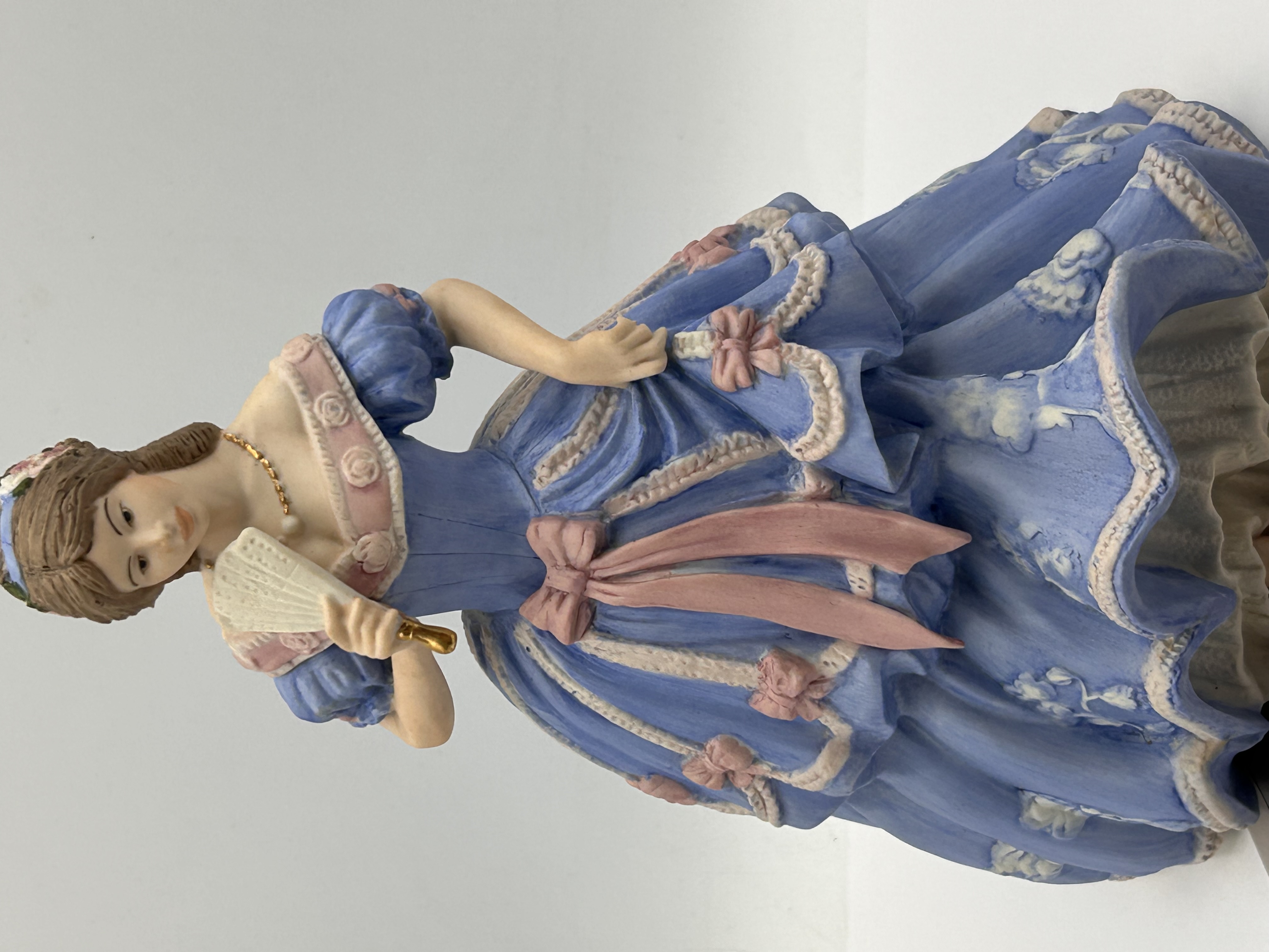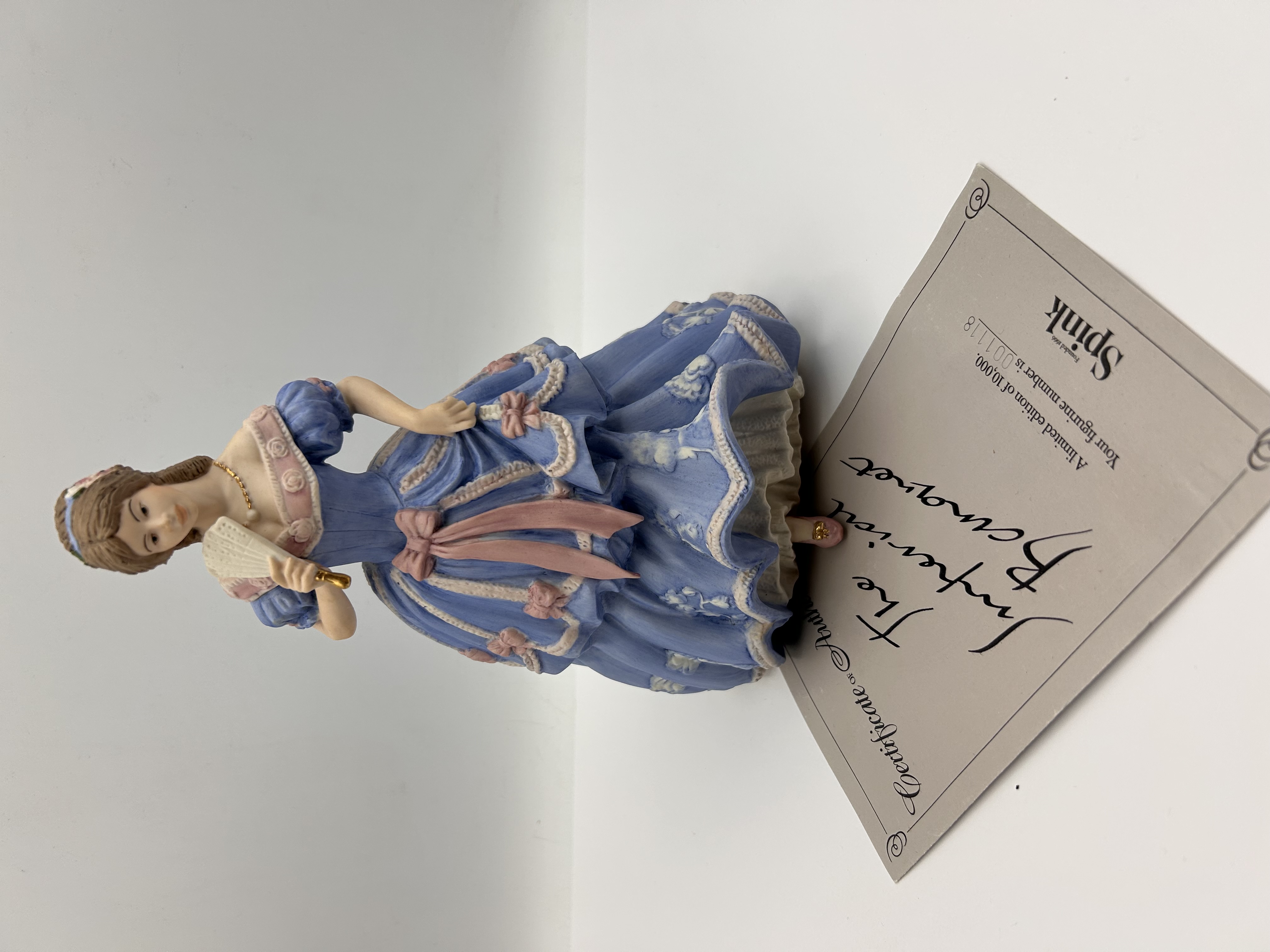 A lot consisting of two items: a hand-painted porcelain or resin figurine and its associated paper certificate. The figurine is identified through market consensus as Wedgwood’s ‘The Imperial Banquet,’ commissioned by Spink. The figure depicts a standing woman dressed in a historical-style blue ballgown, accented with pink sashes and ribbons, and featuring white relief ornamentation. She holds a cream-colored fan. The accompanying paper certificate, titled “The Imperial Banquet,” confirms the manufacturer as Spink and notes that the figurine is part of a limited edition of 10,000. The specific figurine number recorded on the certificate is 101/18.