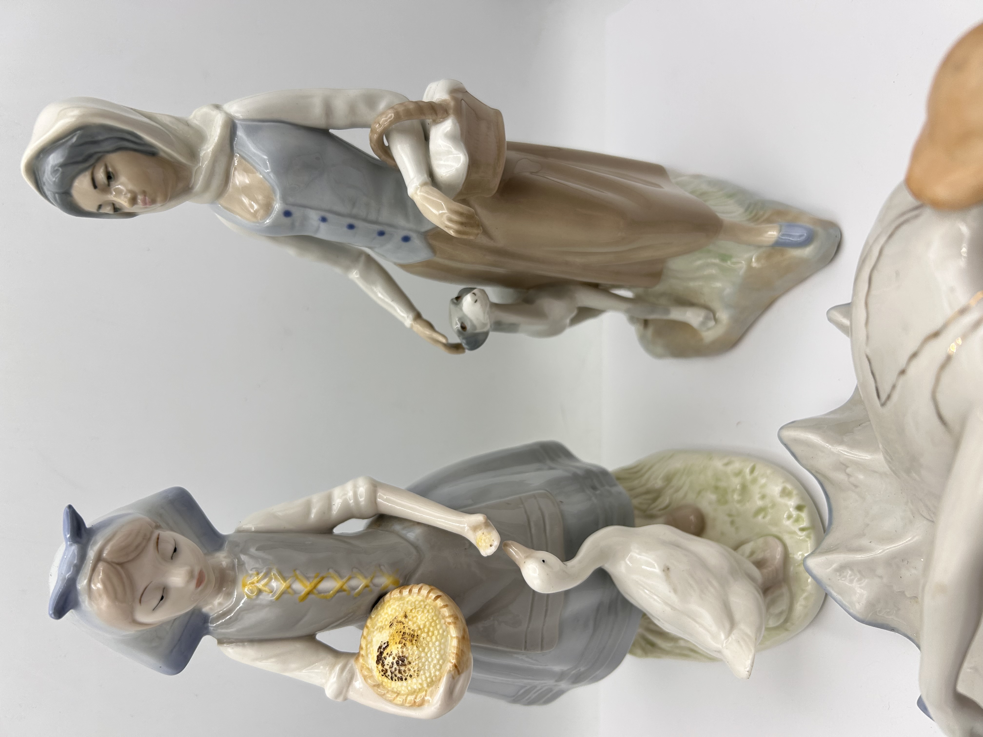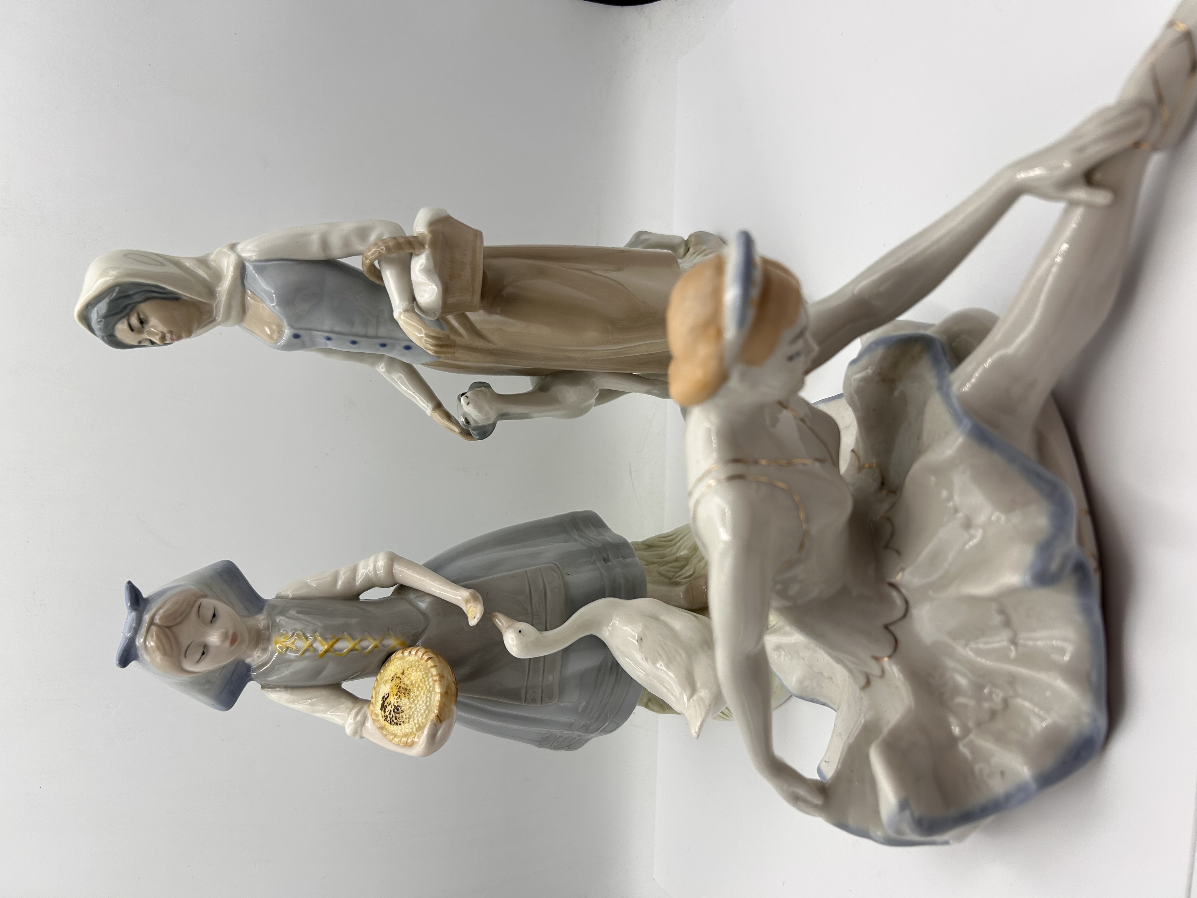 A collection of three glazed porcelain figures attributed to Lladro. The group consists of two standing pastoral figures and one reclining ballerina figure. The figures utilize a soft color palette composed primarily of muted blues, browns, and whites. The standing figure on the left depicts a woman in traditional dress holding a basket and standing beside a white goose. The standing figure on the right depicts a woman holding a basket and standing with a small white dog. The third figure, a ballerina, is seated in a reclining pose, wearing a white tutu trimmed with blue and accented with gold details.