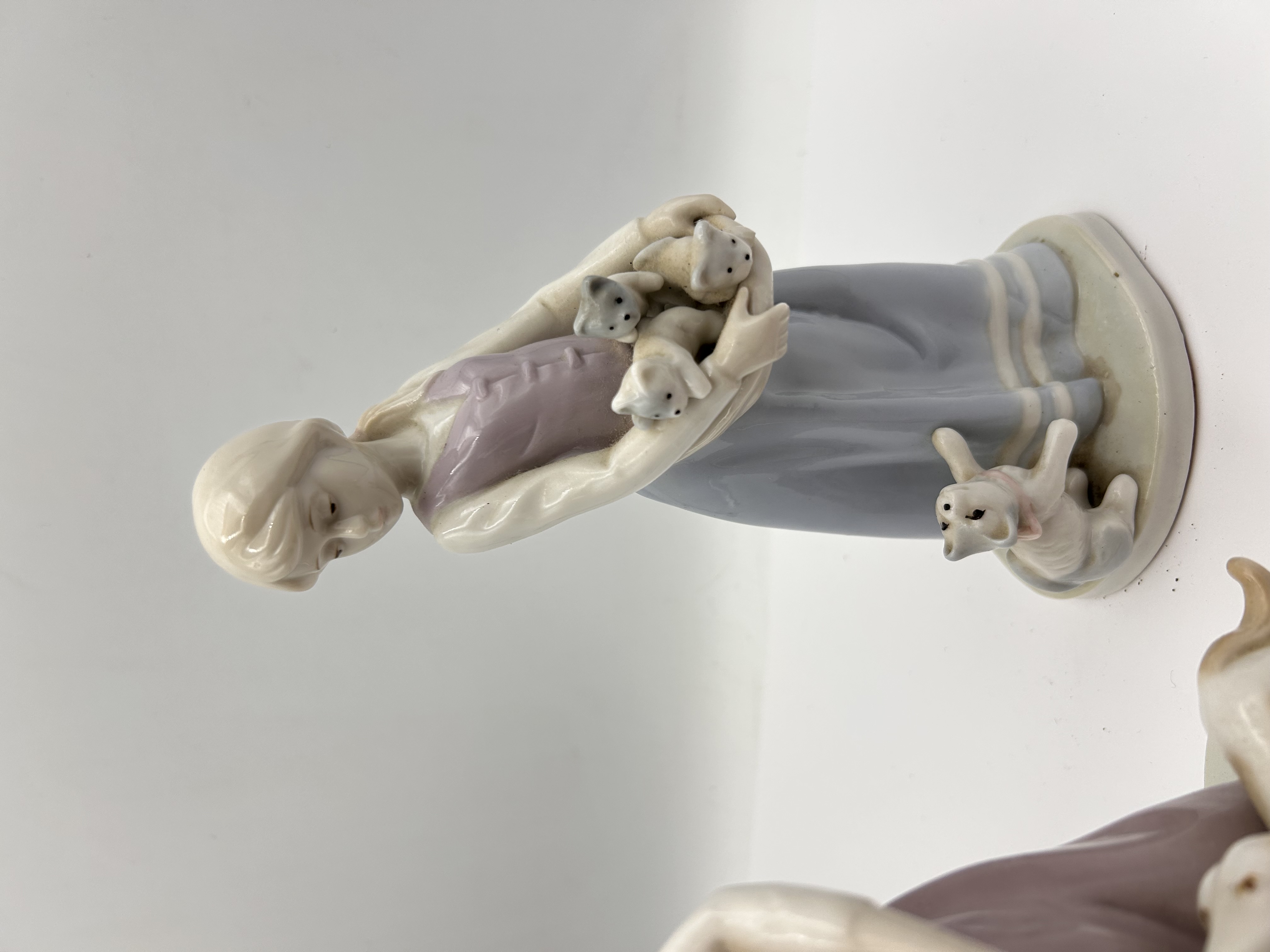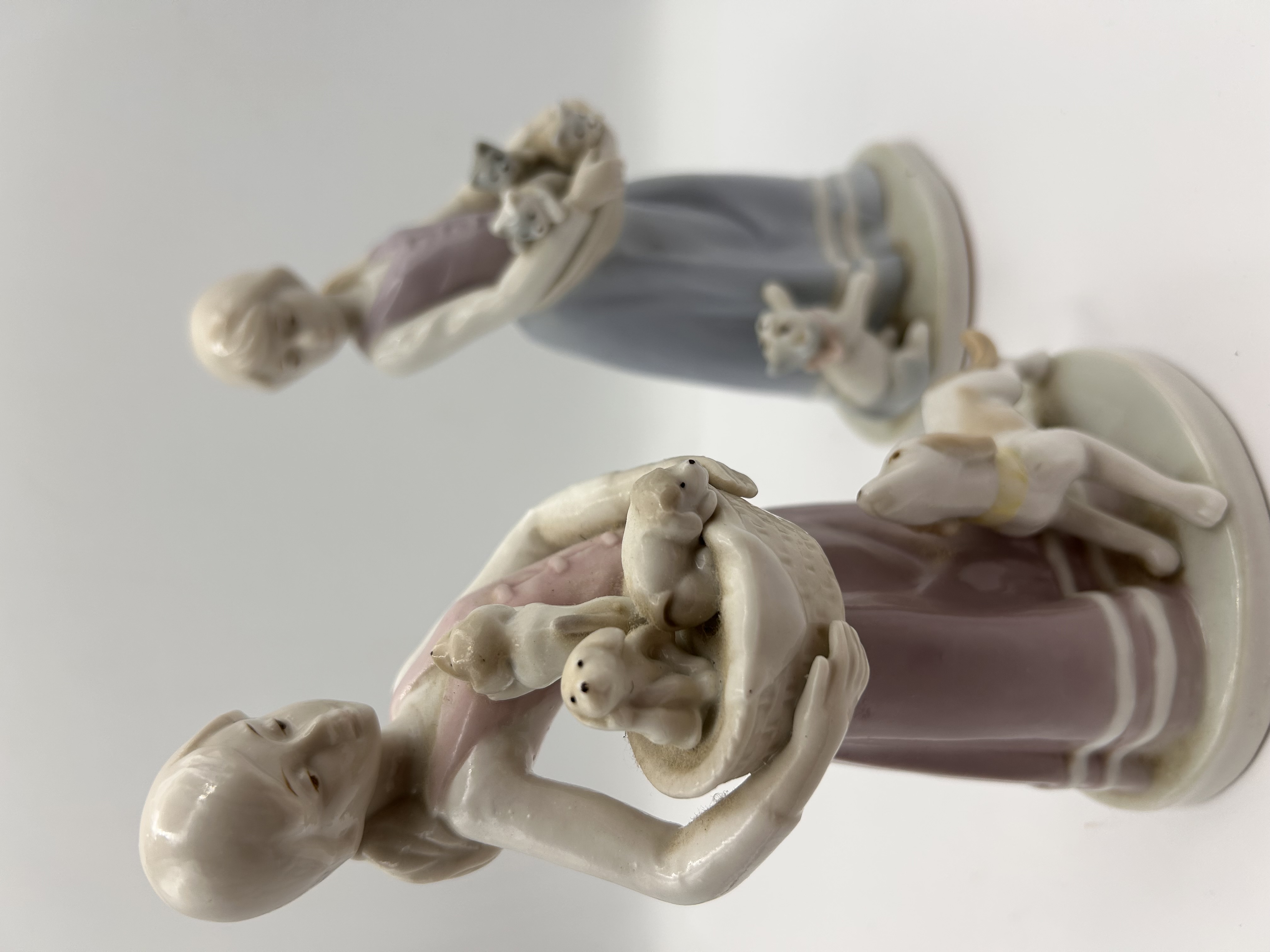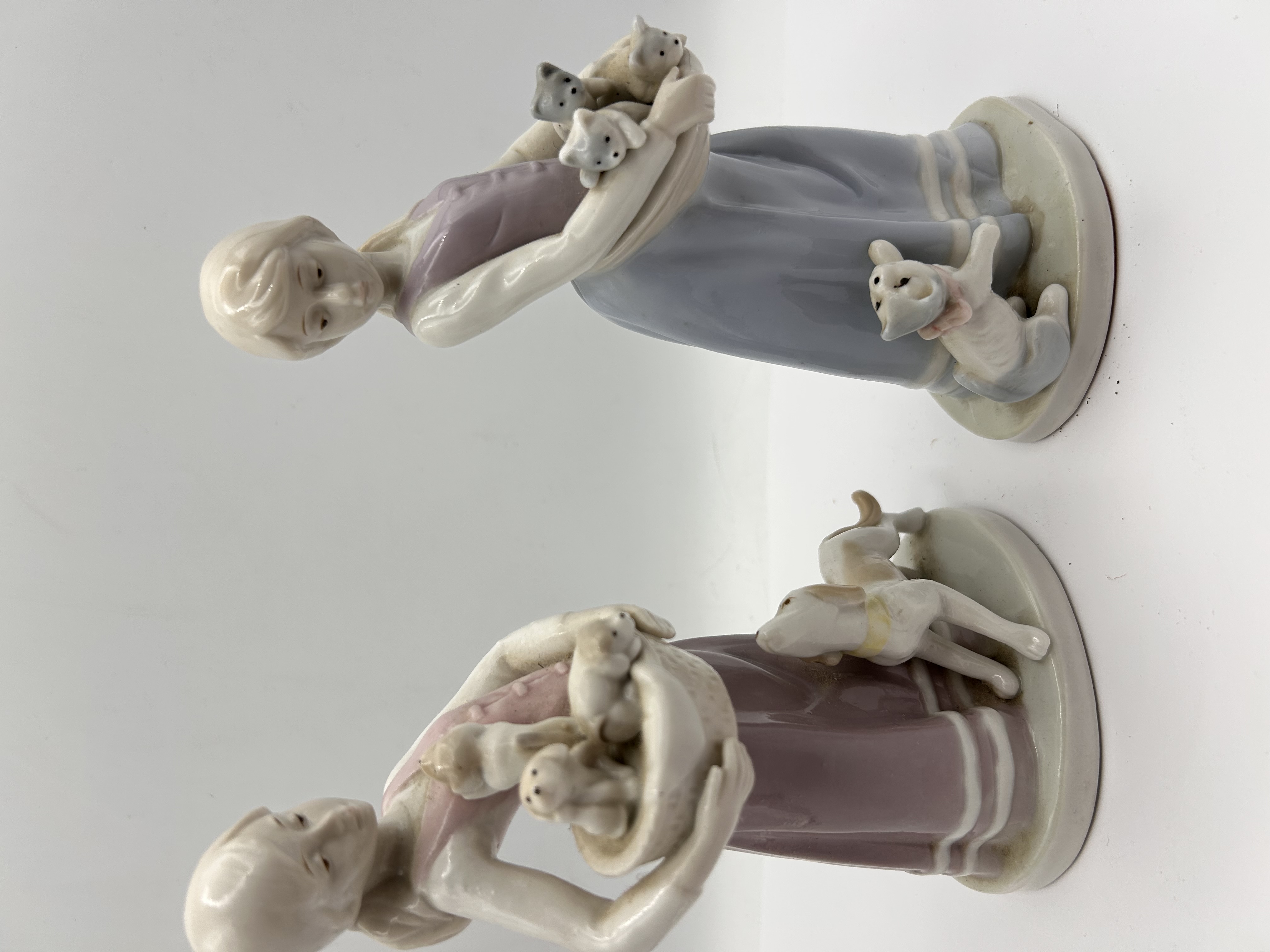 A pair of glazed porcelain figural groupings attributed to Lladro,?? modeled in a sentimental 20th-century style. The first figurine depicts a young girl wearing a long mauve and pink sleeveless dress, holding a basket containing four puppies, and accompanied by a small tan and white puppy standing at her feet. The second figurine features a young girl wearing a dusty blue and purple sleeveless dress, holding a basket containing three kittens, with a small gray and white kitten sitting near her feet. Both pieces utilize a soft pastel color palette and stand on separate, integrated oval bases. The style is consistent with the Lladro “Friends Forever” or “Best of Friends” series. No manufacturer markings or text are visibly discernible in the images.