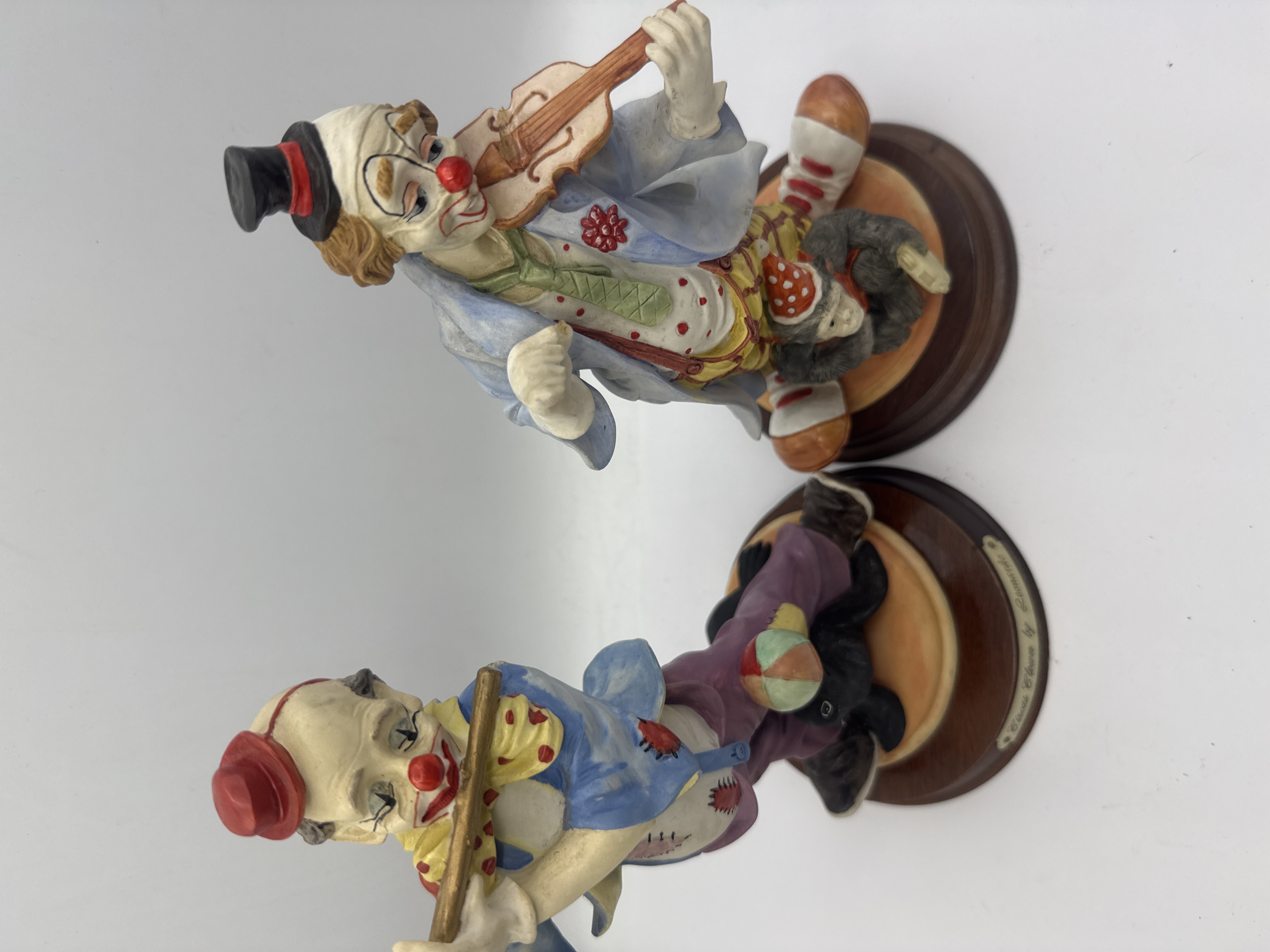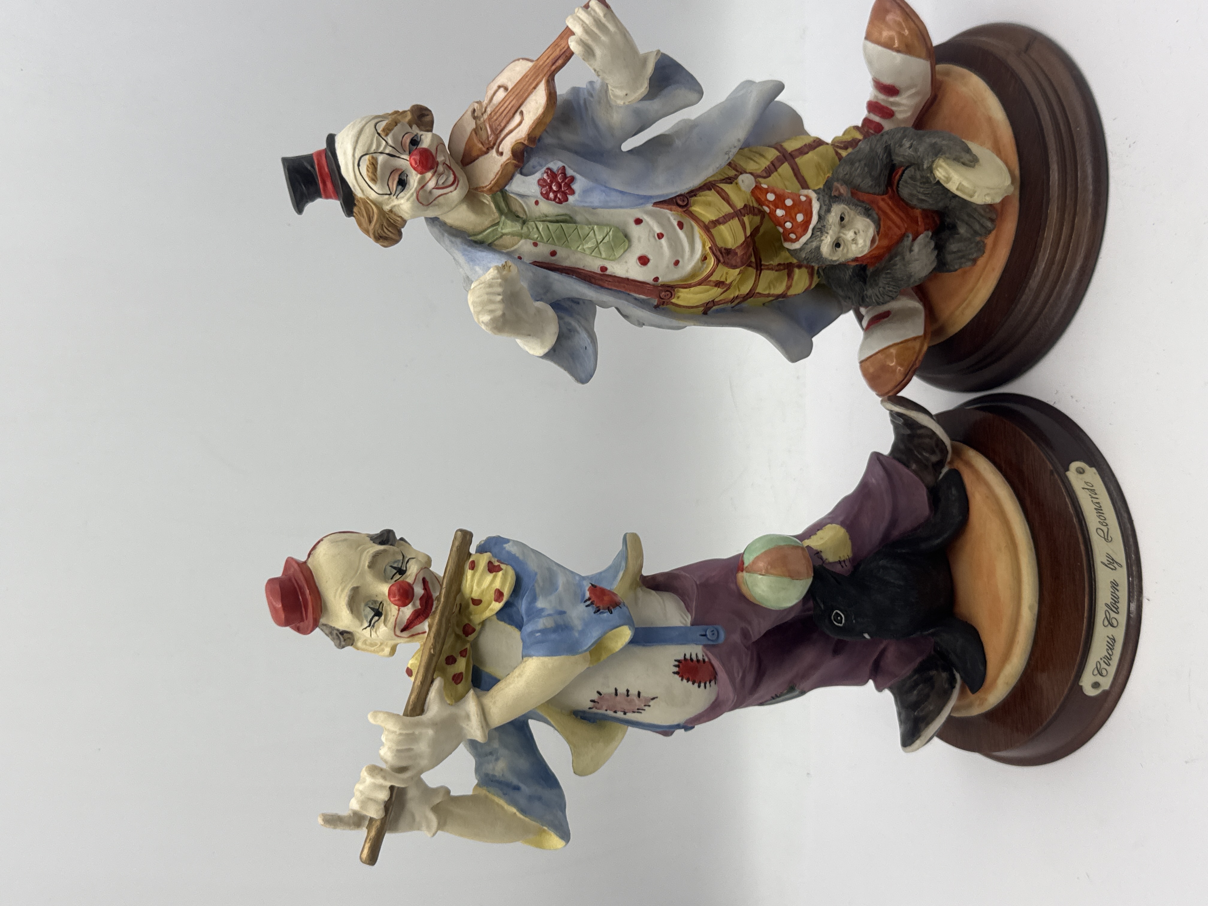A pair of decorative figurines from The Leonardo Collection, identified as the Circus Clown series. The figures are constructed of cold-cast material, likely resin or ceramic, and feature vibrant polychrome painting. Each figure is mounted on a circular wooden base with a green felt underside. The first figurine depicts a clown playing a transverse flute, accompanied by a seal balancing a ball. The second figurine portrays a seated clown playing a violin, accompanied by a monkey wearing a party hat. Markings include a circular brass-colored plaque affixed to the felt base, reading The Leonardo Collection / Circus Clown beneath a crown insignia. An inverted yellow sticker reading FOREIGN is also present on the base. Small plaques on the front of the wooden bases read Circus Clown by Leonardo.