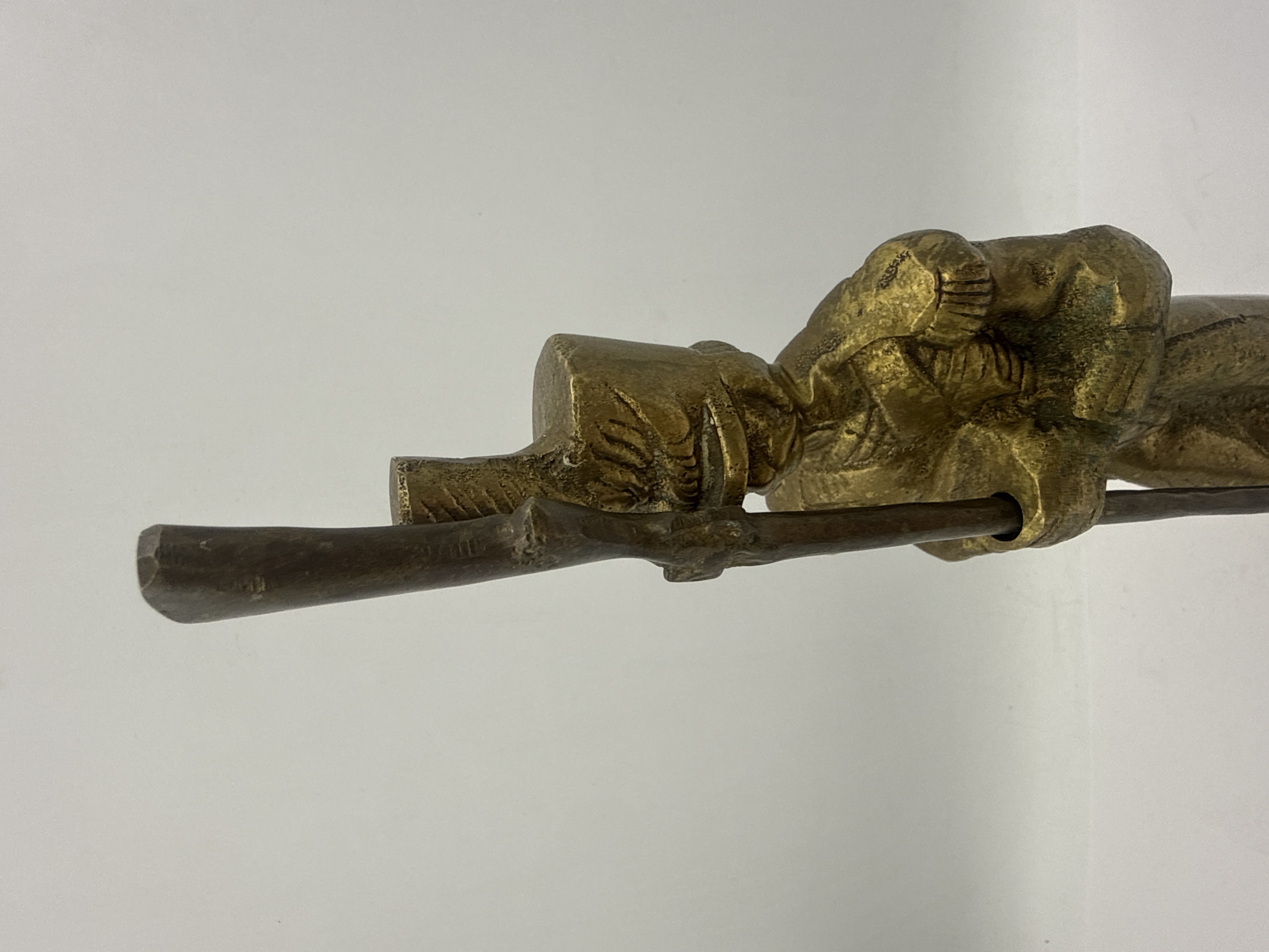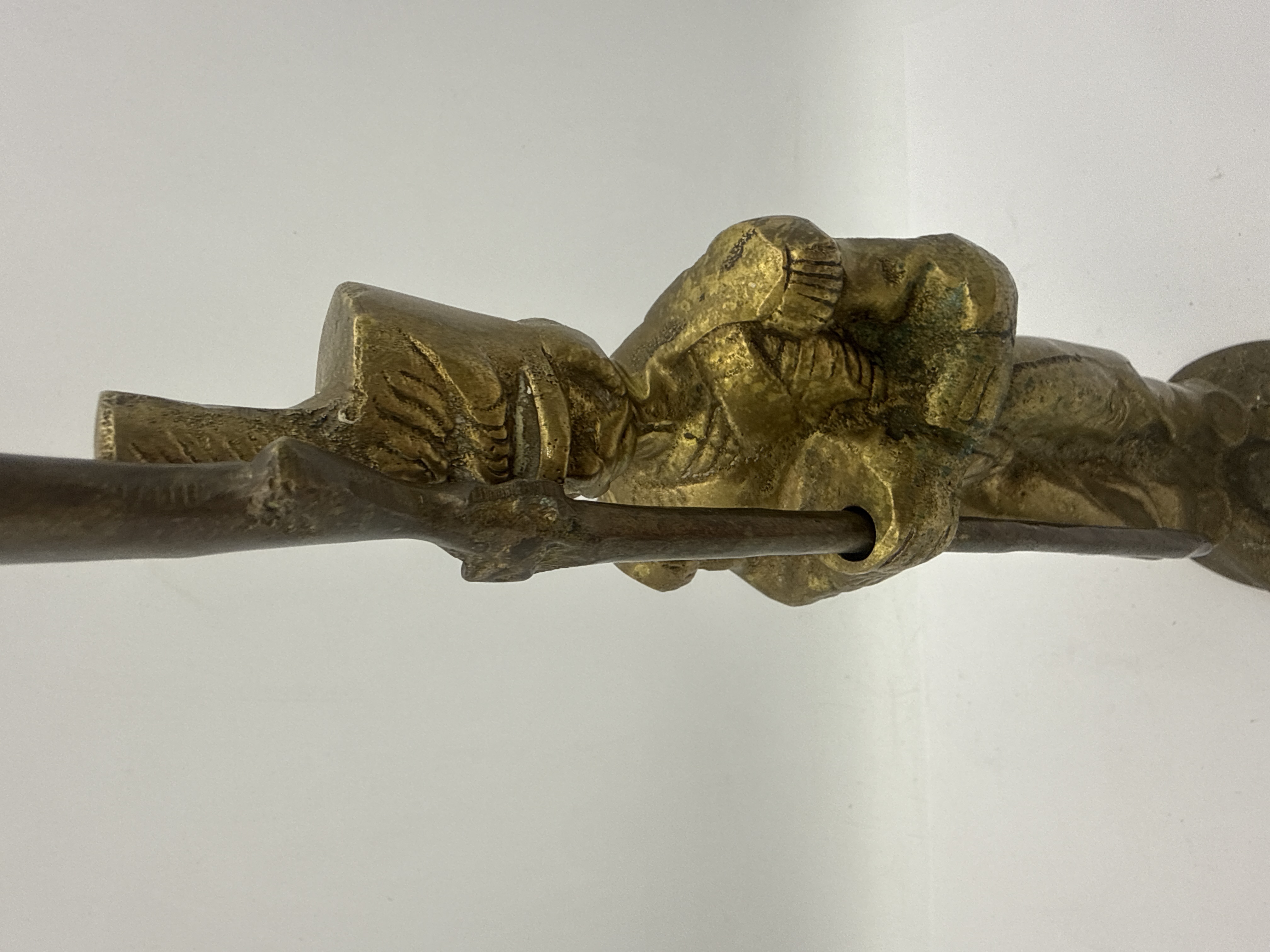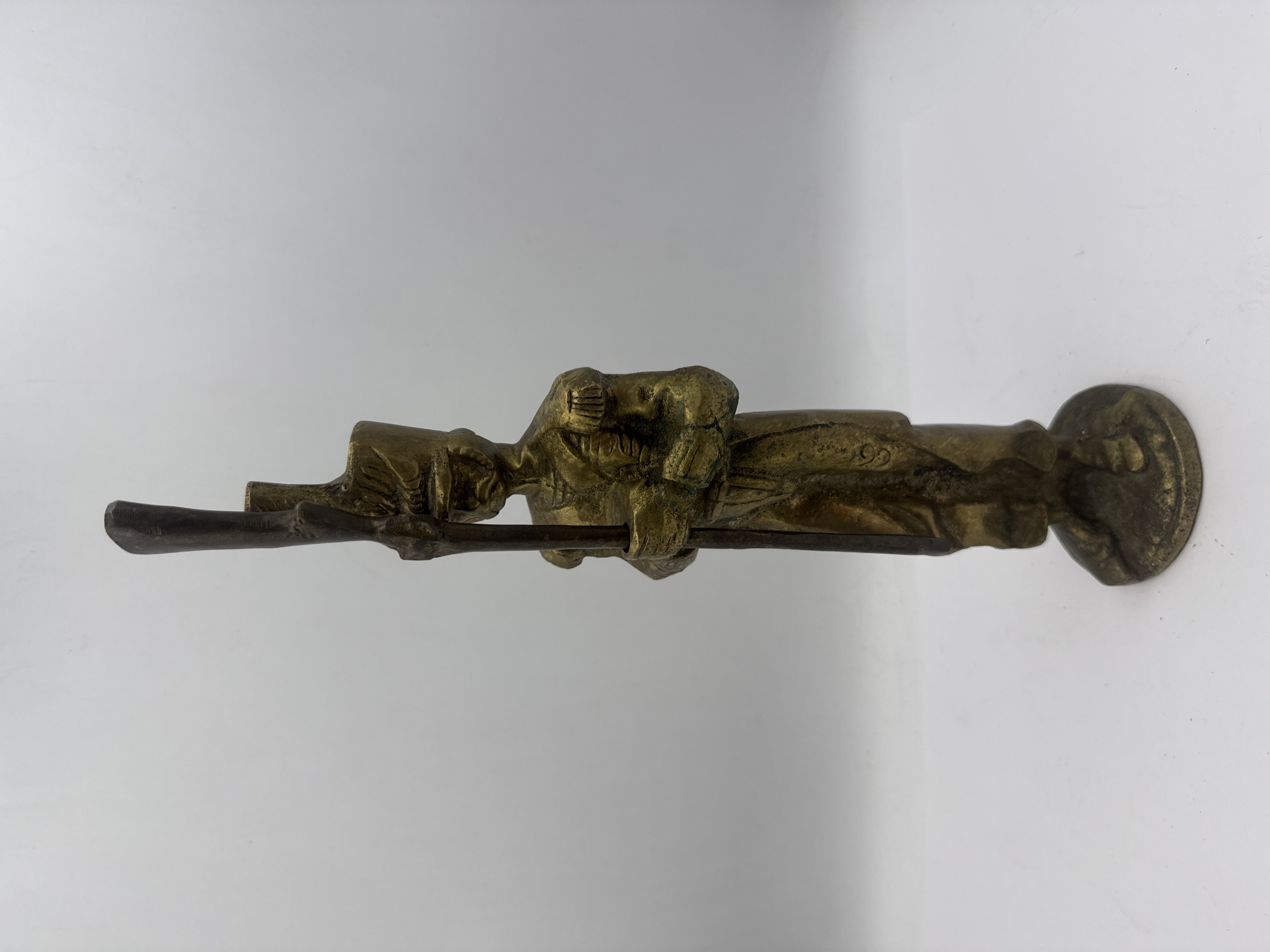 A single cast metal figural statuette, likely brass or bronze, depicting a standing military figure. The figure is characterized as an infantryman, possibly of the Napoleonic era, wearing a detailed uniform featuring epaulets and a cylindrical shako cap. The soldier is holding a tall staff or standard. The object is notably heavy, consistent with its solid casting. It stands on an integrated circular base. The casting details are relatively rough. No visible maker’s marks, inscriptions, or foundry stamps are discernible.