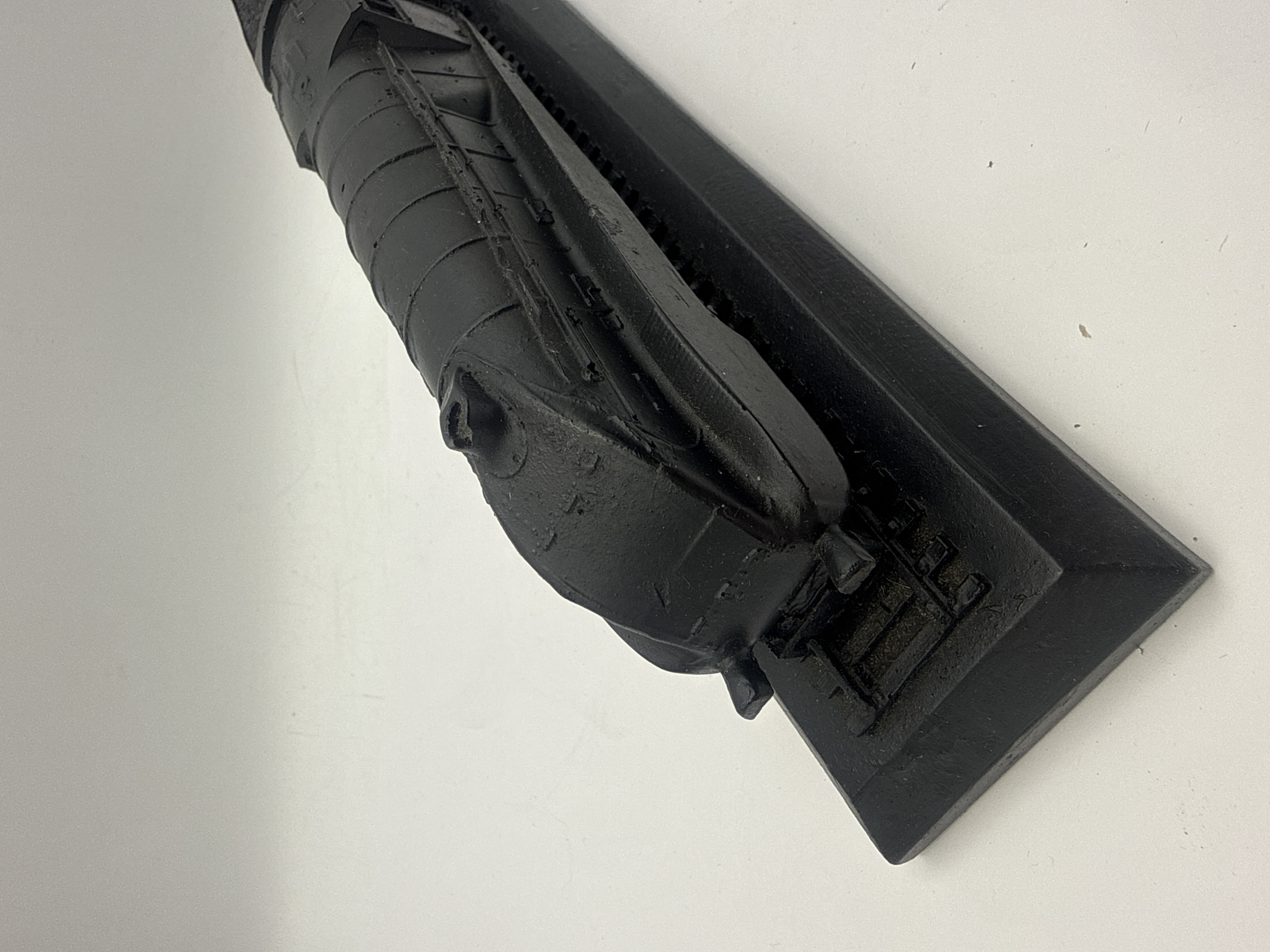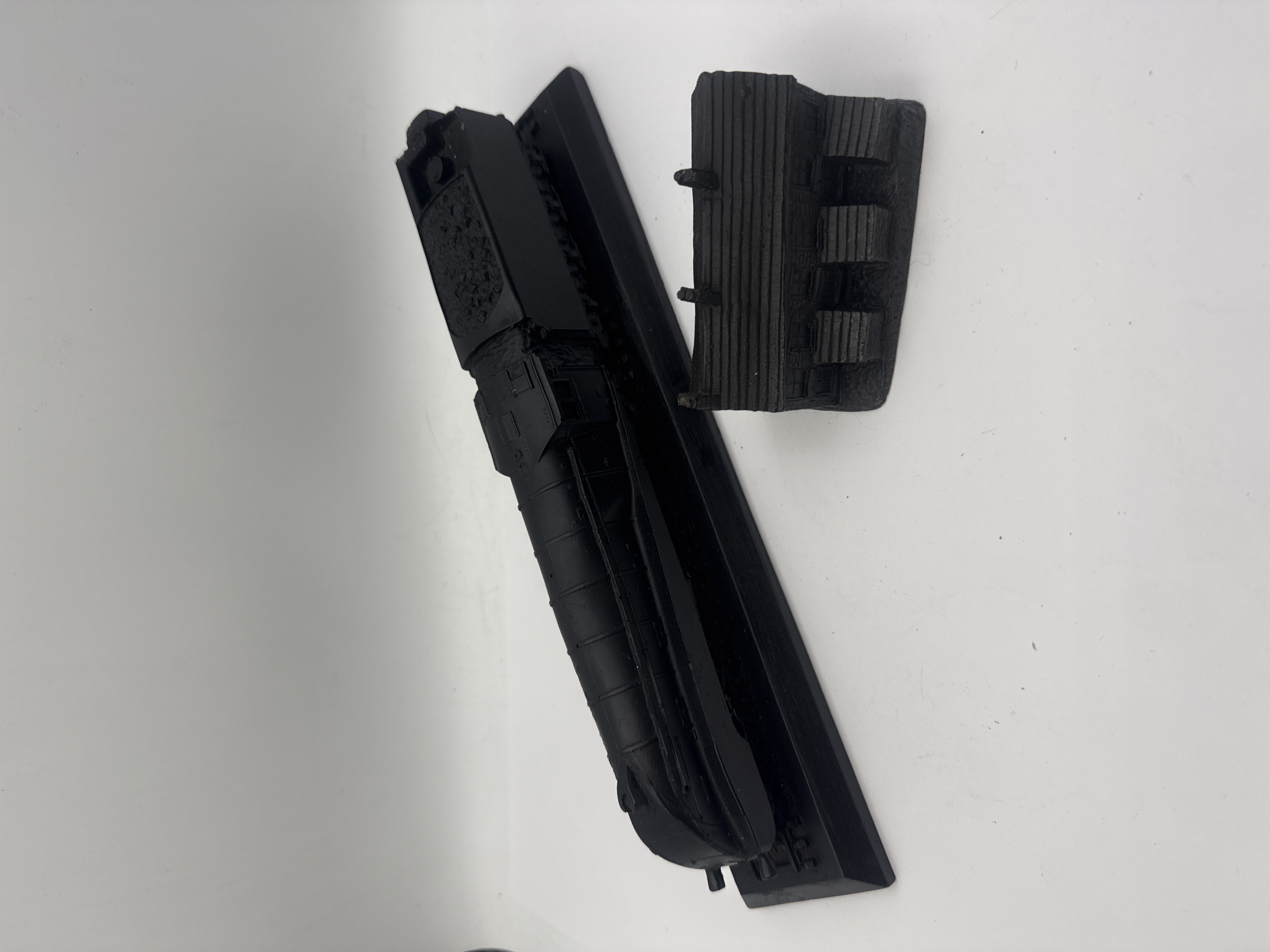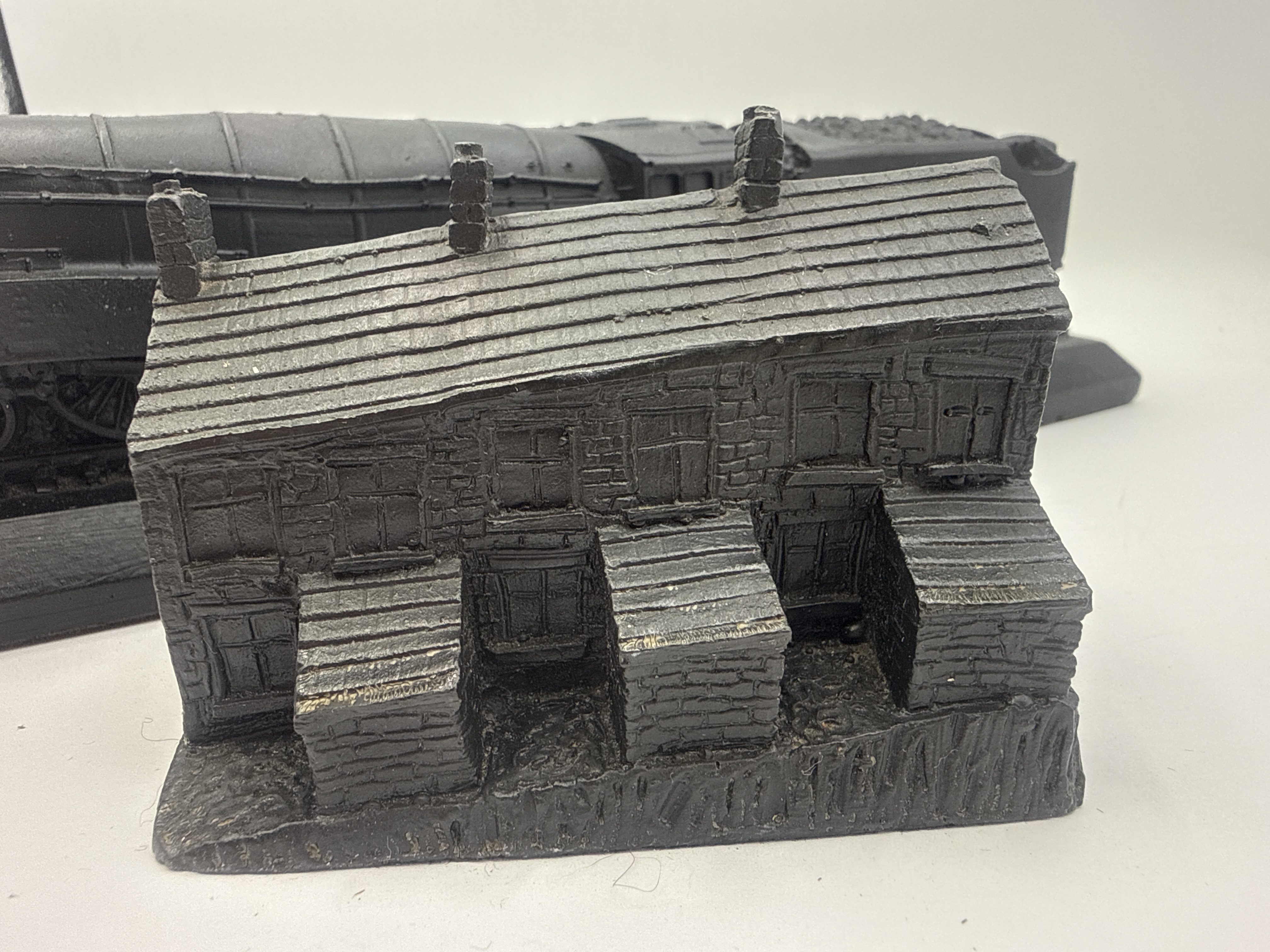 A pair of decorative models, confirmed to be constructed from Coal, featuring a deep matte black finish. The lot comprises two distinct pieces: a streamlined steam locomotive model and a separate miniature building facade. The locomotive is mounted on a rectangular base simulating a section of rail track, incorporating a fixed tender with simulated coal load. The streamlined design is suggestive of mid-20th-century aerodynamic steam engines. The accompanying building model depicts a two-story structure, possibly a terraced worker’s cottage, featuring highly textured stonework, multiple window and door details, and two roofline chimneys. The facade is mounted on a simulated uneven ground base. The locomotive model is approximately 12” long, and the cottage model is approximately 4” tall. No visible manufacturer marks or inscriptions are present on either piece.