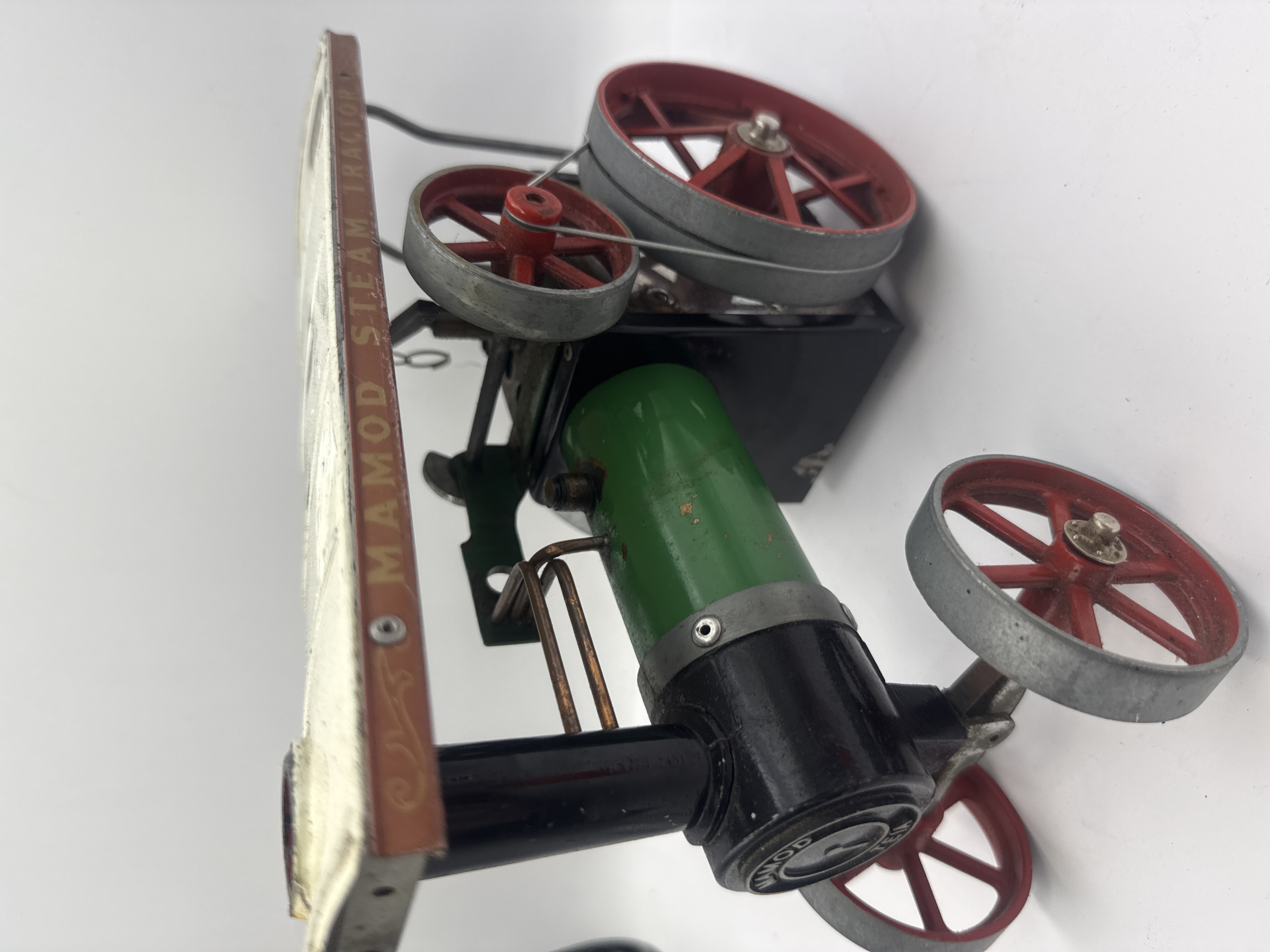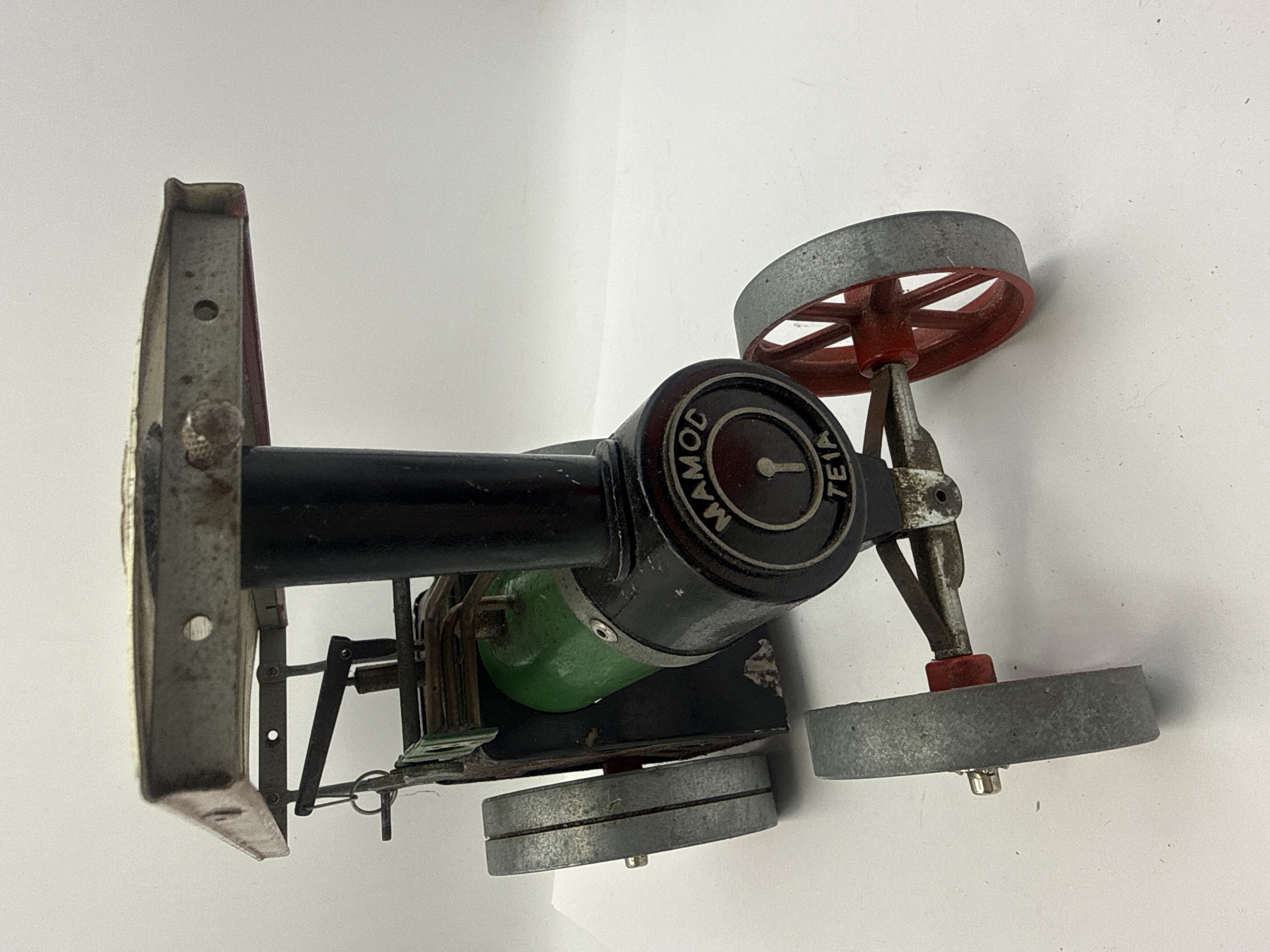 A vintage Mamod live steam model traction engine, identified by market consensus as the TE1a model. The construction is primarily painted metal, utilizing tinplate and possibly some cast components. The model features a black engine block, a green boiler, and a cream-colored tin canopy with red trim, supported by metal stanchions. The rear wheels are red spoked, and the front wheels are grey and red spoked. Visible markings include “MAMOD STEAM TRACTOR” printed along the side roof support, and “MAMOD” above “TEIA” around the central keyhole on the front face of the boiler.