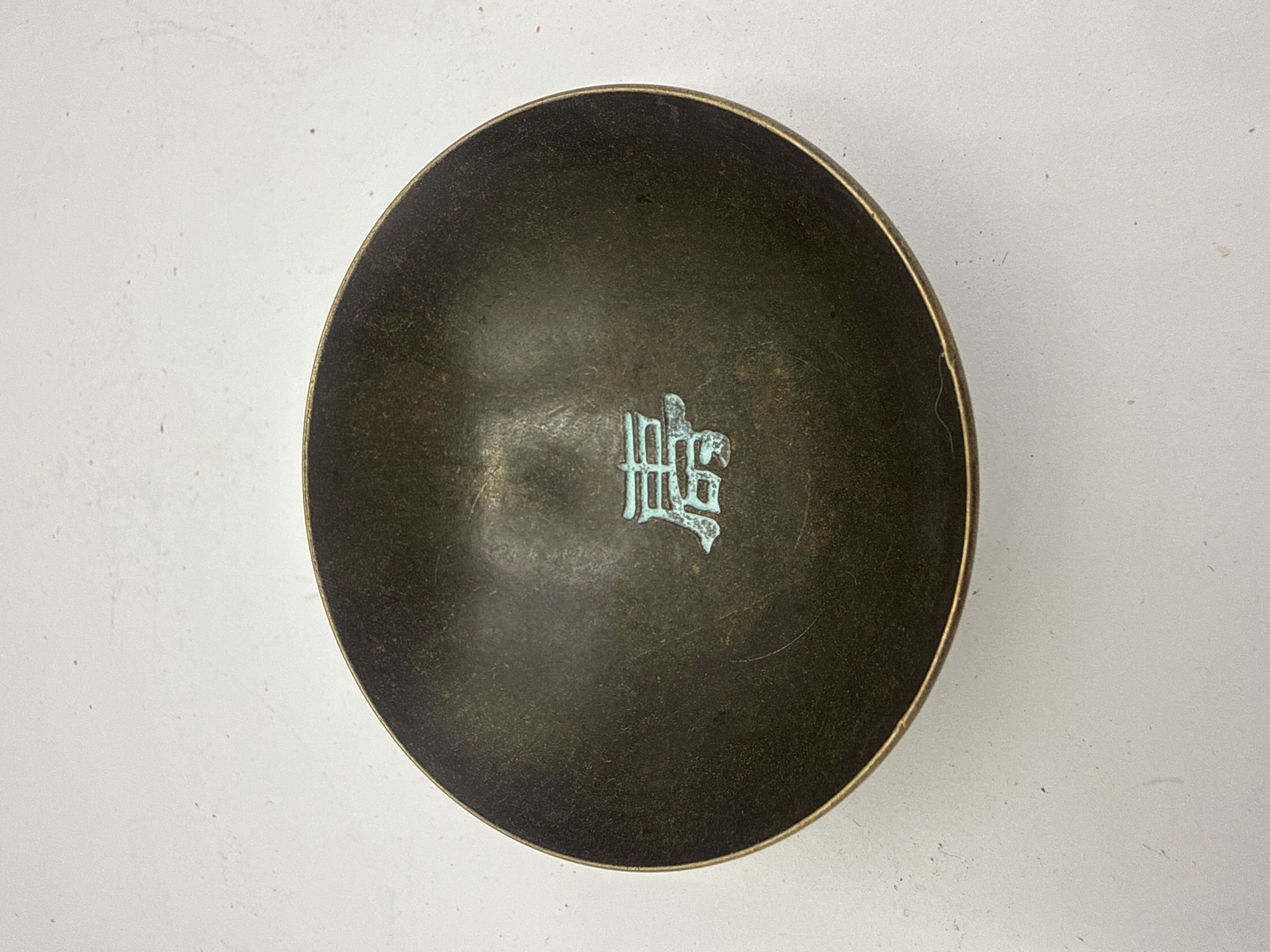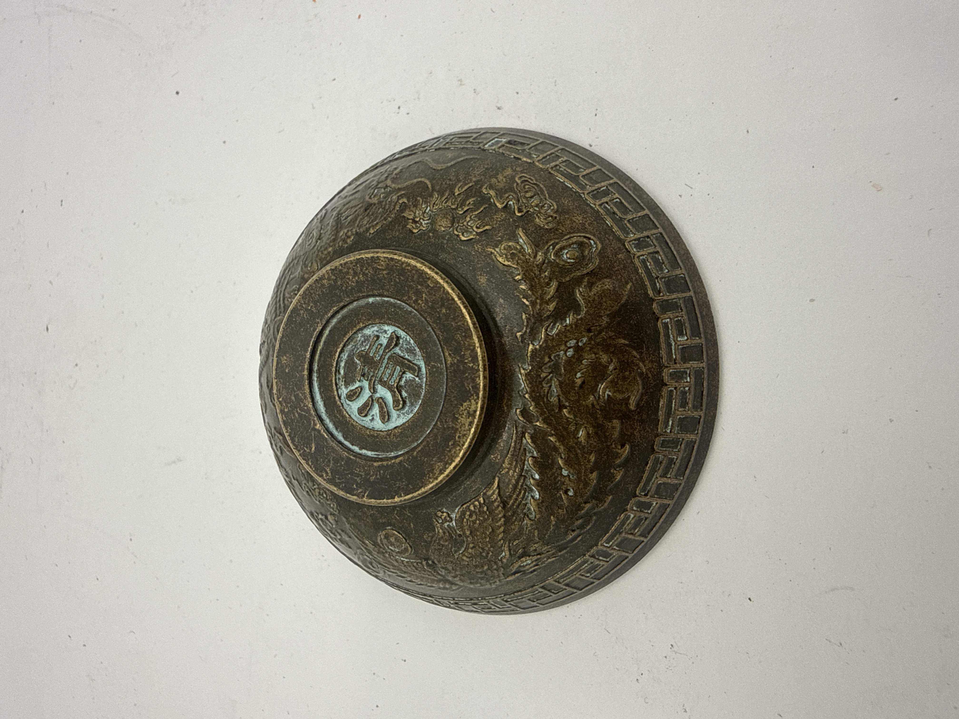A small Chinese bronze bowl featuring a dark brown/black surface patina. The exterior is decorated in high relief with stylized mythological creatures, identified as dragons, situated above a geometric key-fret border near the foot. The interior center and the recessed circular medallion on the base both prominently display the single Chinese character 壽 (Shòu), meaning “Longevity.” This character is highlighted by patches of pale turquoise verdigris corrosion.