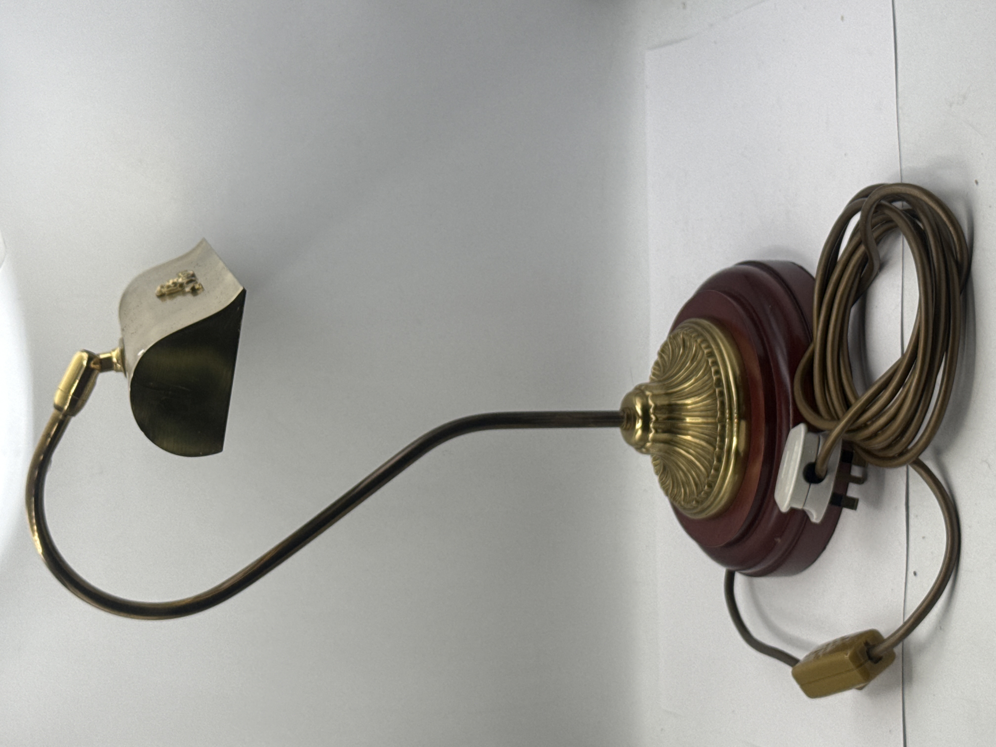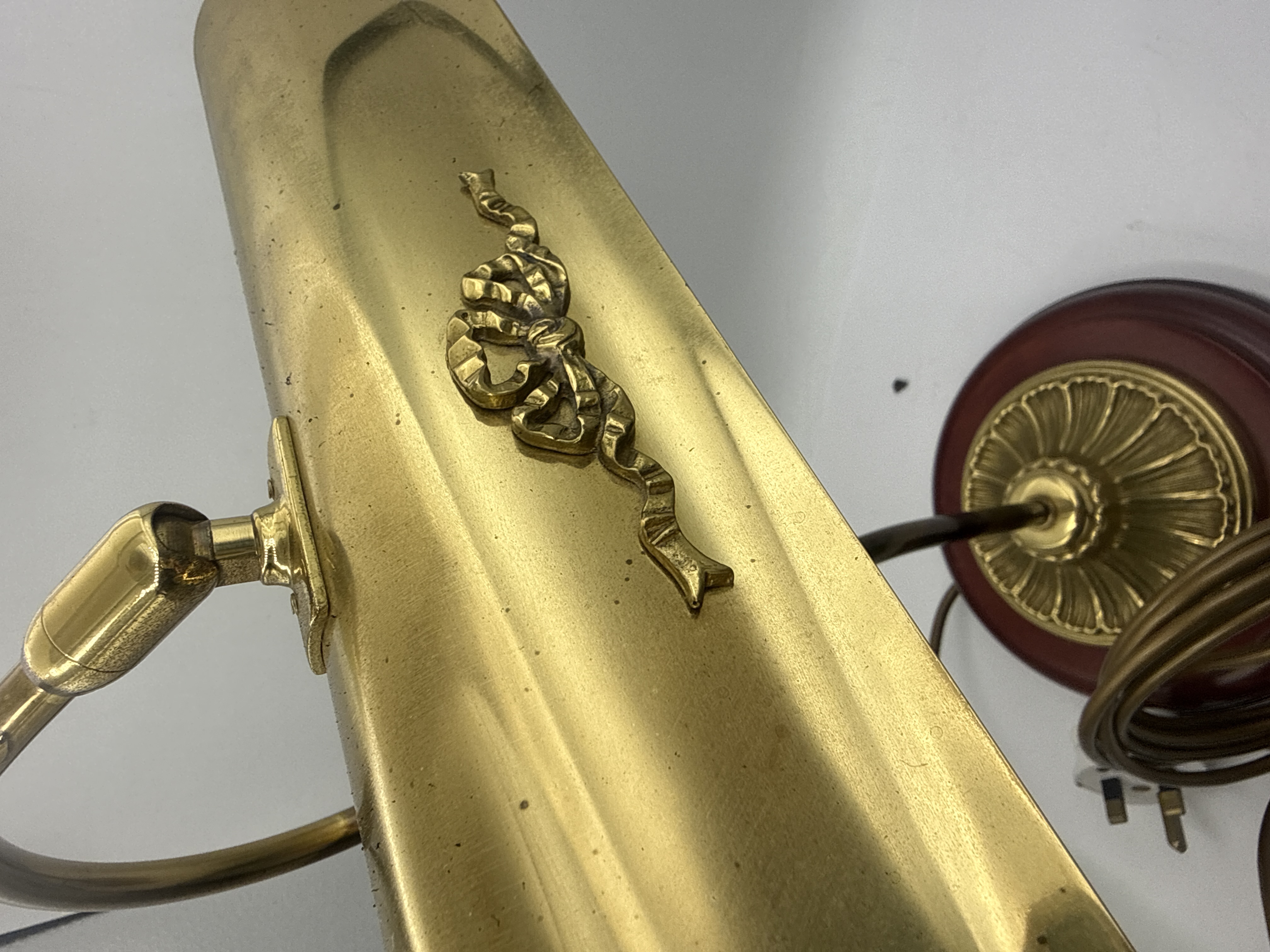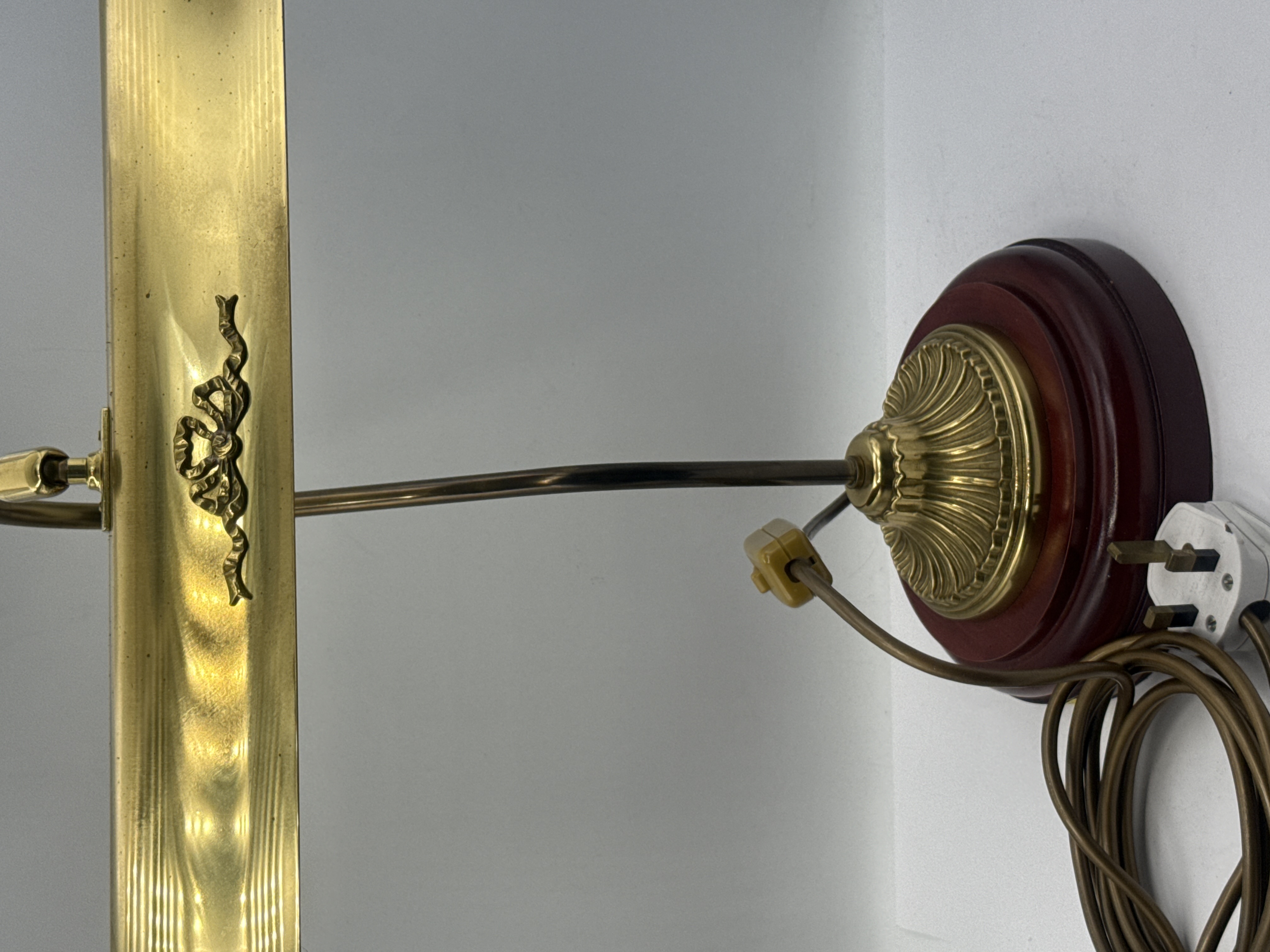 A traditional electric piano or bankers desk lamp, constructed primarily of brass-toned metal. The lamp features a curved gooseneck rising from a reeded, fluted brass pedestal base, which is mounted on a stepped circular plinth of dark reddish-stained wood. The elongated rectangular shade is detailed with an applied decorative relief depicting a flowing ribbon or bow knot motif. The lamp is fitted with a brown textile-covered electrical cord, an in-line plastic switch, and a British-standard three-pin plug. No legible manufacturer’s marks or inscriptions are visible.