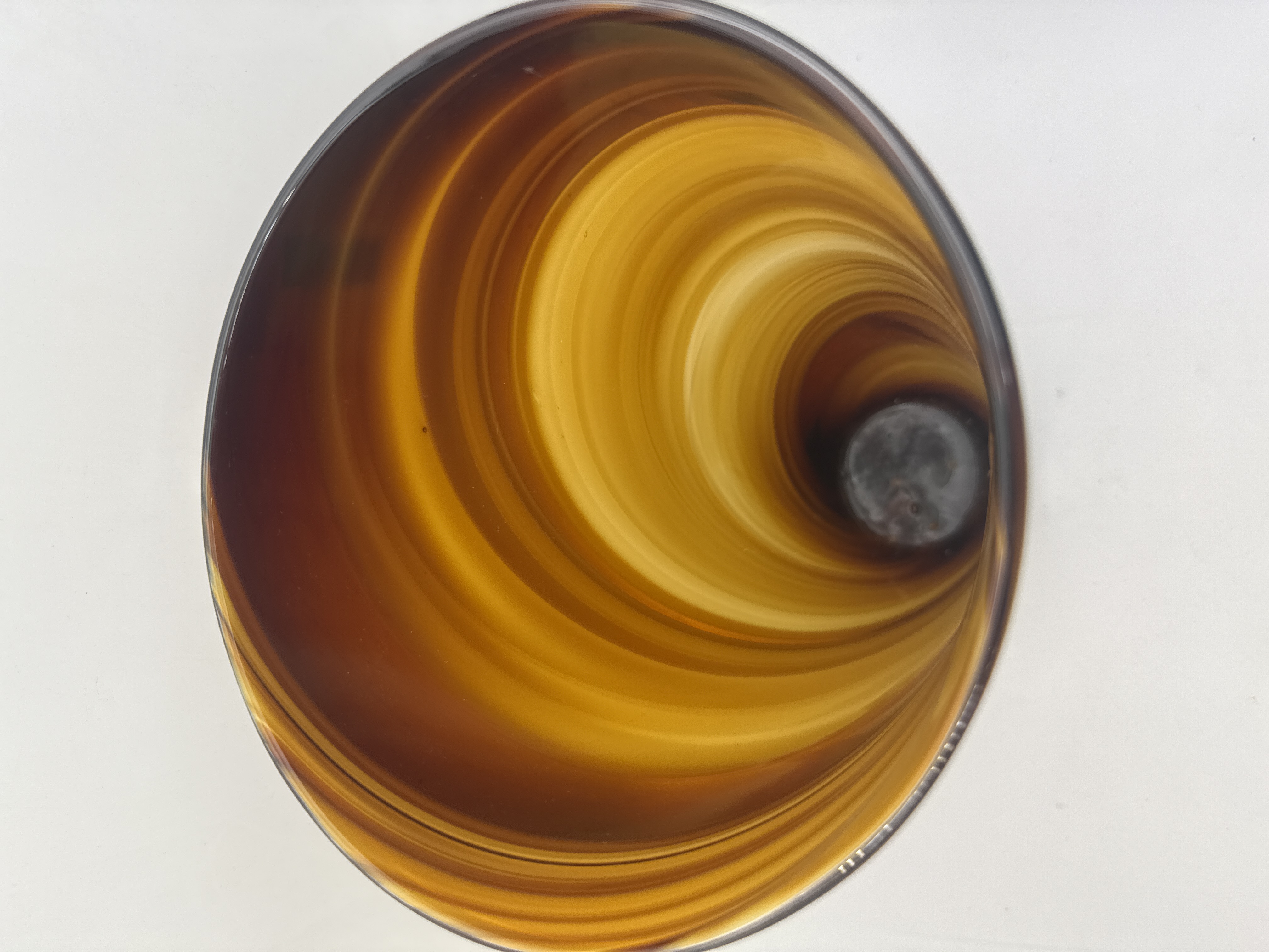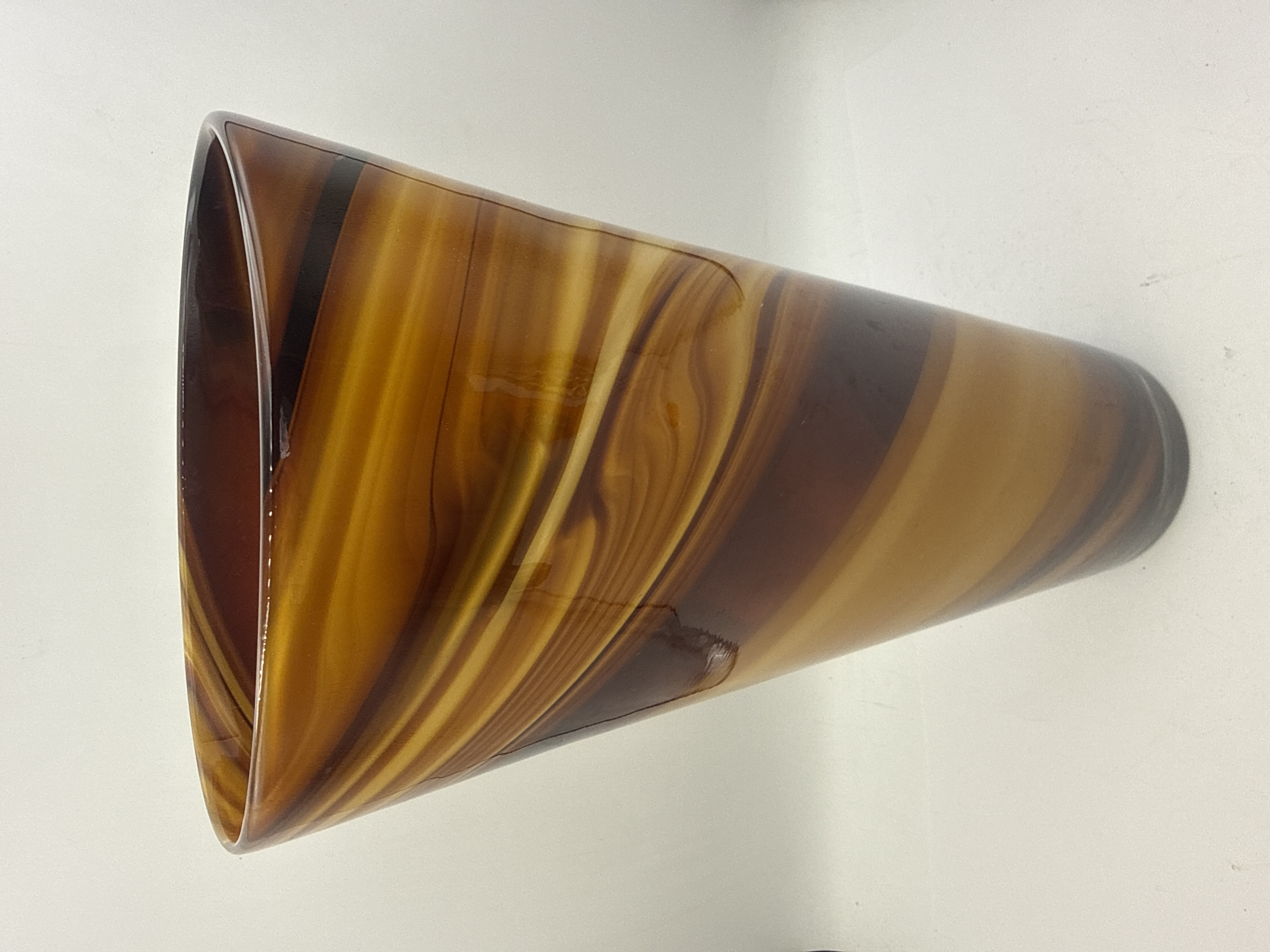 A single hand-blown art glass vase of contemporary design, identified by market comparables as being consistent with the Mid-Century Modern style. The vase features a sharply tapering, quasi-conical body culminating in an asymmetrical, irregularly flared mouth. The glass material exhibits intense internal swirling coloration composed of variegated earth tones, including deep reddish-brown, aubergine, bright amber, and golden yellow. The technique used suggests high-quality studio production, though no manufacturer’s marks, signatures, or text are visible upon inspection.
