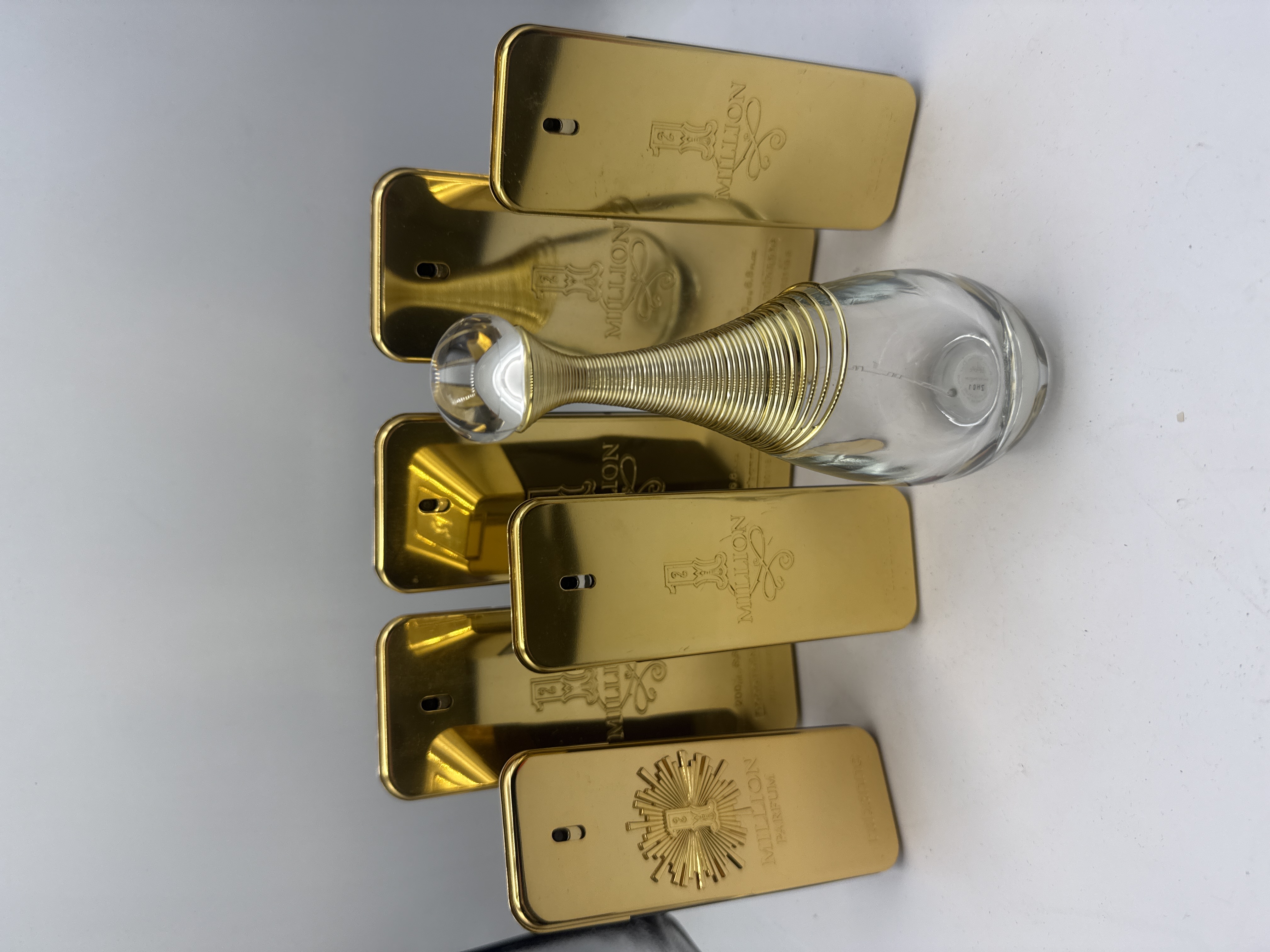 A collection of seven empty bottles from major designer fragrance lines. The collection comprises six Paco Rabanne 1 Million gold-toned metallic flacons and one Dior J’adore clear glass bottle. The Paco Rabanne bottles are rectangular and styled like gold ingots, featuring embossed text including the stylized 1 MILLION logo. One example is specifically marked MILLION PARFUM and RABANNE. The Dior flacon is a clear glass teardrop shape with a stylized long neck wrapped in thin gold-toned wire, topped by a clear spherical stopper. All items are empty bottles, suitable for display or refillable use.