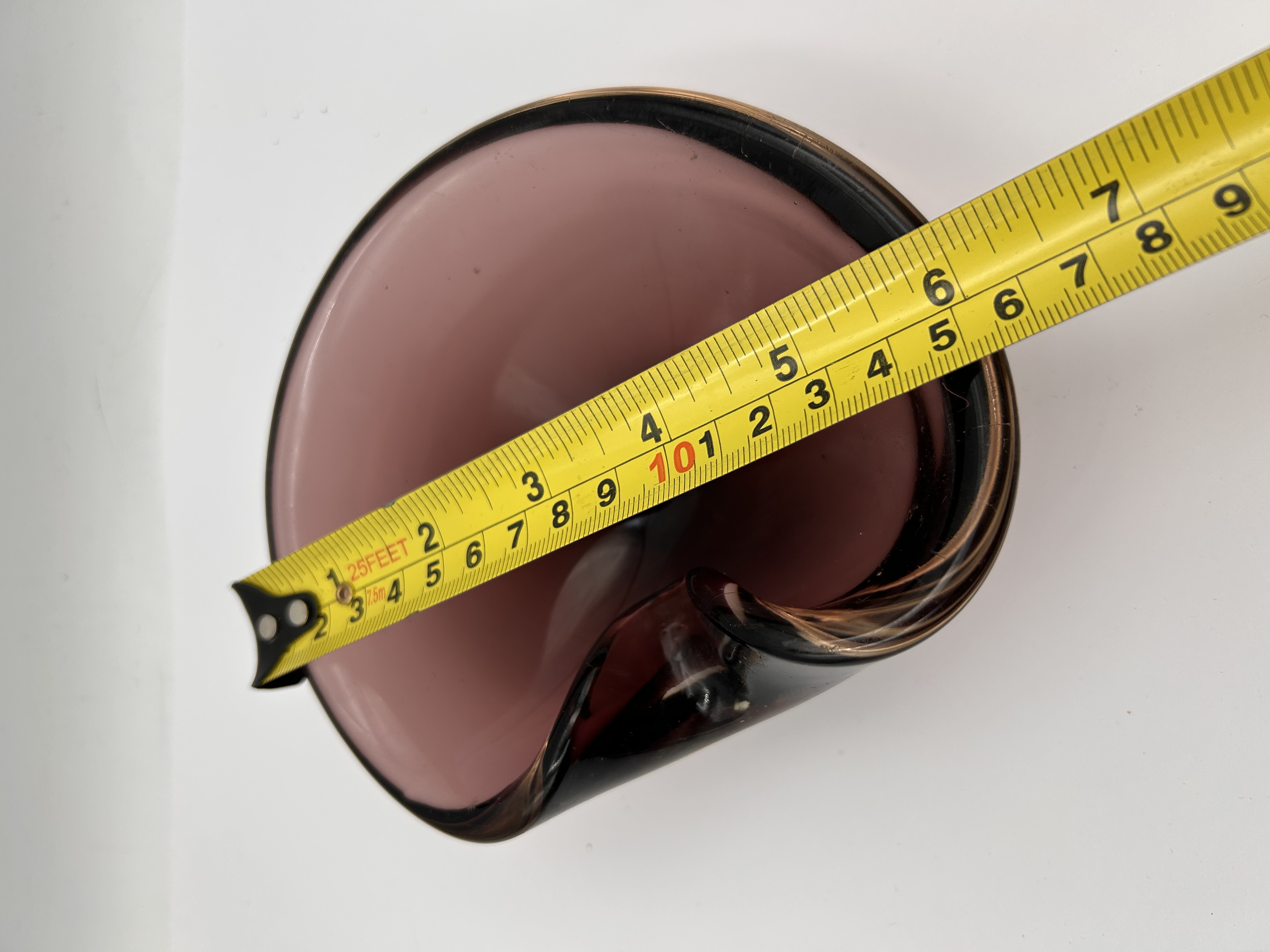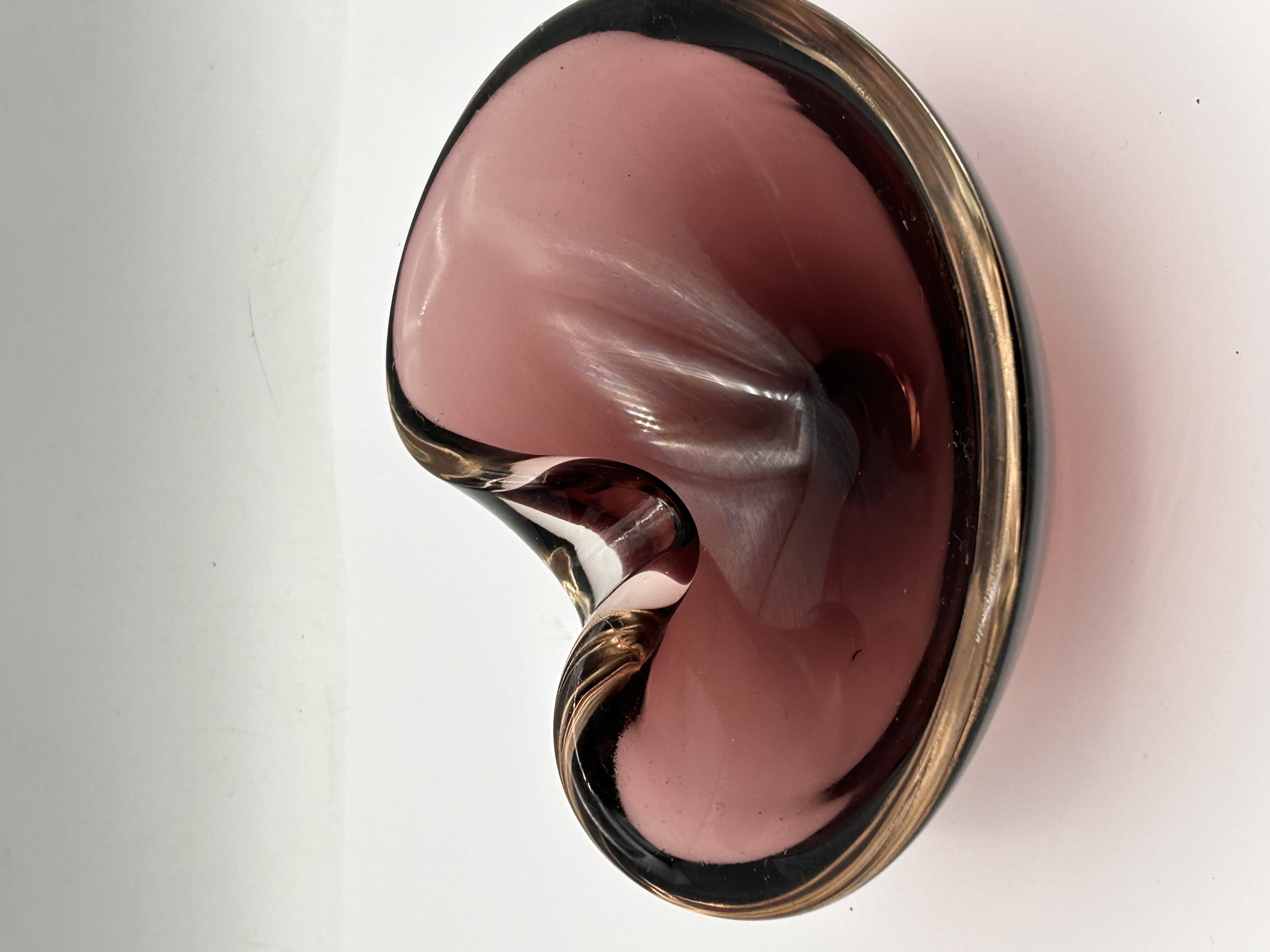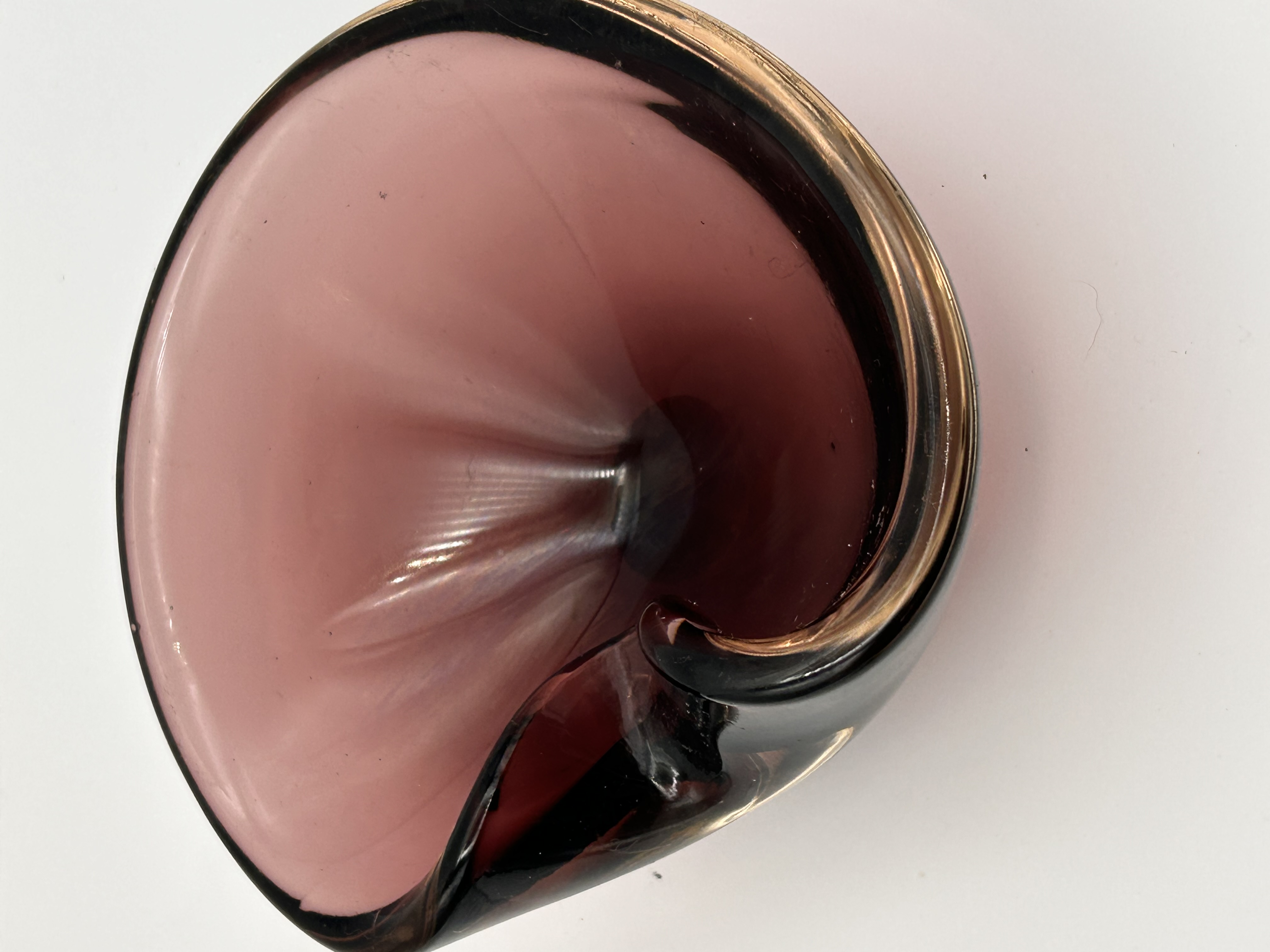 A single sculptural art glass dish, attributed to Murano, Italy, and styled as a clam shell or folded bowl, characteristic of Mid-Century Modern design. The vessel is composed of thick, heavy glass with an organic, free-form shape. The interior basin features a deep translucent plum or amethyst hue. The complex, asymmetrical rim and scrolled accenting element are defined by a casing of very dark, near-black glass. This casing is detailed internally with a copper or gold-toned inclusion, likely aventurine, emphasizing the contours. No discernible manufacturer markings, signatures, or acid etchings are visible.