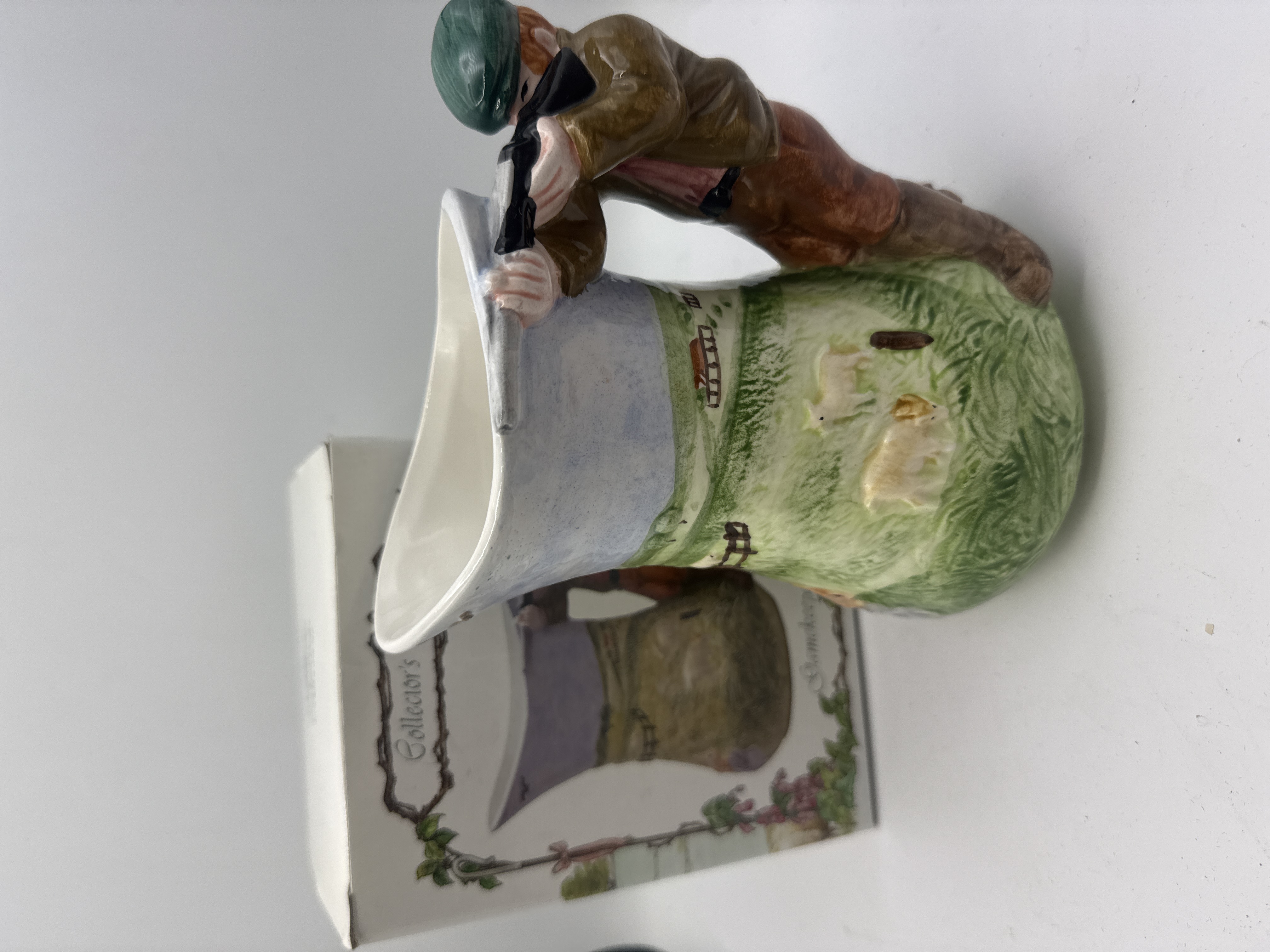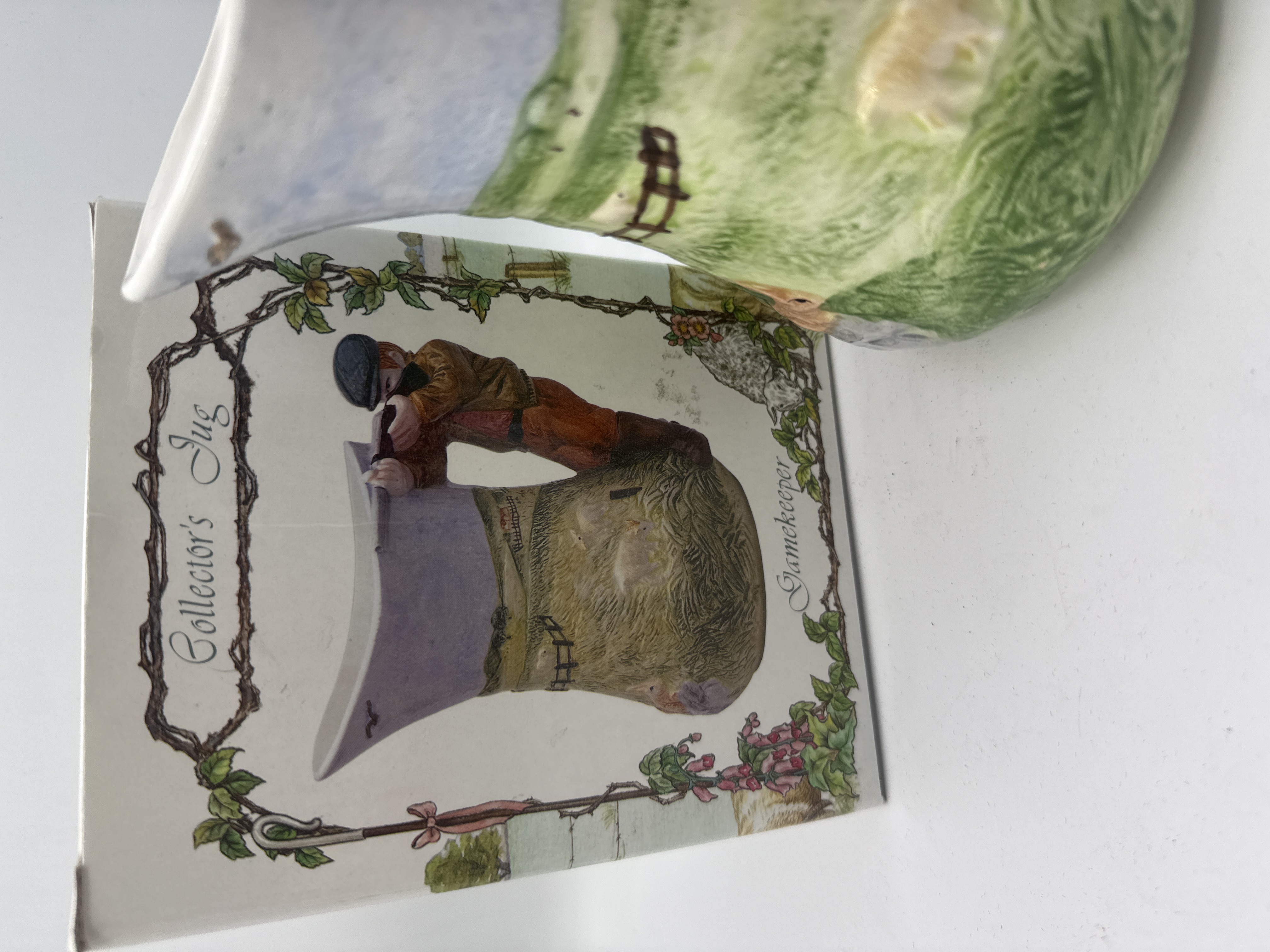 A character jug, likely earthenware or porcelain, consistent with the style of Royal Doulton handled jugs. The body of the jug is painted with a glazed rural landscape featuring rolling green hills, fencing, a small structure, and white sheep or goats under a pale blue sky. The handle is sculpted as a full-figure representation of the ‘Gamekeeper’ character, dressed in hunting attire including a green cap, brown jacket, and dark boots, aiming a black rifle across the rim of the jug. The jug is accompanied by its original cardboard retail box, which is labeled “Collector’s Jug” and “Gamekeeper,” framed by a decorative vine motif. The jug measures approximately 7 inches in height.