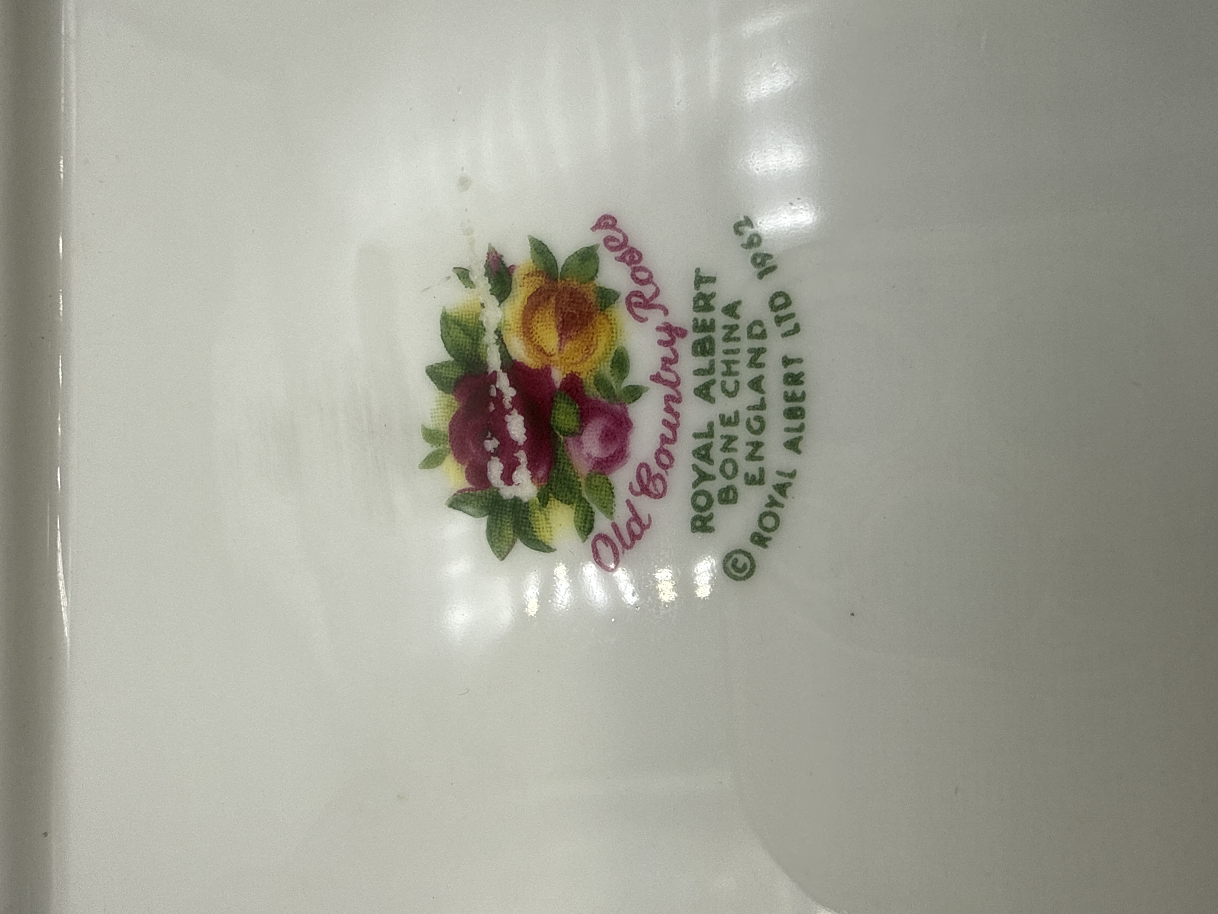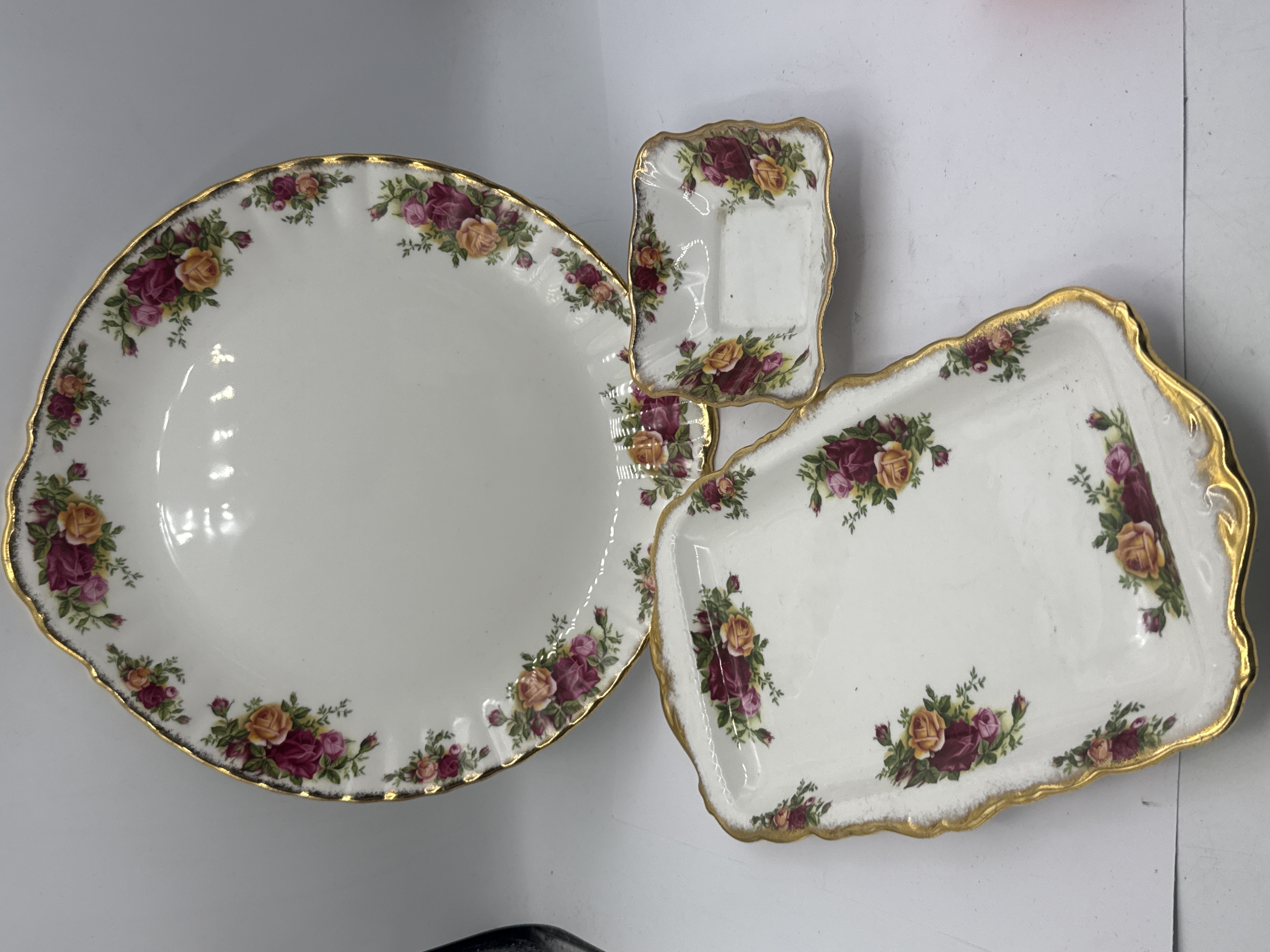 A trio of vintage English bone china serving pieces by Royal Albert in the iconic Old Country Roses pattern. The collection includes one large round serving plate, one oblong rectangular sandwich tray, and one small square pin dish. All items feature a white ground decorated with transfer-printed clusters of multi-colored roses in pink, red, and yellow hues. The pieces have deeply scalloped, fluted edges heavily bordered with gold gilt. The largest plate measures approximately 12 inches in diameter. A visible backstamp confirms the manufacturer and pattern: Old Country Roses, ROYAL ALBERT, BONE CHINA, ENGLAND, and is dated © ROYAL ALBERT LTD 1962.