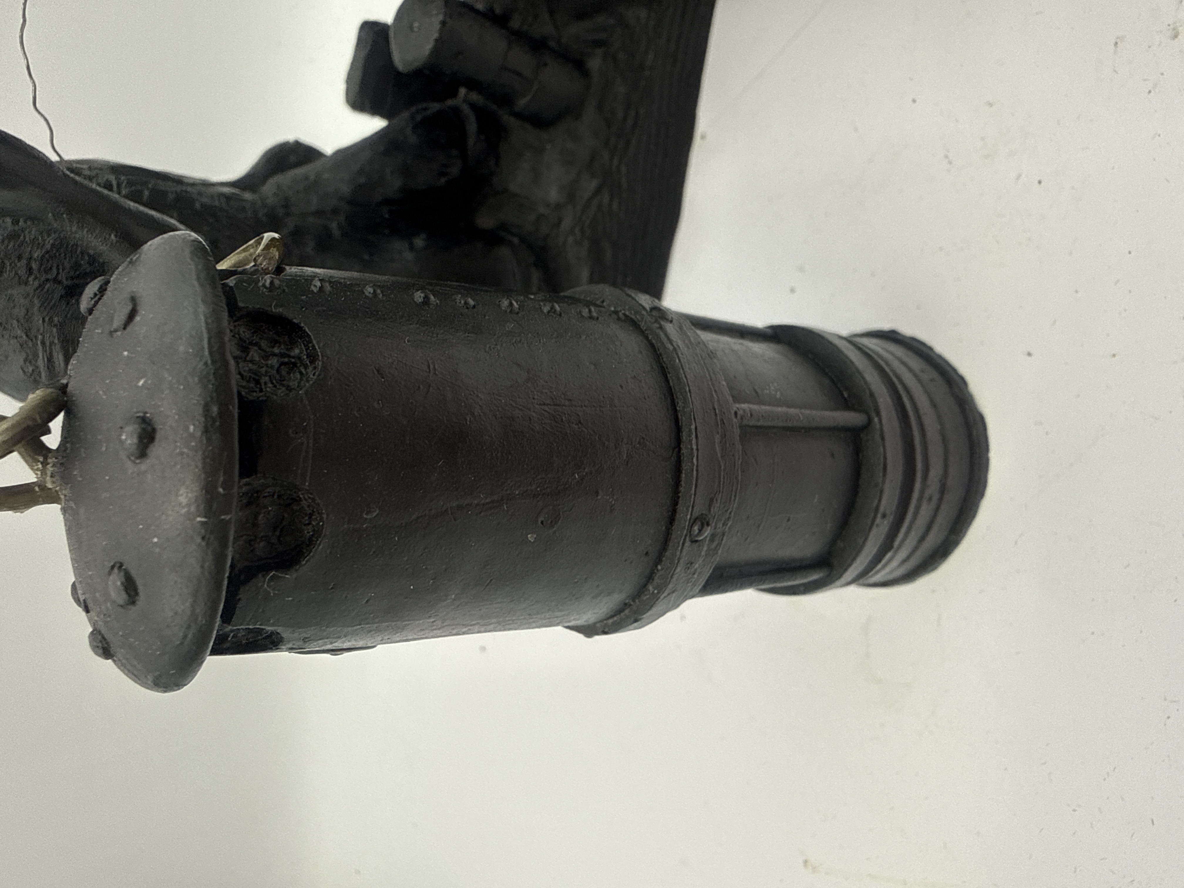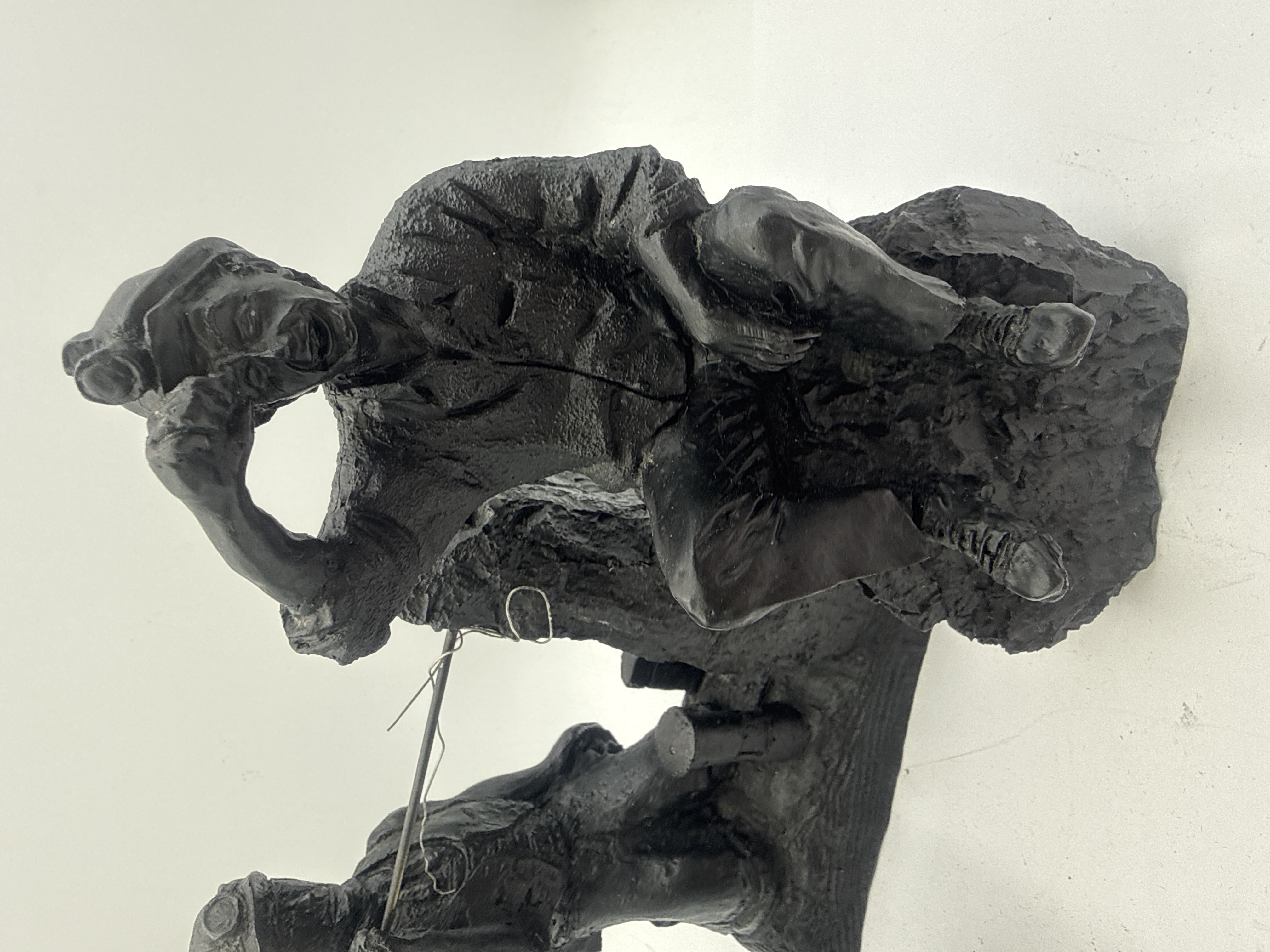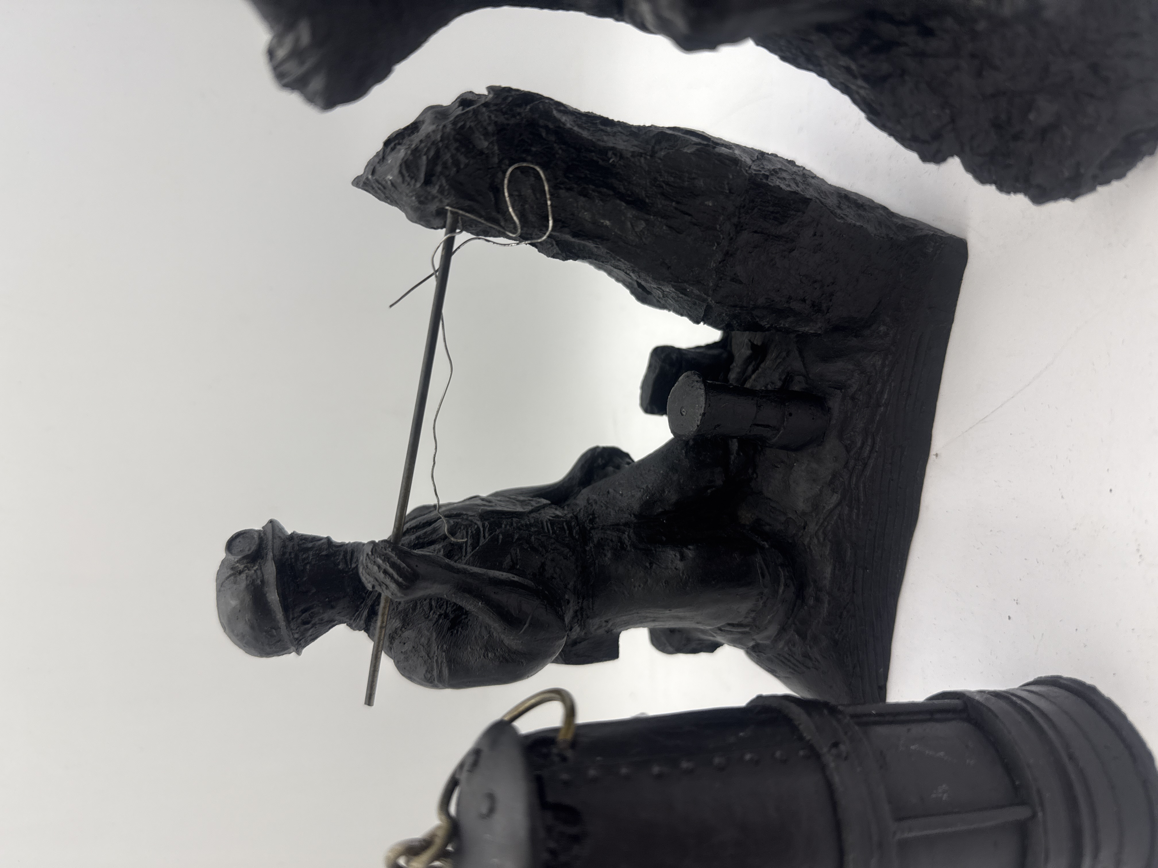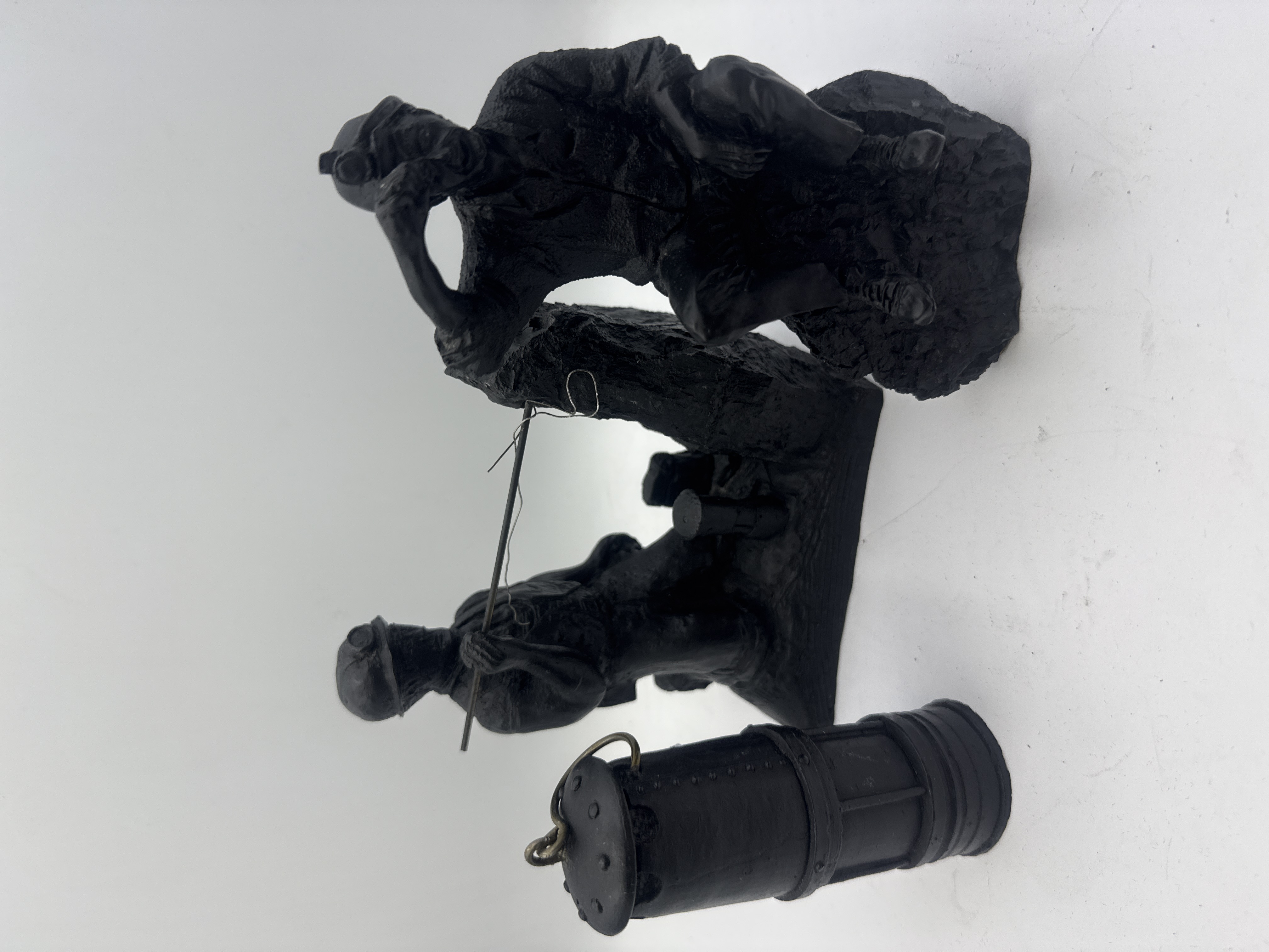 A collection of two items crafted from compressed coal material, typical of handcrafted mining memorabilia. The primary piece is a sculptural tableau depicting two male figures in mining attire, wearing hard hats with attached lamps. The central figure is seated on a simulated rock formation, rendered with an expressive face, appearing to wipe his brow or shout. The second figure kneels behind him, holding a long, thin metal rod that spans the scene. The second item is a separate, cylindrical miniature safety lamp model, also rendered in coal, featuring a domed, riveted top and an integrated metal keyring loop. Both items exhibit a detailed, realistic style. Neither item displays visible manufacturer markings or inscriptions.