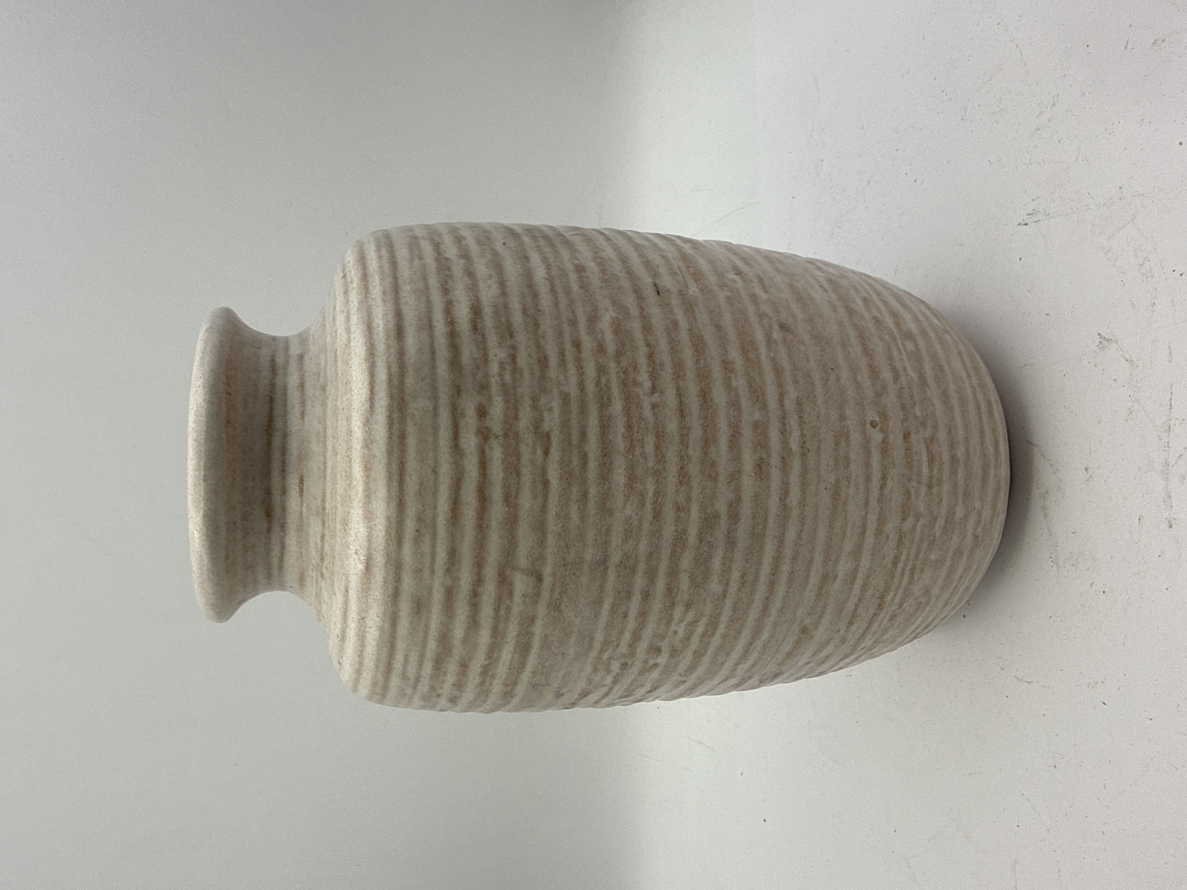 A single West German Art Pottery vase, dating to the Mid-Century Modern period. The vase features an ovoid body and a subtle flared collar rim. It is constructed from heavy earthenware or stoneware, characterized by a deeply ribbed texture created by horizontal concentric grooves. The exterior is finished with a speckled, matte off-white/cream glaze that allows the pinkish-tan tones of the terracotta body to show through within the recessed grooves, consistent with West German production of the 1960s or 1970s. The unglazed base is molded with the manufacturing identifiers 7804-20 and the origin mark W. GERMA..