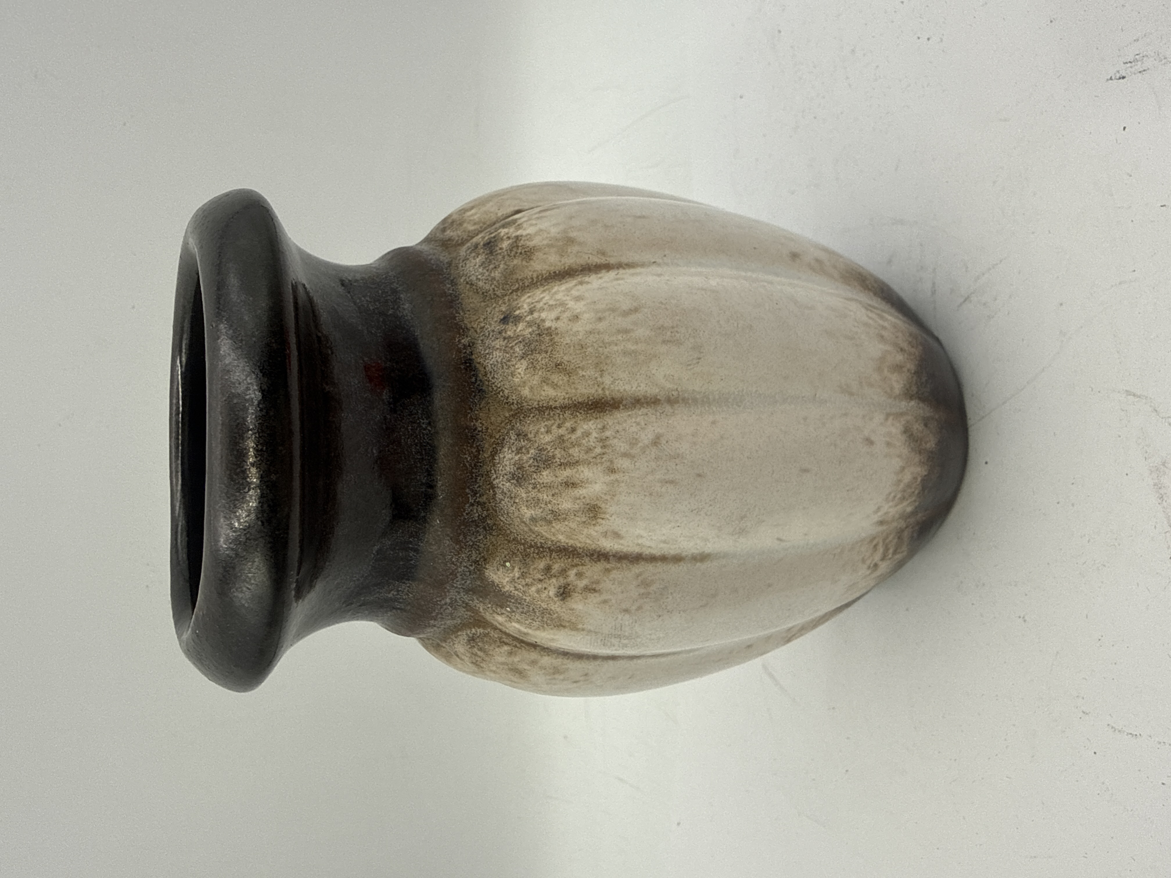 A West German Art Pottery vase manufactured by Scheurich Keramik, identified by the impressed model number 292-15. The ceramic vase features a globular body characterized by vertical ribbing or fluting. It is finished in a transitional glaze scheme typical of mid-century WGP. The lower body displays a mottled beige and off-white glaze with rust-colored speckling. This contrasts sharply with the glossy dark brown/black glaze applied to the short neck, wide rolled rim, and interior. The base is impressed with the model and size number 292-15, surrounded by molded text identifying the manufacturer and country of origin. The vase stands approximately 6 inches tall.