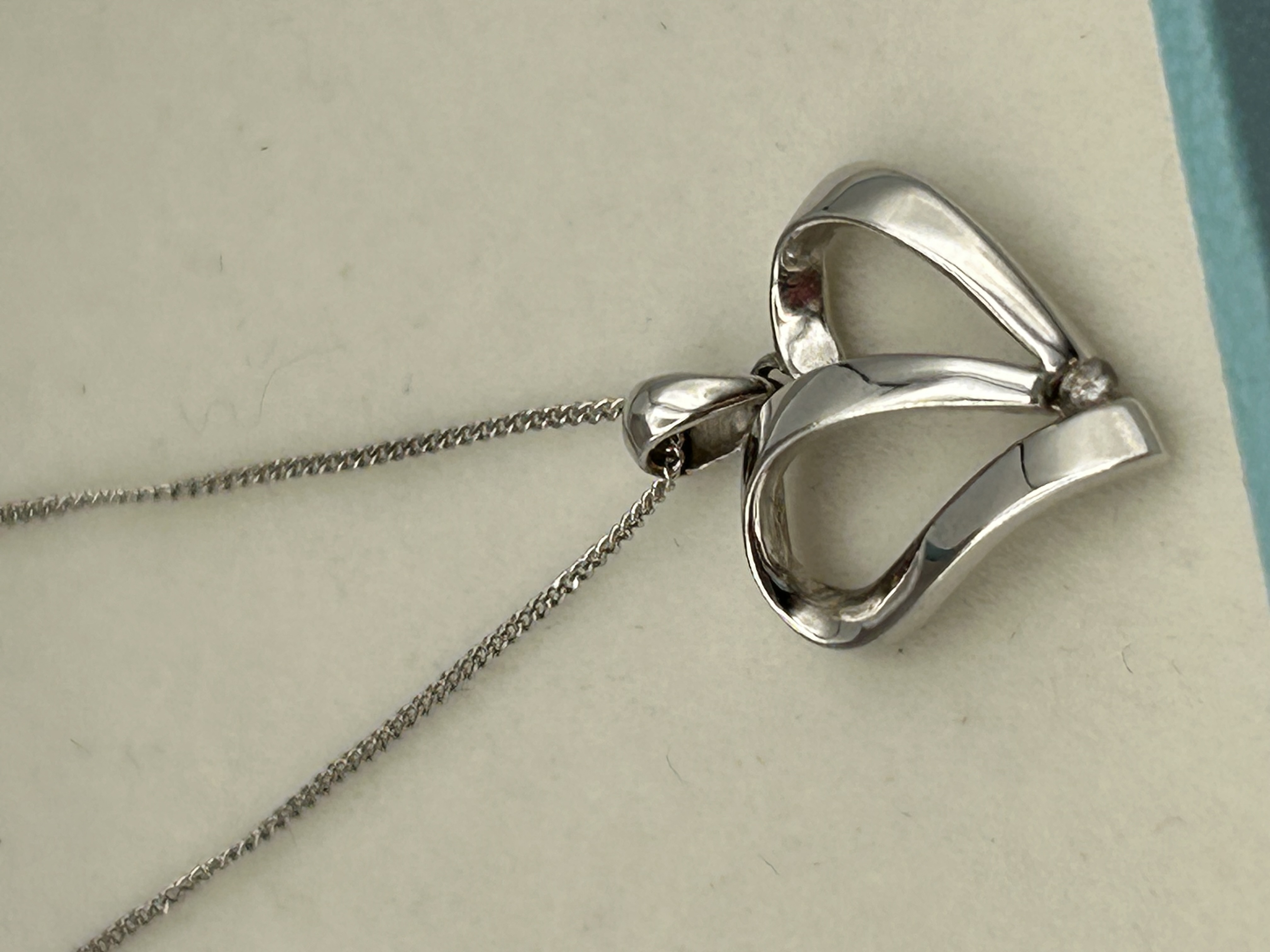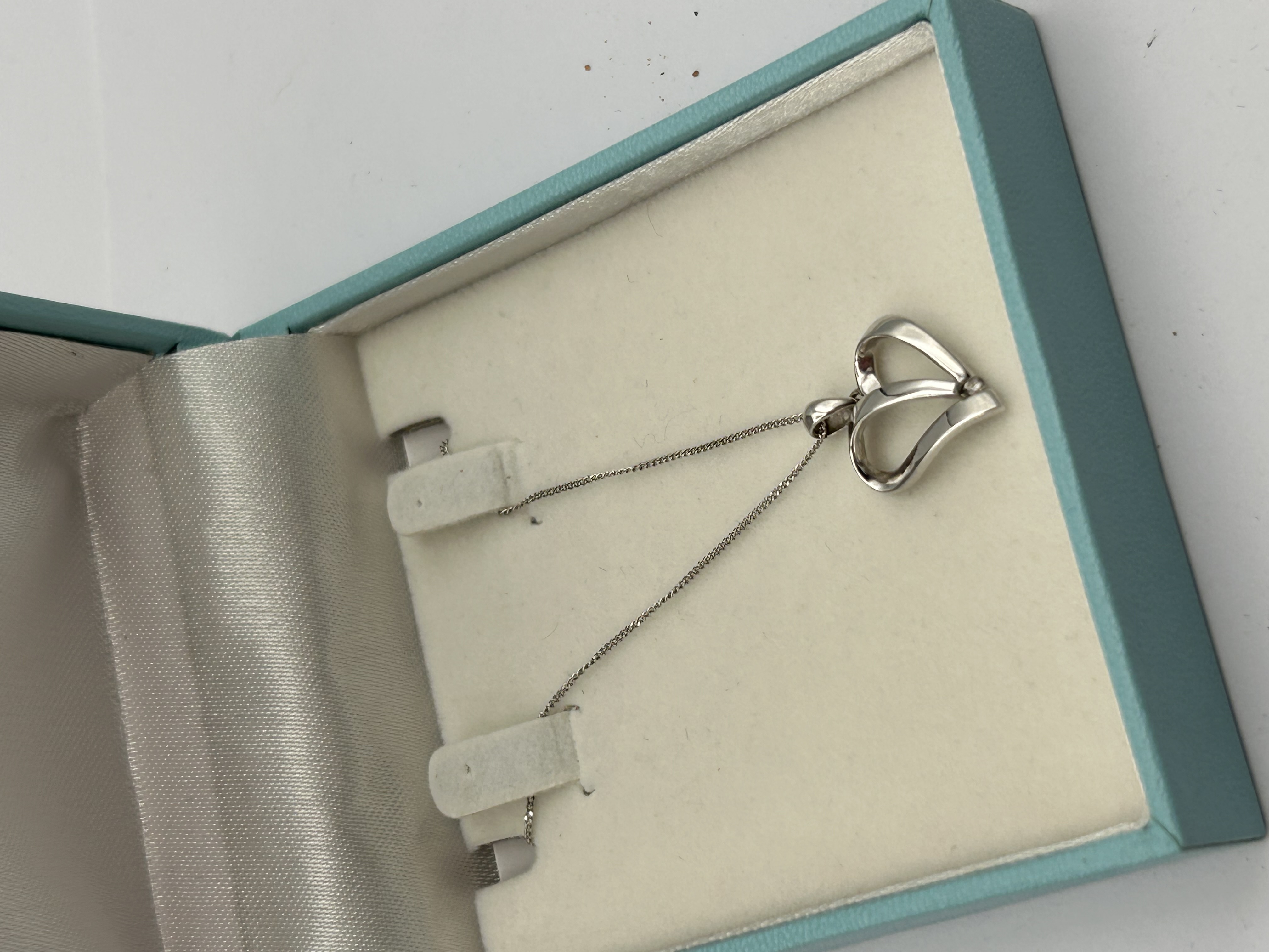 A modern pendant necklace featuring a stylized open heart design crafted from polished white gold. The pendant is formed by two asymmetrical curving elements that meet at the base, where a single small, round colorless stone is set. The pendant is suspended from a thin cable chain. The necklace is presented in a hinged jewelry box with a turquoise exterior and an off-white satin and felt interior lining. No legible hallmarks or maker’s marks are visible on the jewelry or the presentation box.