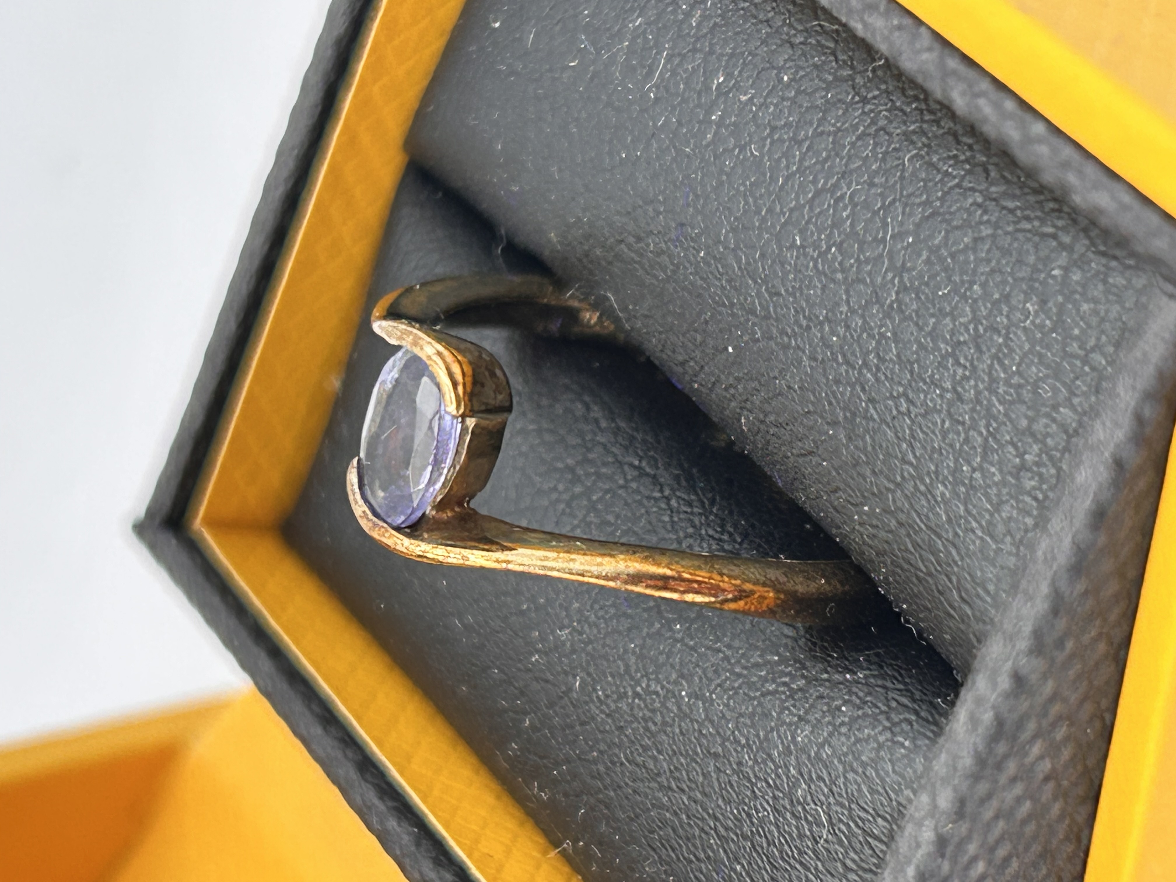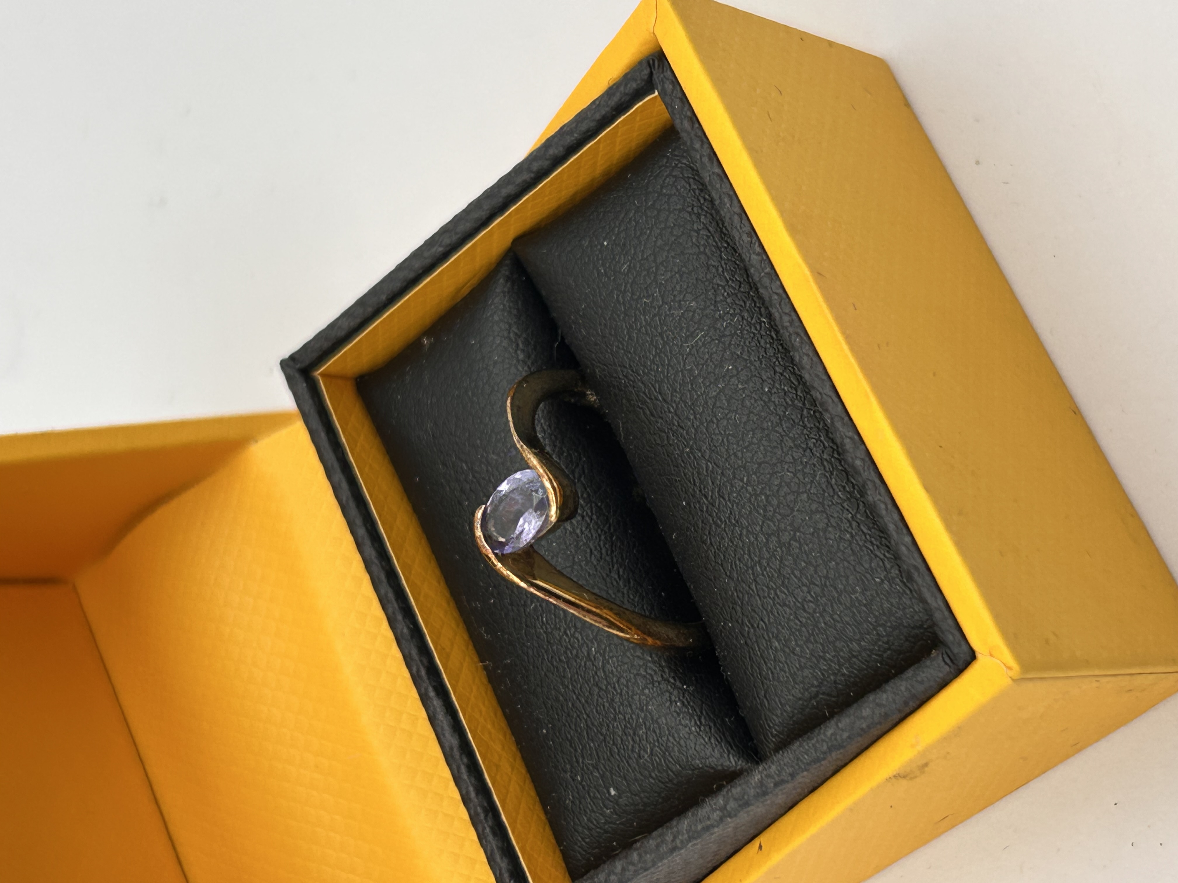 A single bypass-style dress ring constructed of 9ct gold. The ring features a curving shank that rises to secure an oval-cut gemstone of light purple or violet color in a bezel setting. The design suggests a modern or contemporary style. The ring is presented in a bright yellow exterior and black padded interior jewelry box. No hallmarks, inscriptions, or manufacturer markings are visible on the ring.