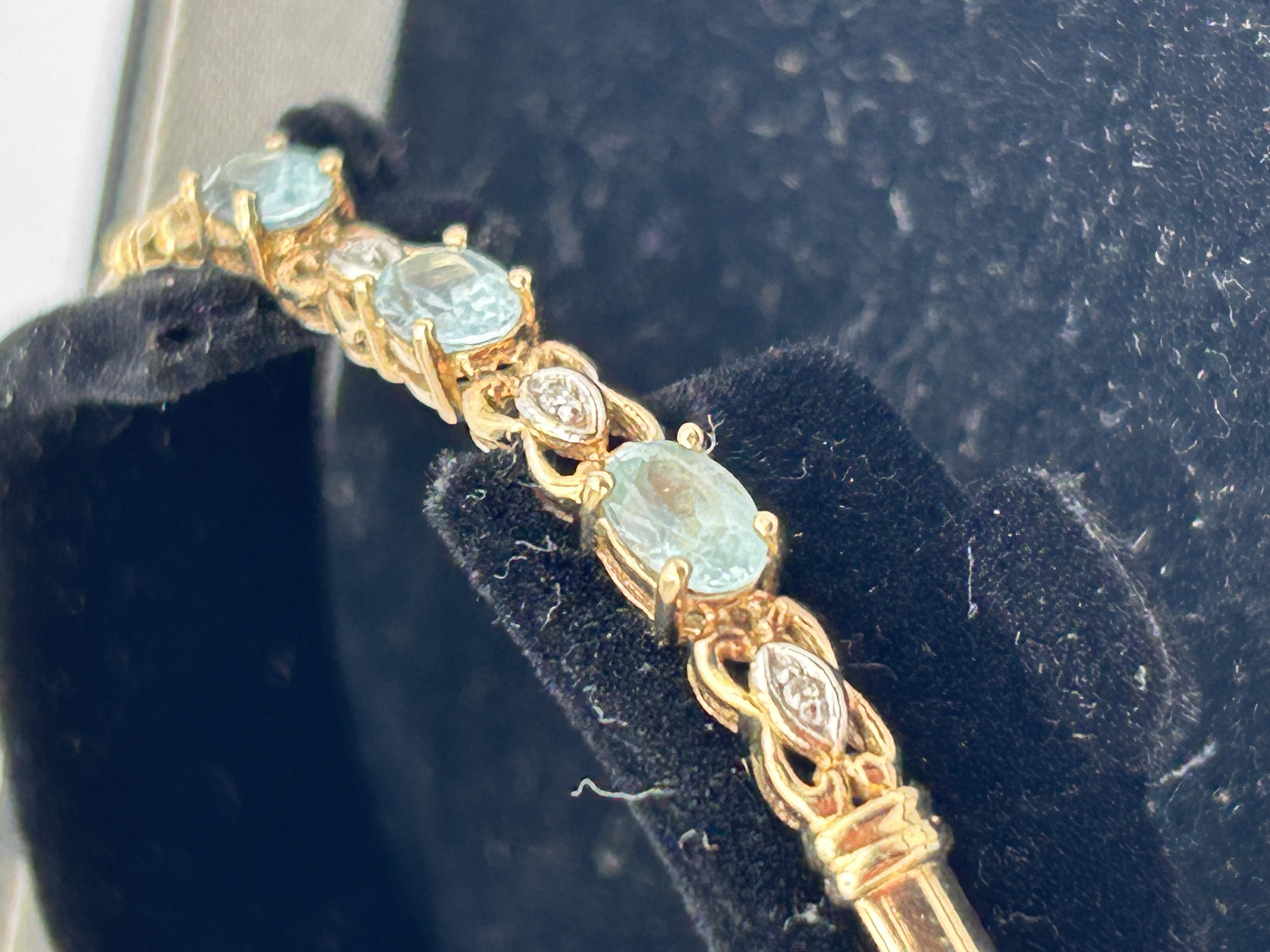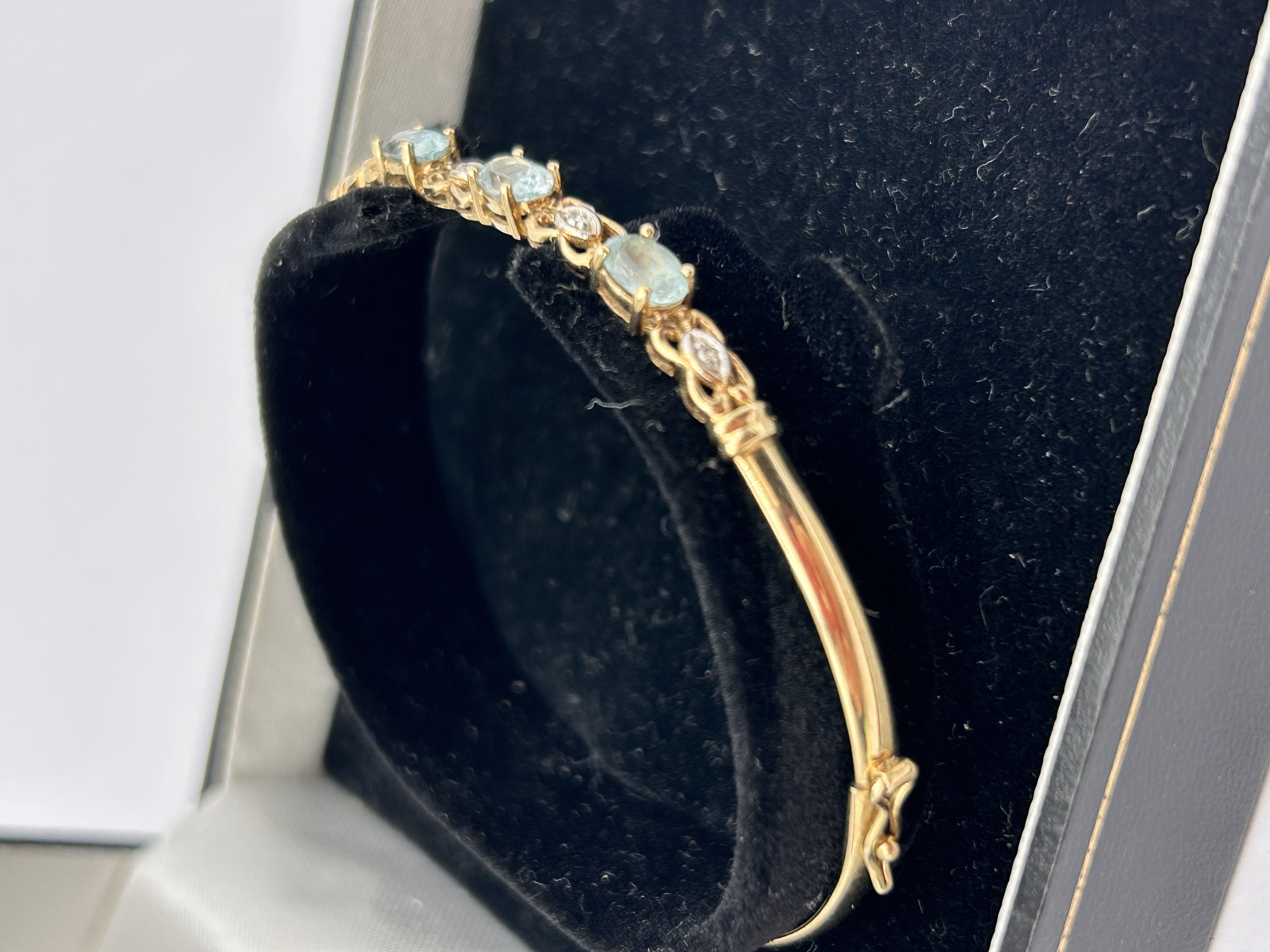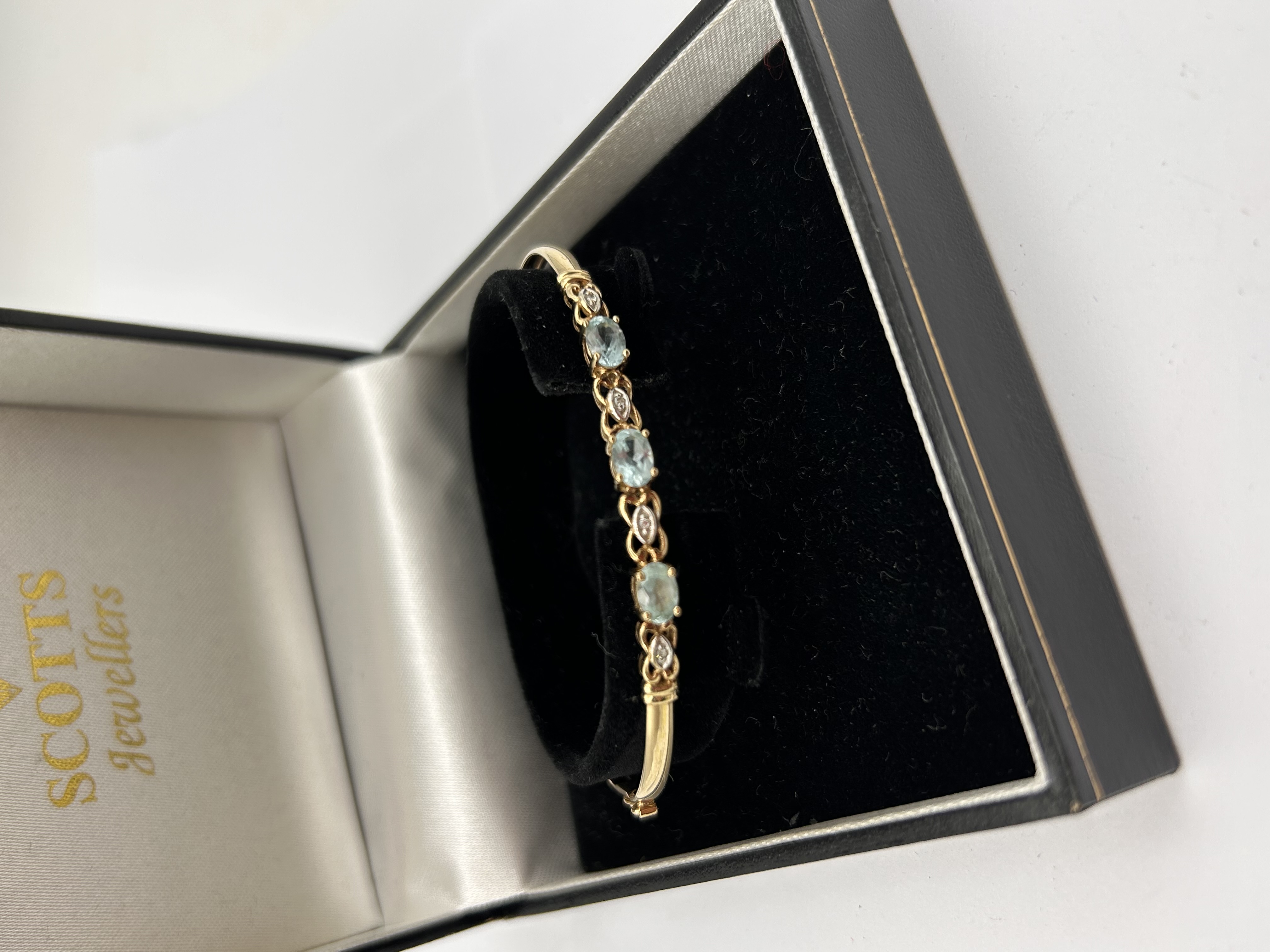 A hinged bangle bracelet constructed of 9ct yellow gold. The central section is set with four oval, faceted aquamarine gemstones. These principal stones are separated by diamond-shaped links featuring scrollwork detail and pave-set diamond accent stones. The bracelet secures via a hinged closure and safety clasp. The piece is presented in a black presentation box with a white satin lining labeled SCOTTS Jewellers. The total weight of the bracelet is 5.1g.