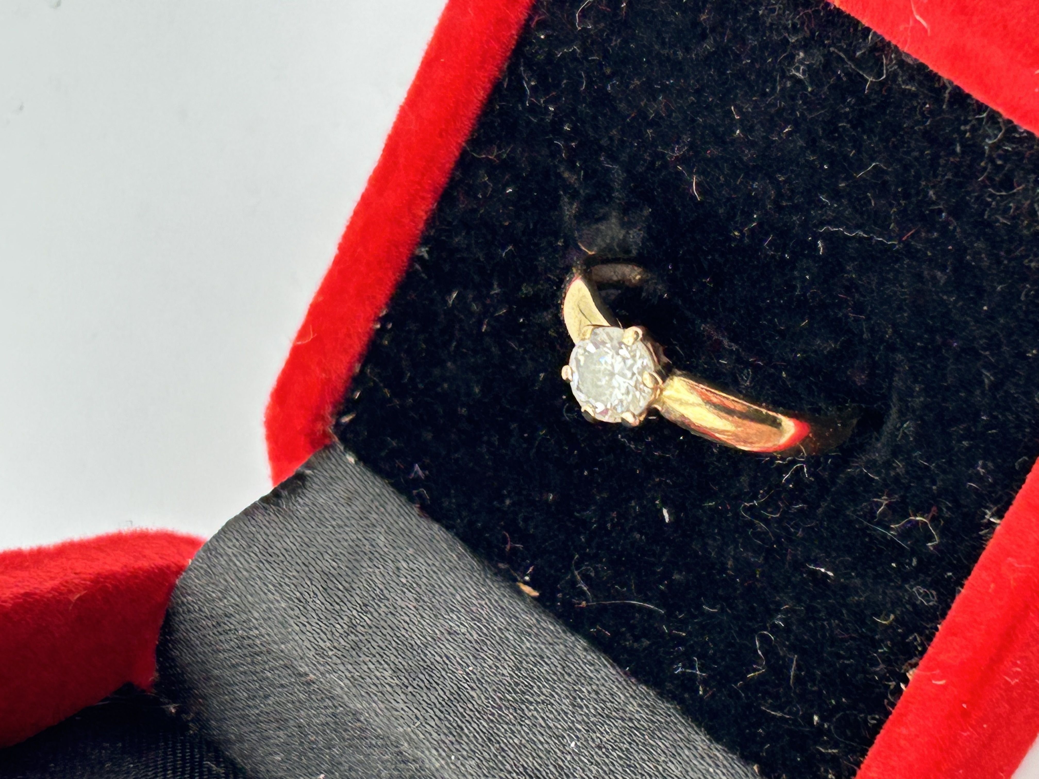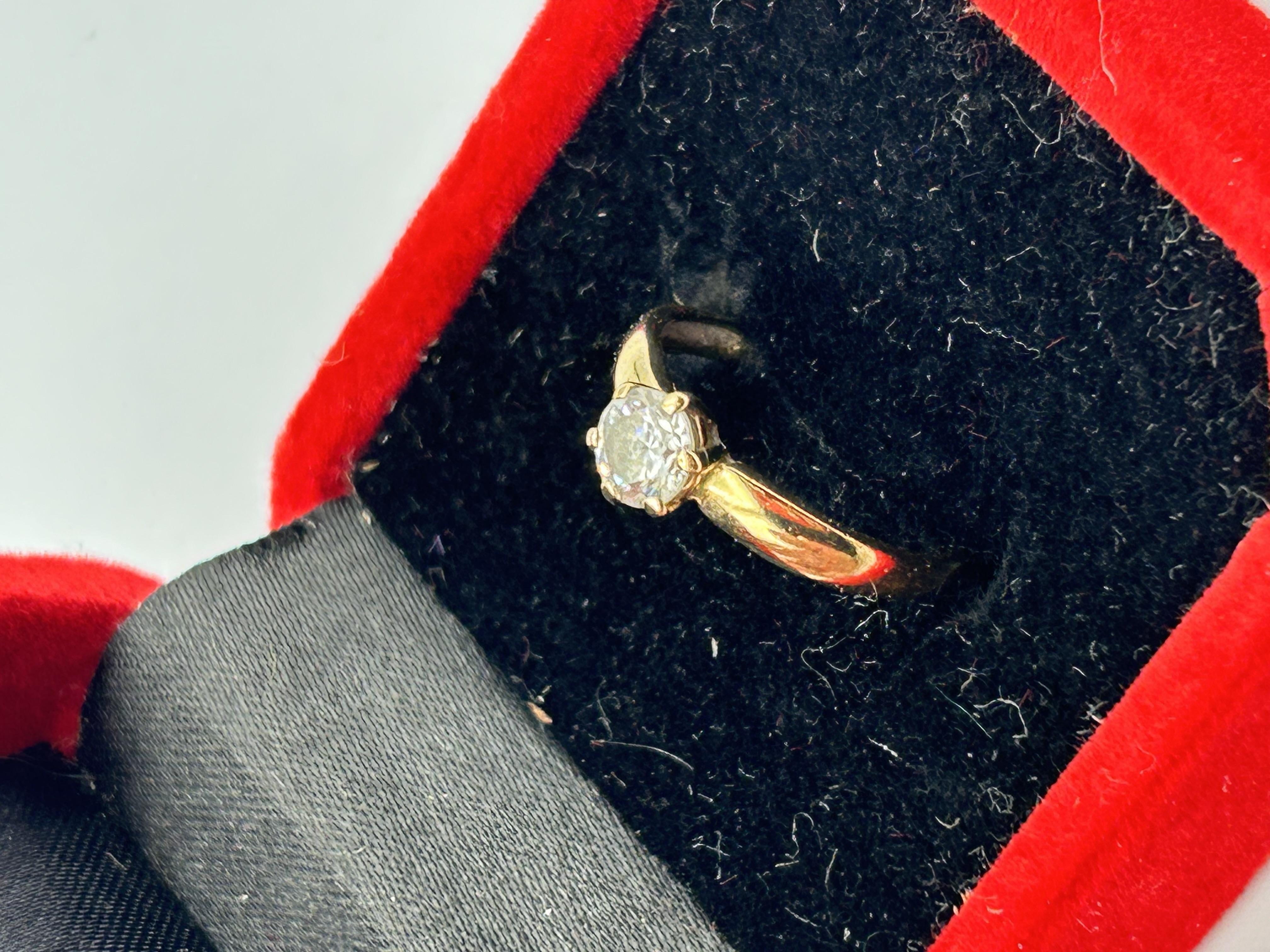 A single solitaire ring crafted in the style of a classic engagement ring. The ring features a polished yellow gold band, attributed as 9ct gold based on market consensus and user specification. The band holds a single, round brilliant-cut stone secured by a six-prong setting. Per user-provided facts, the stone is confirmed to be Cubic Zirconia (CZ). The ring is presented in a red velvet exterior box with a black velvet lining.