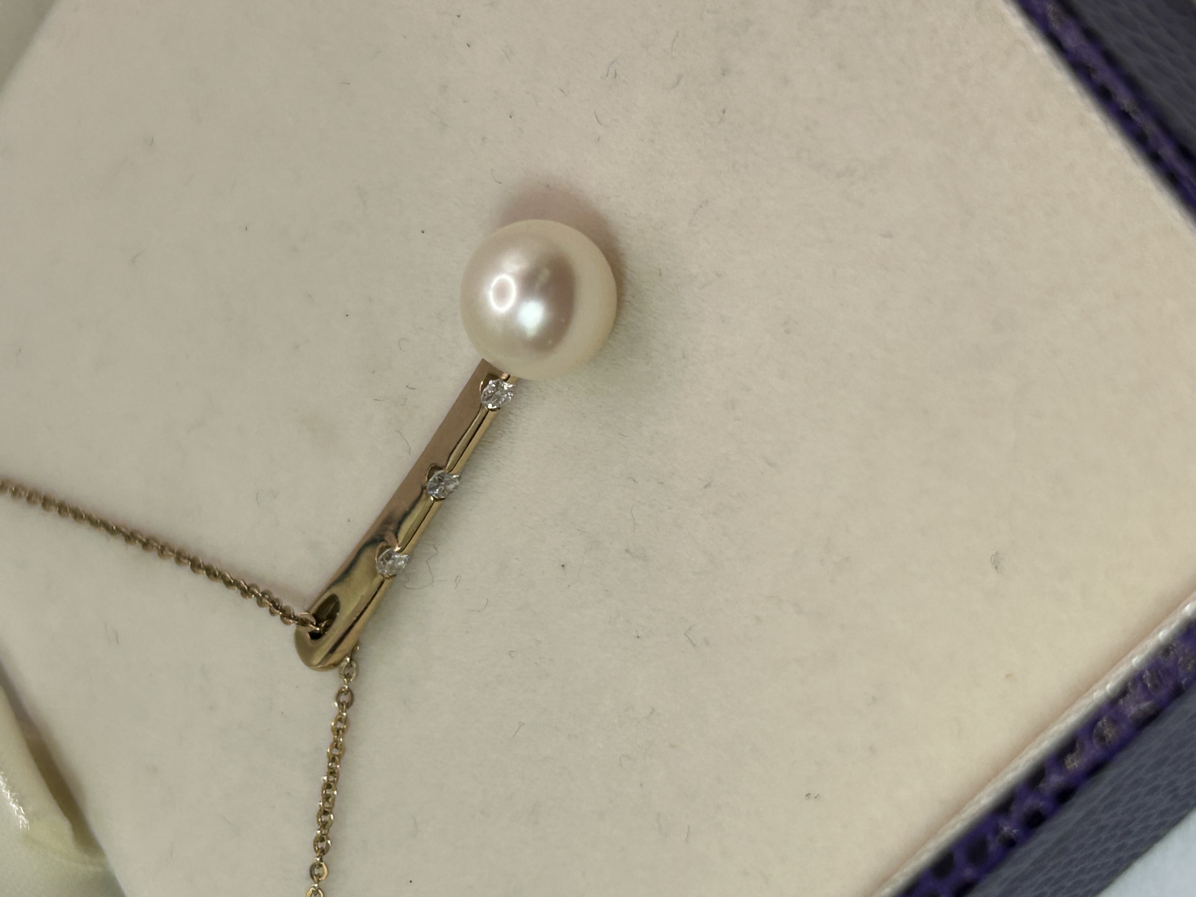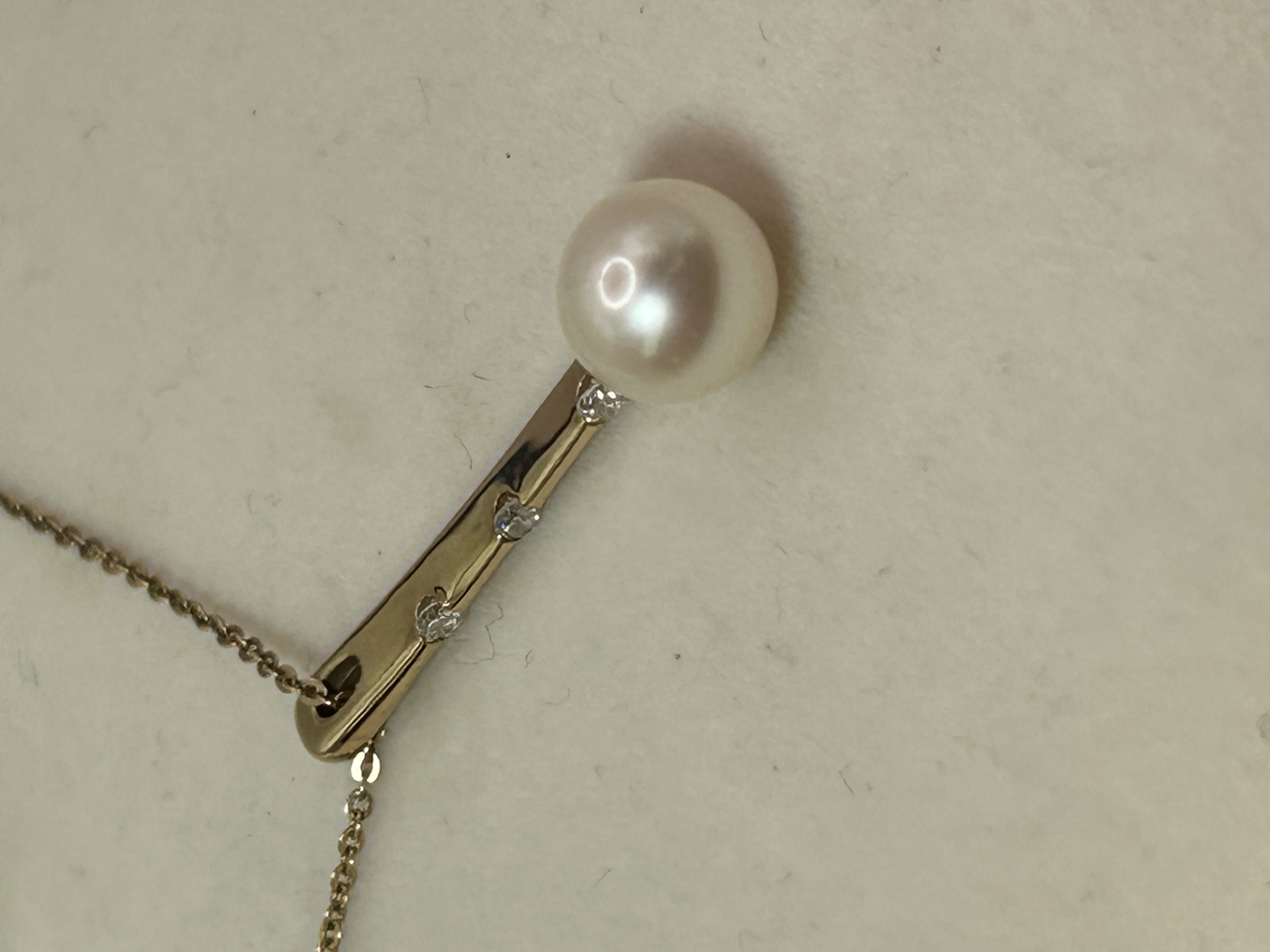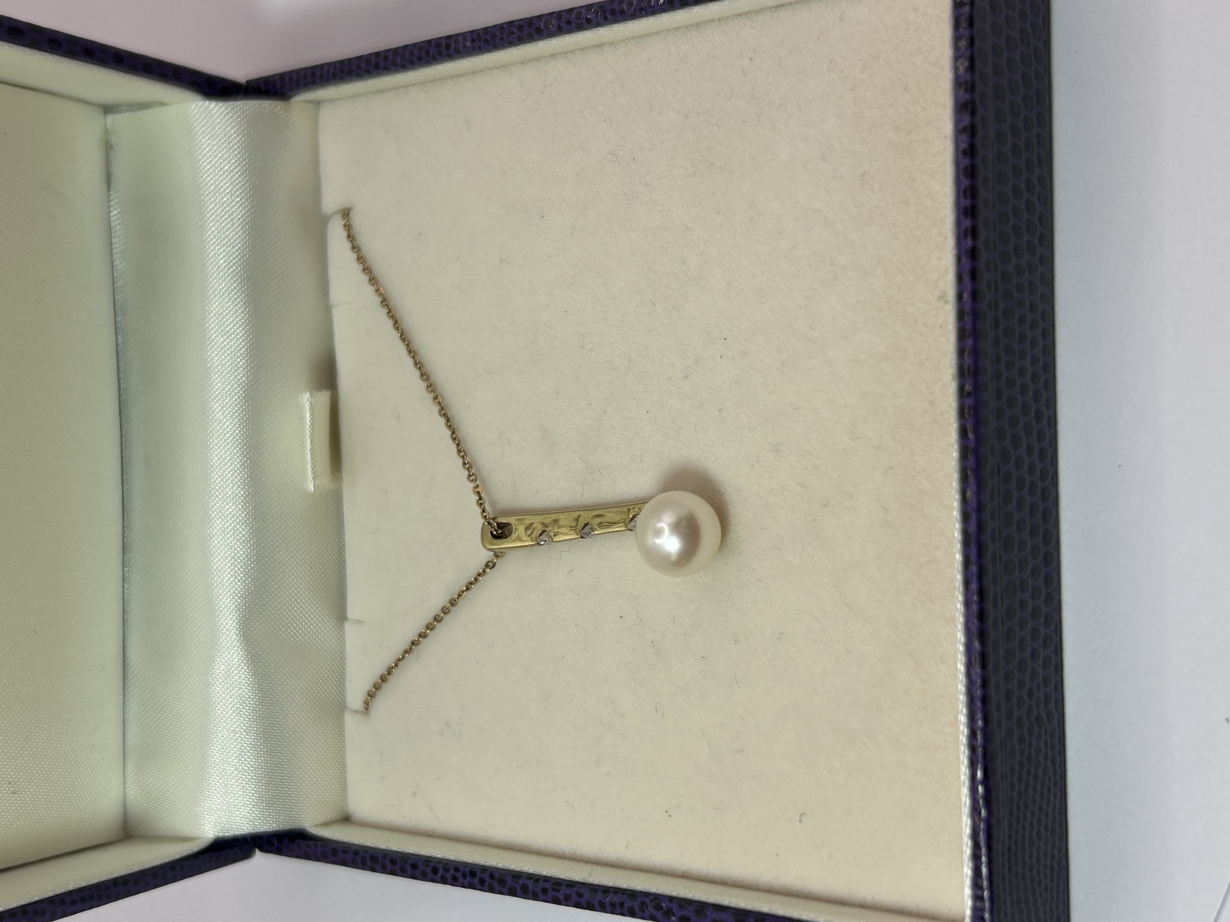 A single pendant necklace featuring a delicate link chain supporting a vertical bar pendant. The metal is gold, identified as 9ct based on market consensus and user-provided keywords. The pendant bar is set with three round-cut Diamond stones arranged vertically along the face. Affixed to the lower terminus of the bar is a single, spherical Pearl. The overall style is contemporary and minimalist. The item is understood to weigh 2.4 grams based on user-provided data.