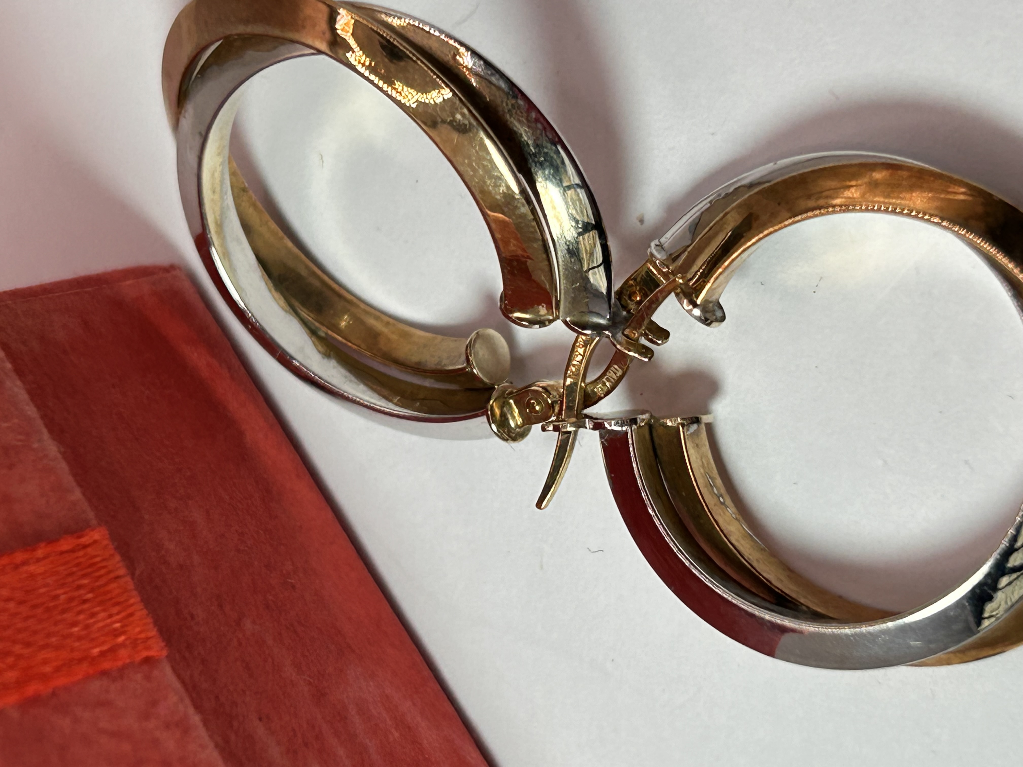 A pair of hoop earrings constructed of White, Yellow Gold, confirmed to be 14K based on market consensus for visually identical items. The earrings feature a wide, flattened profile with alternating bands of white and yellow gold twisted around the circumference, creating a two-tone effect. They utilize a hinged, latch-back closure mechanism. The items are stamped “ITALY” on the hinge component, indicating their country of origin. The total weight of the pair is approximately 2.8g.