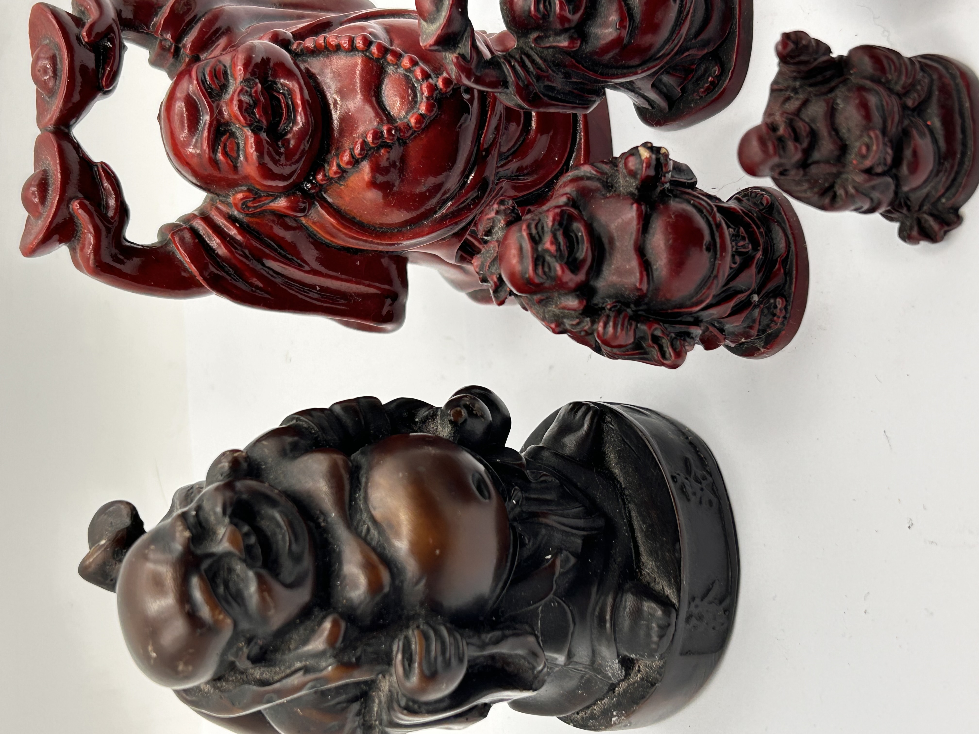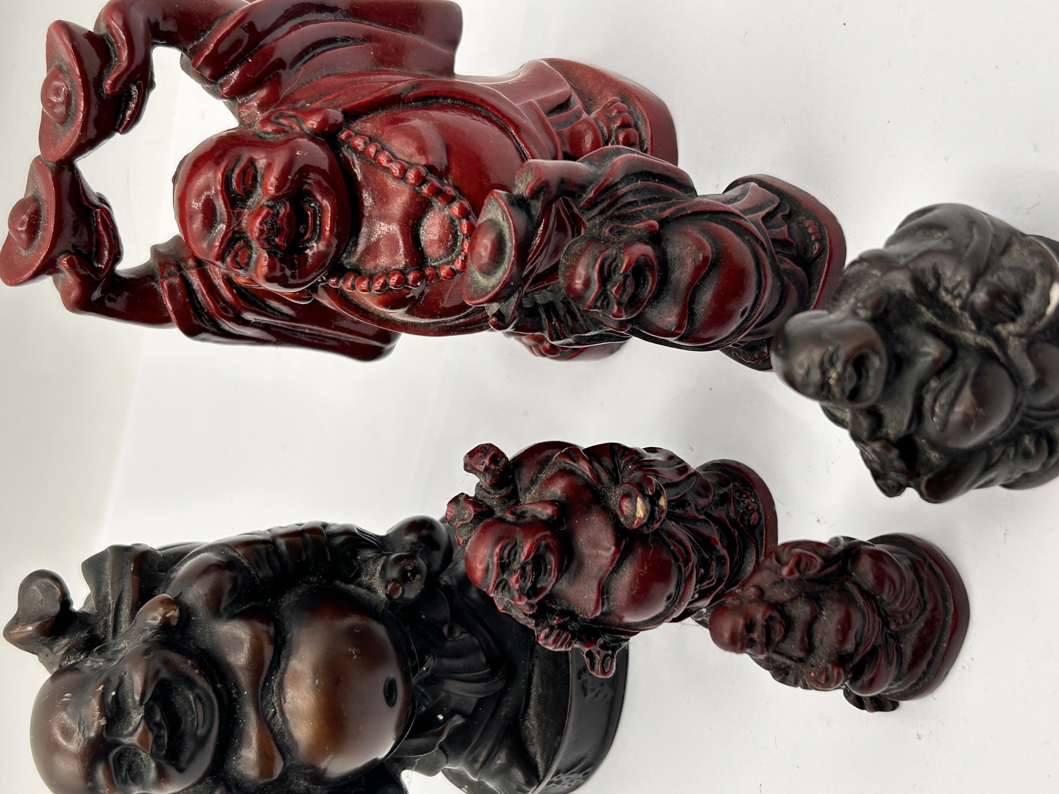 A collection of six decorative figurines depicting Budai, the Laughing Buddha, executed in molded resin or a similar composite material. The collection includes two distinct finishes: two figures are finished in a dark reddish-brown or faux-bronze tone, and four figures are finished in a high-gloss, deep red lacquer-like color. The figures are presented in varying sizes and poses consistent with traditional iconography, emphasizing prominent bellies and joyous expressions. The largest red figure is depicted holding two sycee ingots above its head. No maker’s marks or inscriptions are visible.