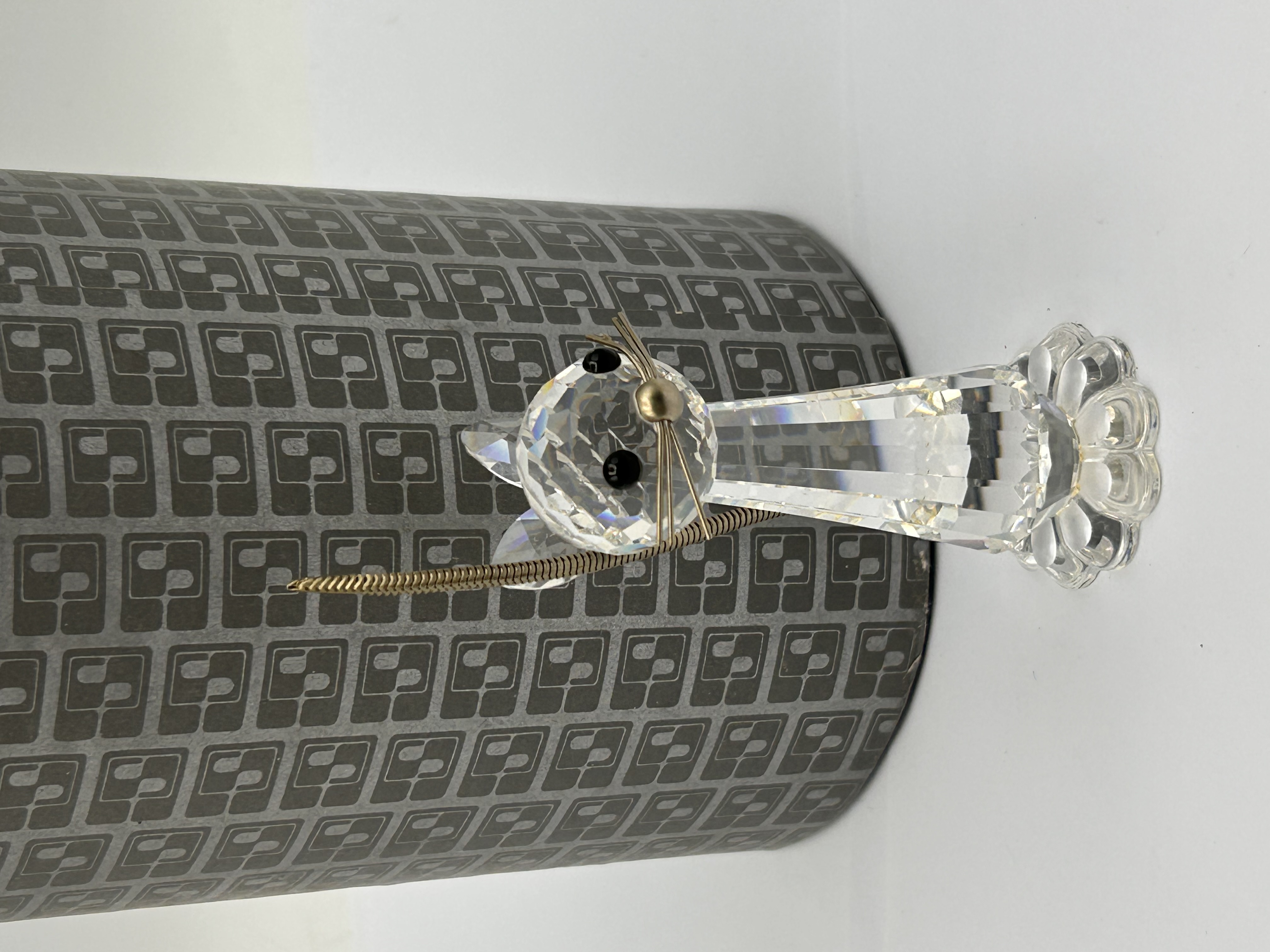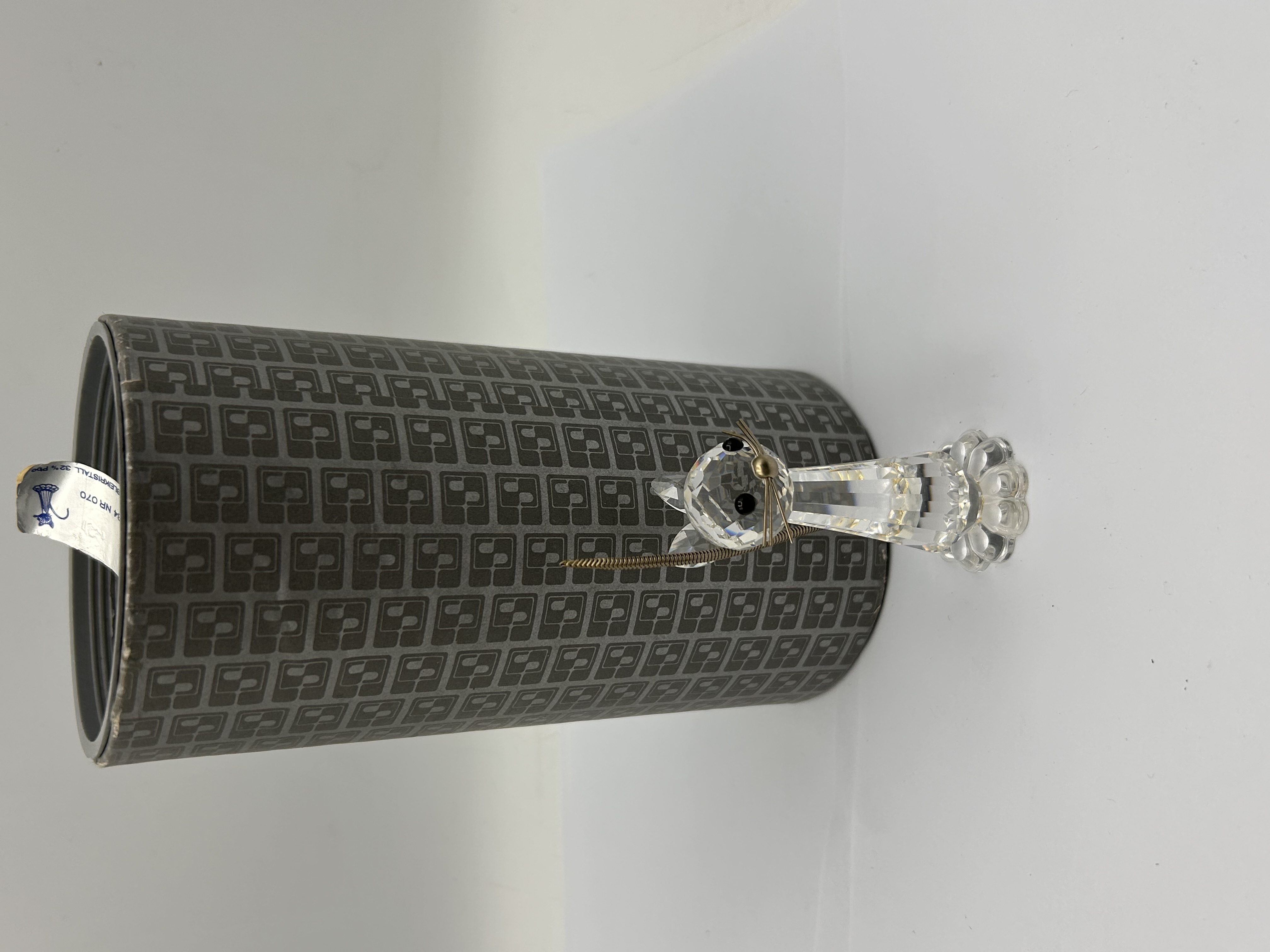 A lot comprising a Swarovski crystal cat figurine and its original presentation case. The figurine is crafted from highly-faceted clear crystal, depicting a stylized cat standing on a flared, lobed base. The facial features include black bead eyes, a brass-toned metal bead nose, and thin coiled brass-toned wire forming the whiskers and an upturned tail. The accompanying cylindrical case is constructed of paper or cardboard and features a dark gray repeating geometric pattern. A partial inventory label marked “022 070” is visible on the case.