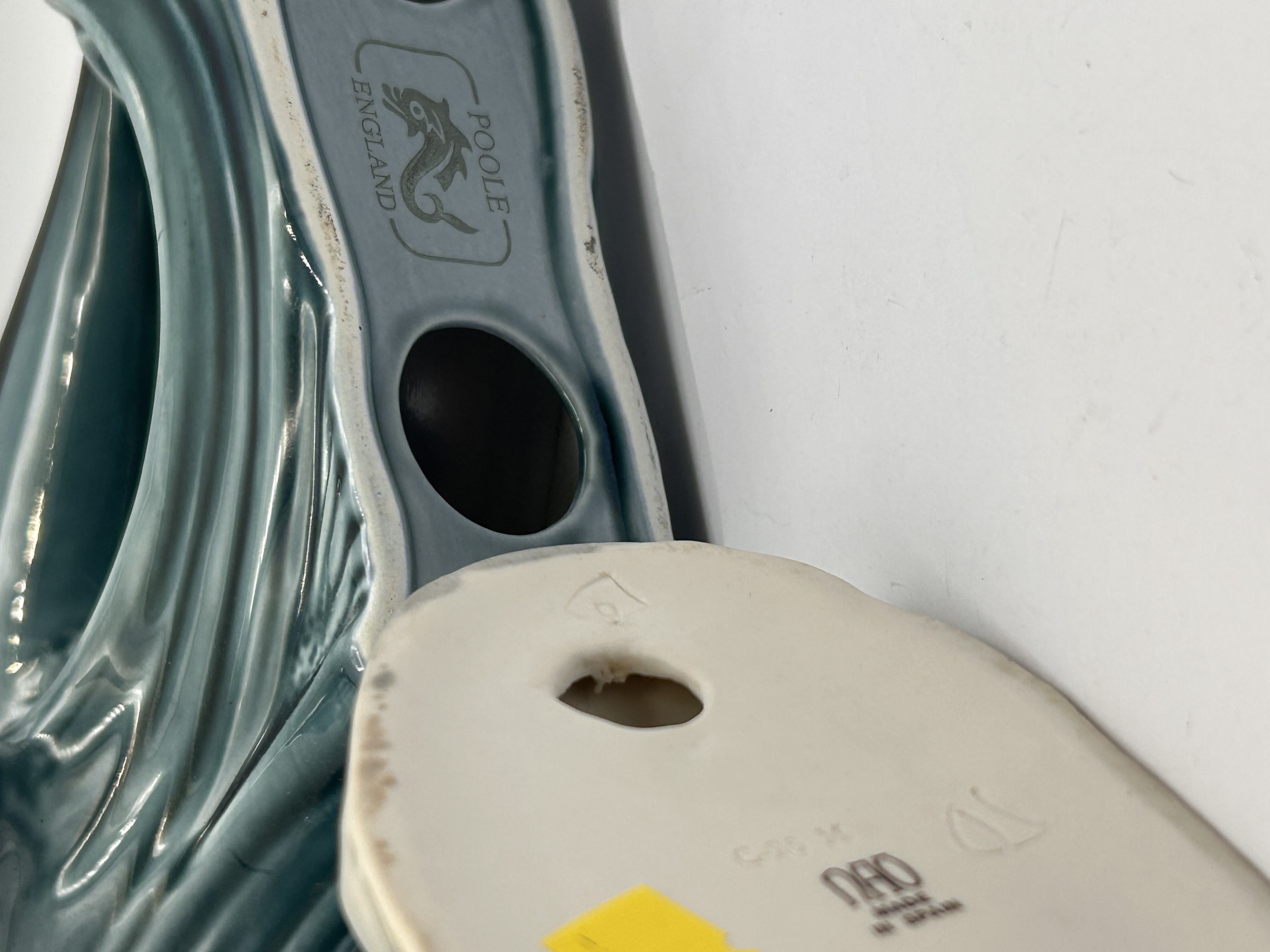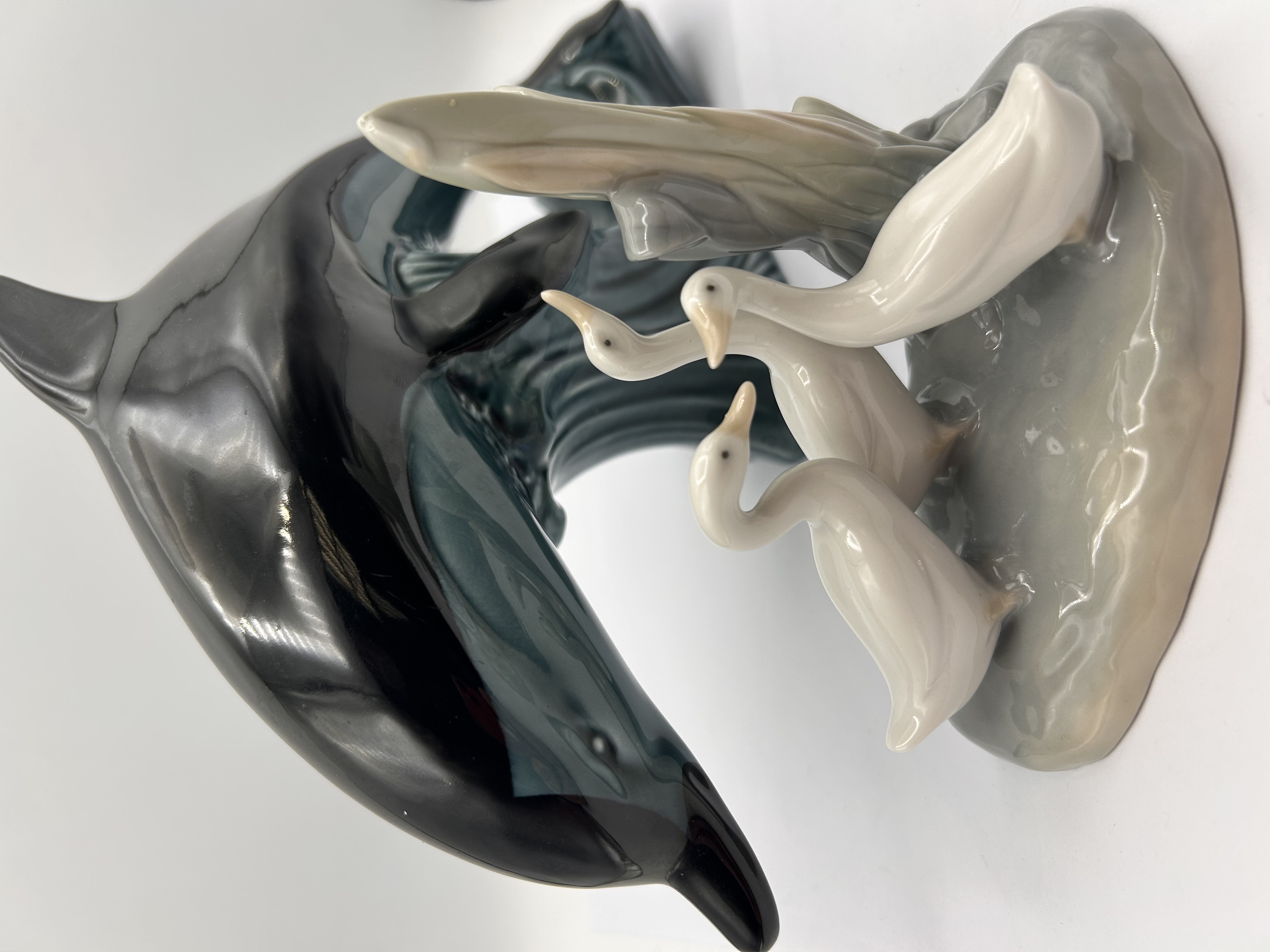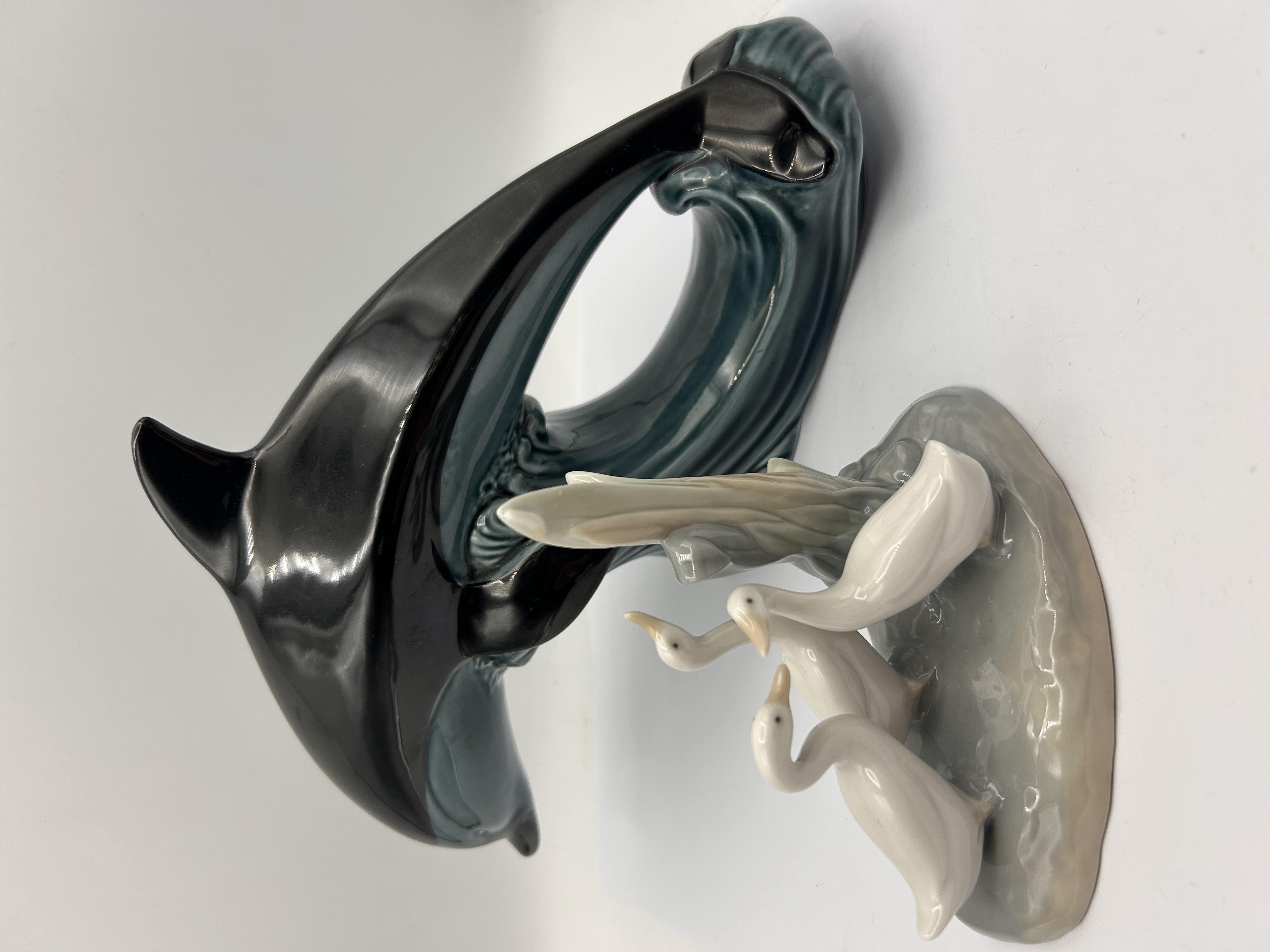 This lot comprises two separate glazed ceramic figurines. The first is a Poole Pottery sculpture depicting a large black dolphin leaping over a molded wave rendered in a deep teal-blue glaze. The inverted base of this item is marked with the Poole Pottery seahorse logo, along with the stamped text POOLE and ENGLAND, confirming its 20th-century origin. The second item is a smaller figurine, attributed to Nao (Lladro Group), featuring three creamy white geese or ducks standing on a mottled grey and brown base adjacent to a pale vertical stump or reed grouping. The inverted base of the geese figurine shows faint molded or stamped markings including a stylized initial or code DAO.