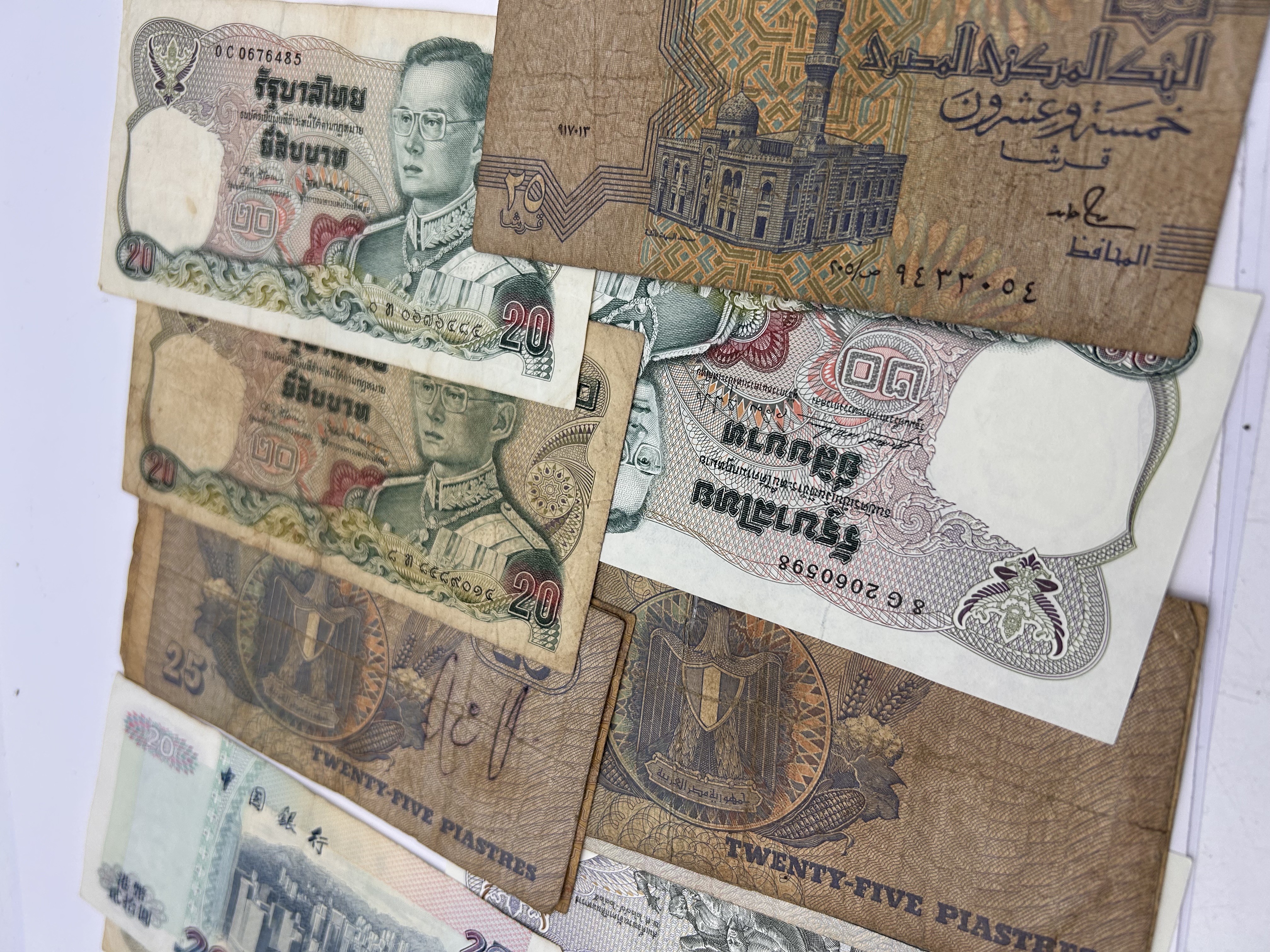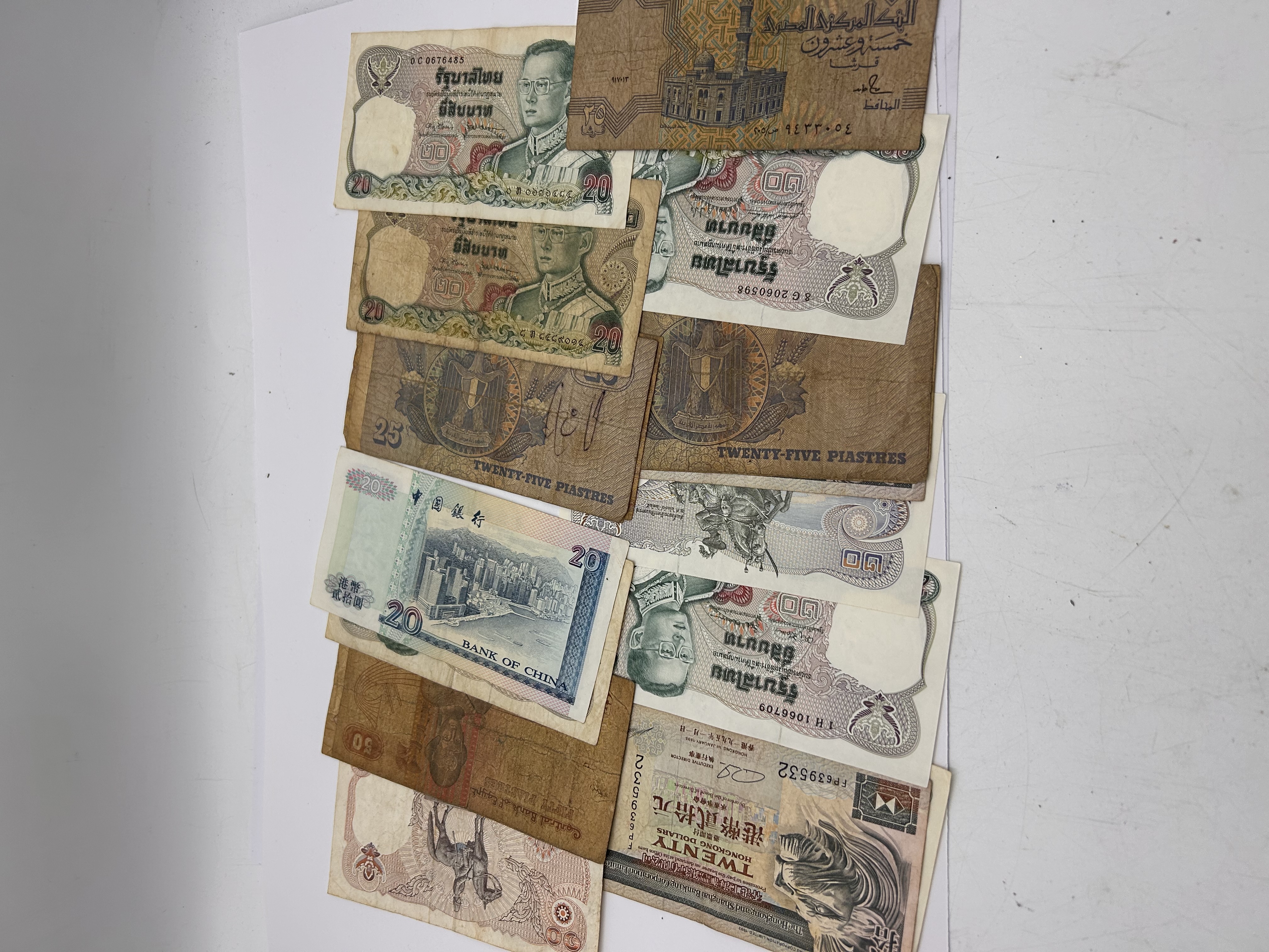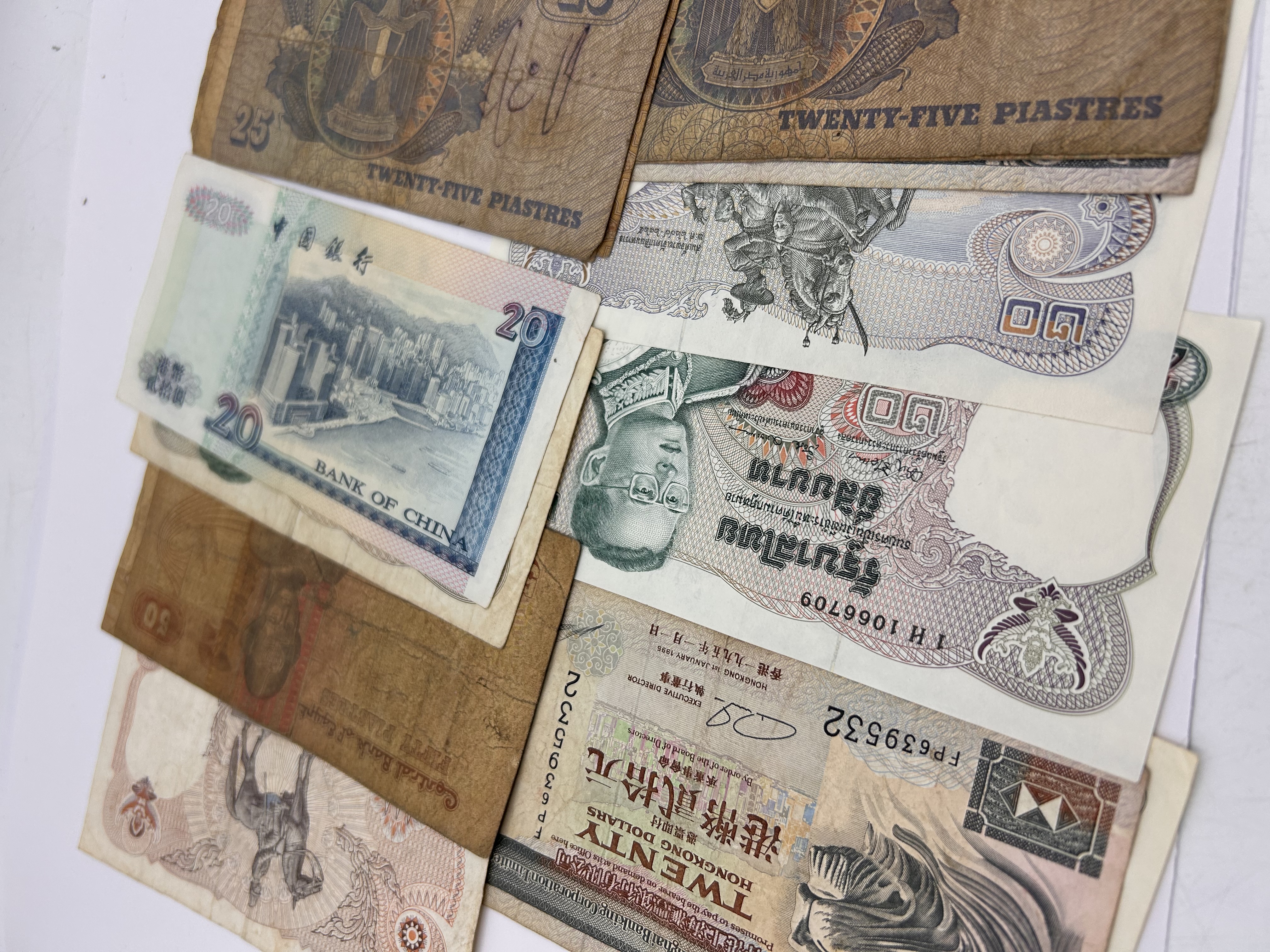 A collection of twelve assorted international paper currency banknotes, primarily featuring issues from Southeast Asia and East Asia. The collection includes notes from various issuing authorities and denominations. Visible notes include a Hong Kong TWENTY DOLLARS note (bearing serial number FP639532), a BANK OF CHINA 20 note, and multiple notes issued by the Government of Thailand (รัฐบาลไทย) featuring the portrait of King Bhumibol Adulyadej, in denominations of 20 and 50. The lot also contains at least two older colonial notes marked TWENTY-FIVE PIASTRES, consistent with research suggesting the inclusion of currencies related to French Indochina, Cambodia, and Burma in similar assorted lots. The notes are constructed of currency paper.