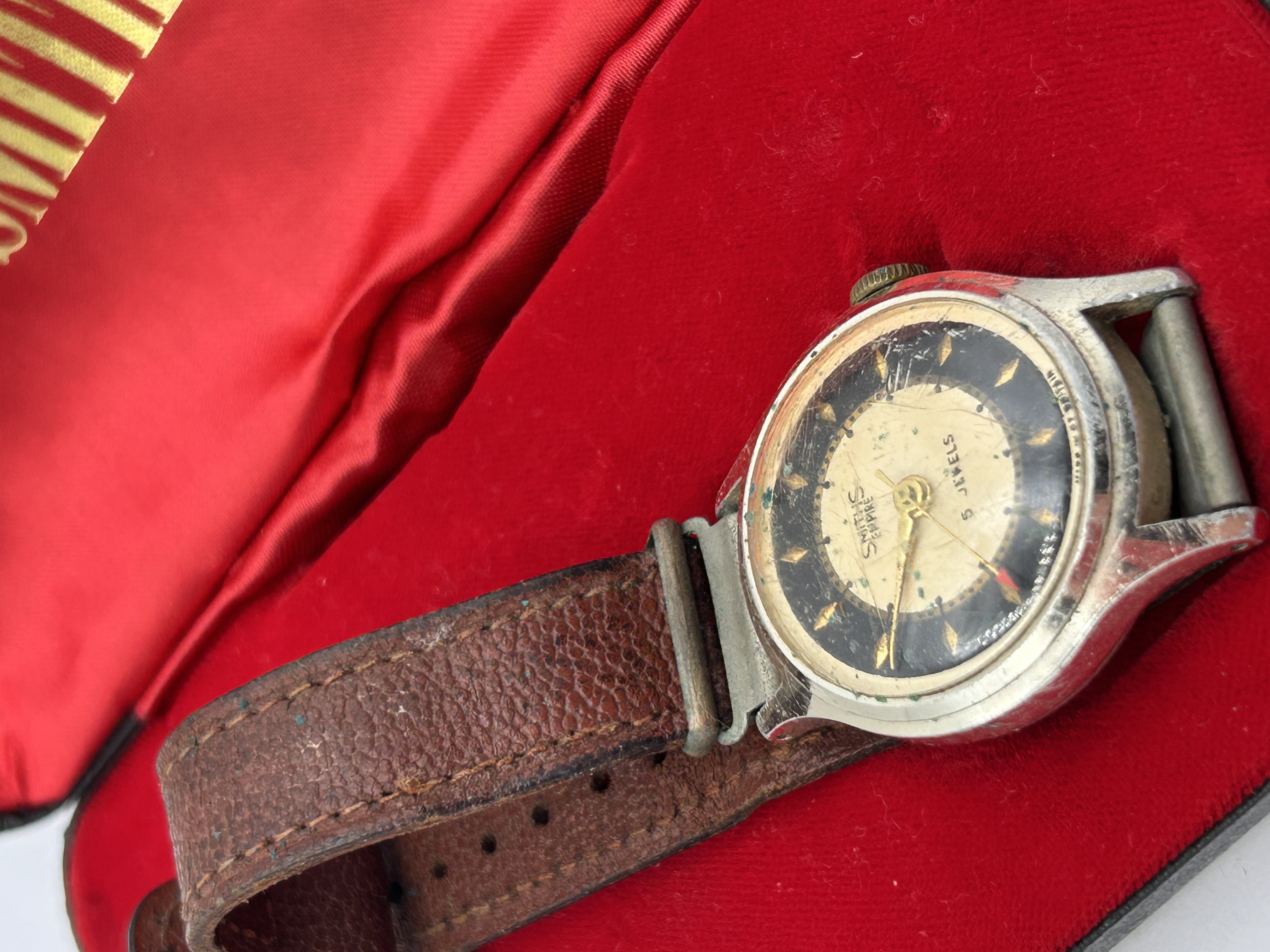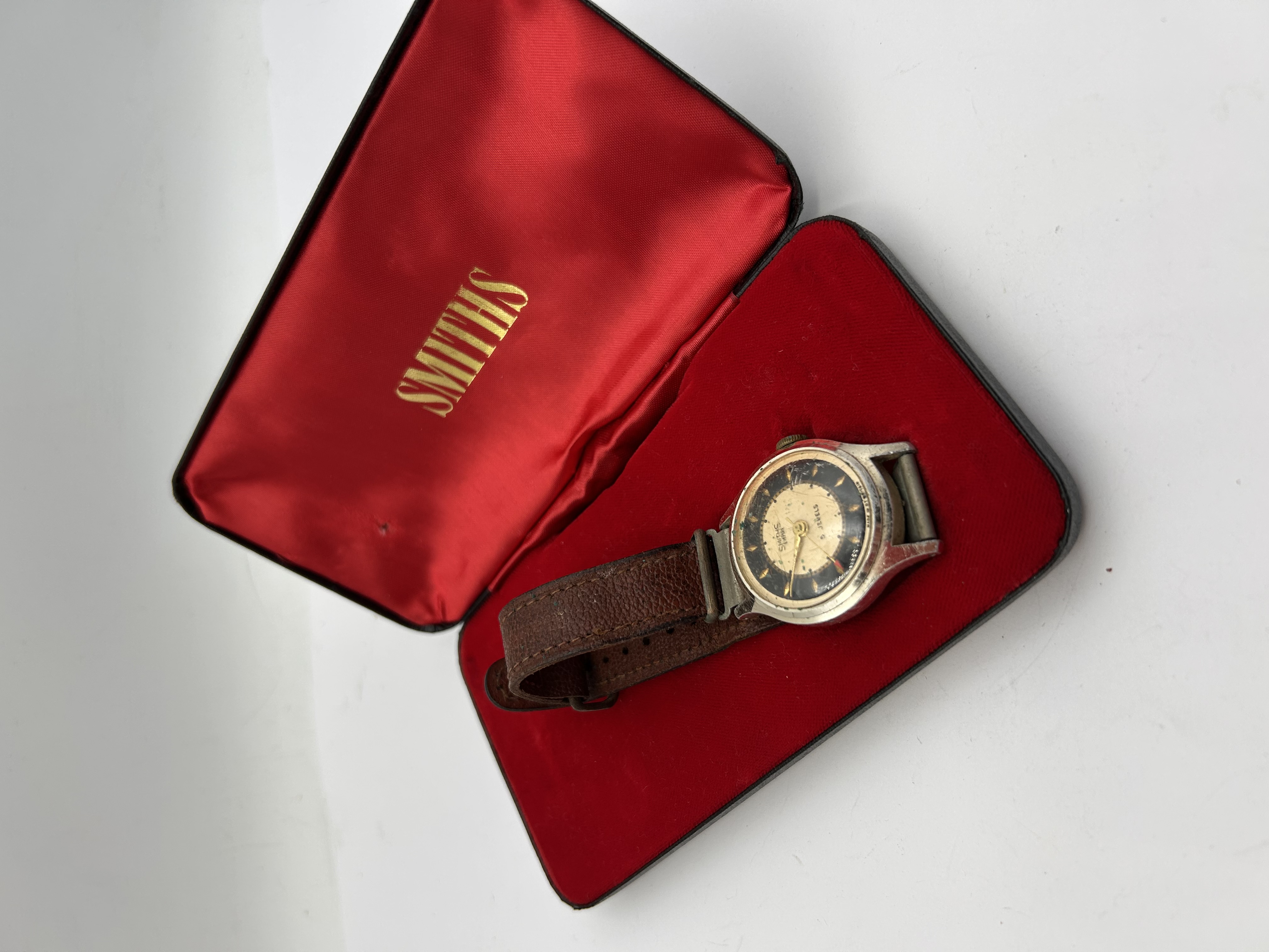 A vintage Smiths Empire manual wind wristwatch, likely dating to the 1950s, presented in its original black and red hinged presentation box. The watch features a silver-tone base metal case and a two-tone circular dial with a black chapter ring and a cream/gold center. The dial displays gold-tone hands and is inscribed “SMITHS EMPIRE,” “5 JEWELS,” and “MADE IN GT BRITAIN” at the lower edge. The watch is fitted with a brown textured leather strap. The interior of the presentation box is lined with red satin, gold-stamped “SMITHS” on the lid, and includes a red velvet cushion insert.