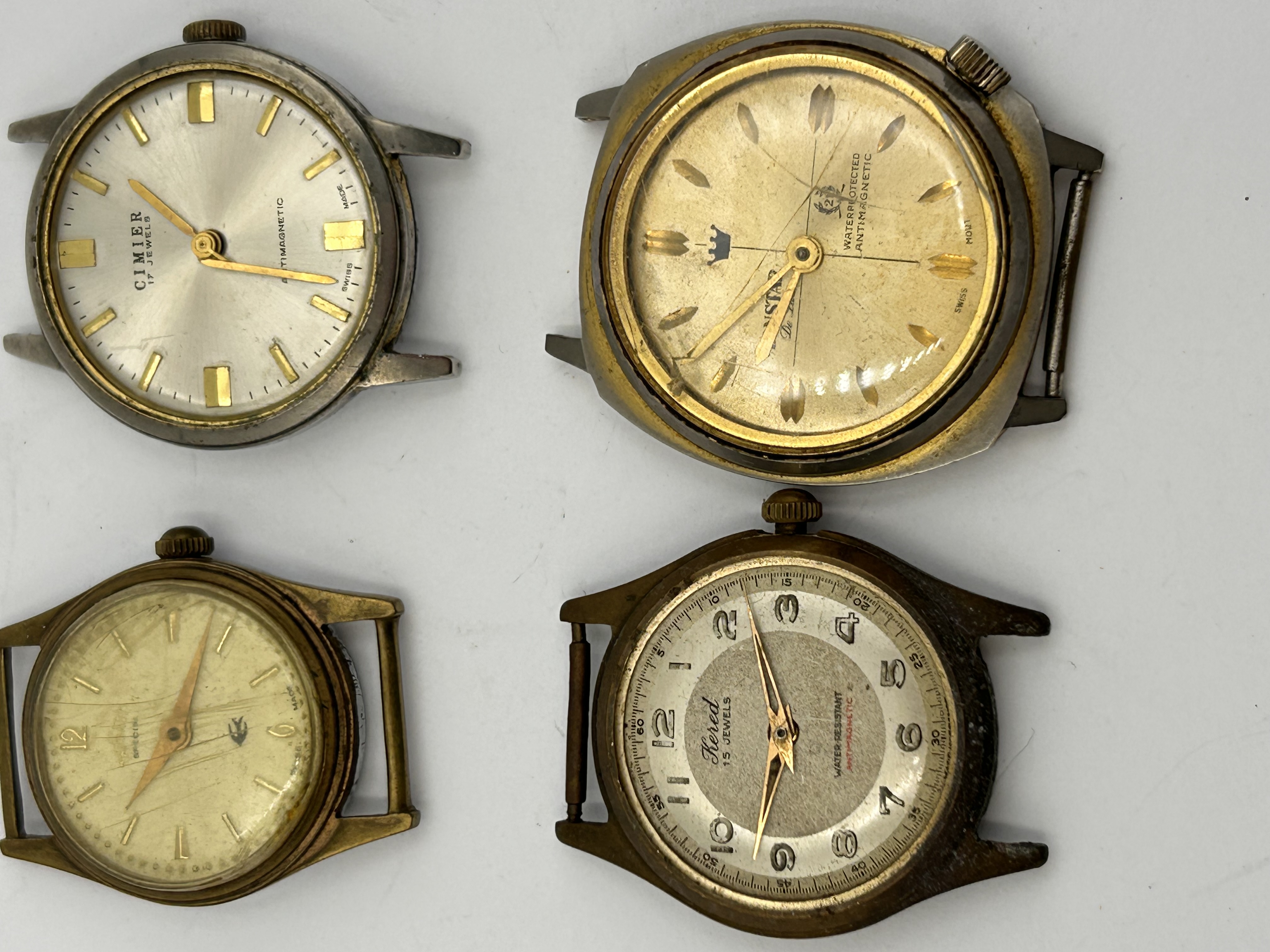 A collection of four vintage mechanical wristwatch heads, lacking straps. The watches are marked with various Swiss or Swiss-movement brands typical of mid-20th century production. The collection includes: one watch marked CIMIER 17 JEWELS ANTIMAGNETIC SWISS MADE, featuring a silver sunburst dial and base metal case; one watch marked Kered 15 JEWELS WATER RESISTANT ANTIMAGNETIC, featuring a two-tone silver and aged dial in a heavily tarnished base metal case; one watch marked ANSTAR WATERPROTECTED ANTIMAGNETIC SWISS MOVT, featuring an aged gold dial and base metal case; and a fourth watch marked Brevetta Patented 17 Rubis, featuring an aged gold dial and brass case. All watches feature round dials and base metal or brass construction.