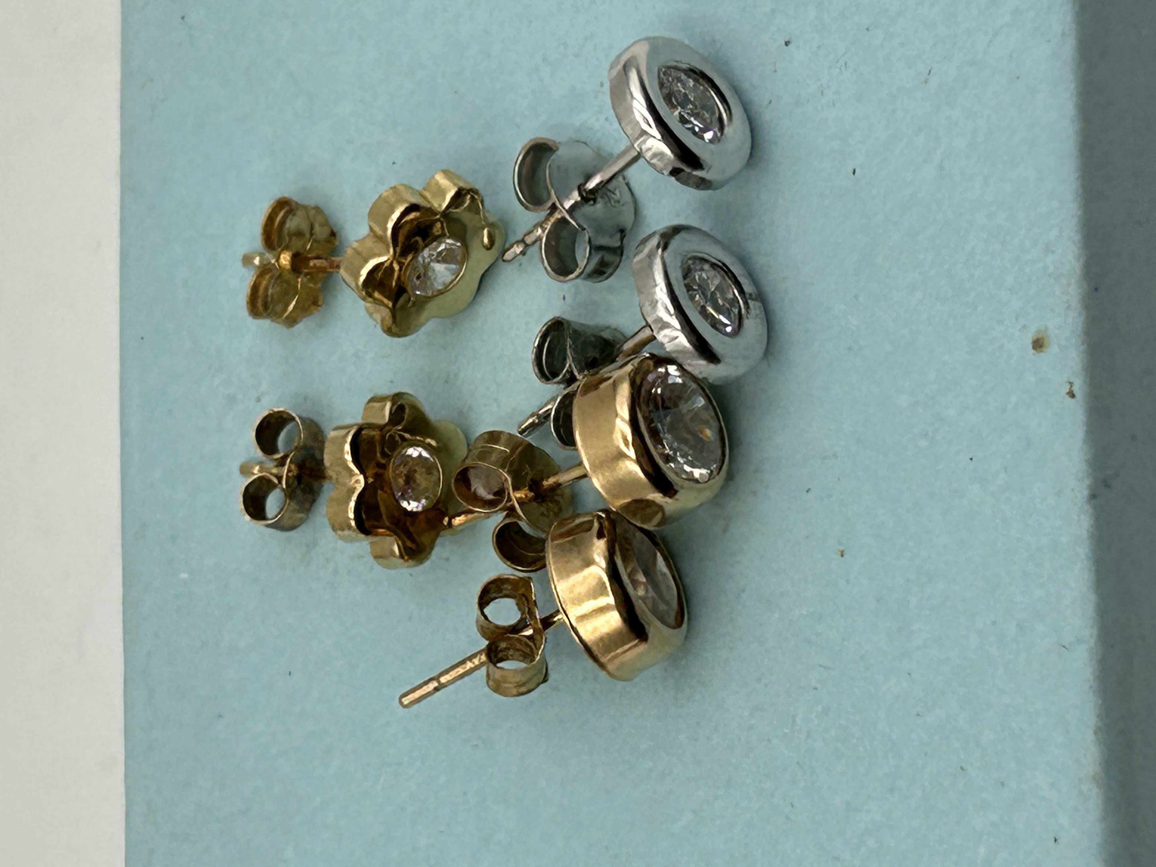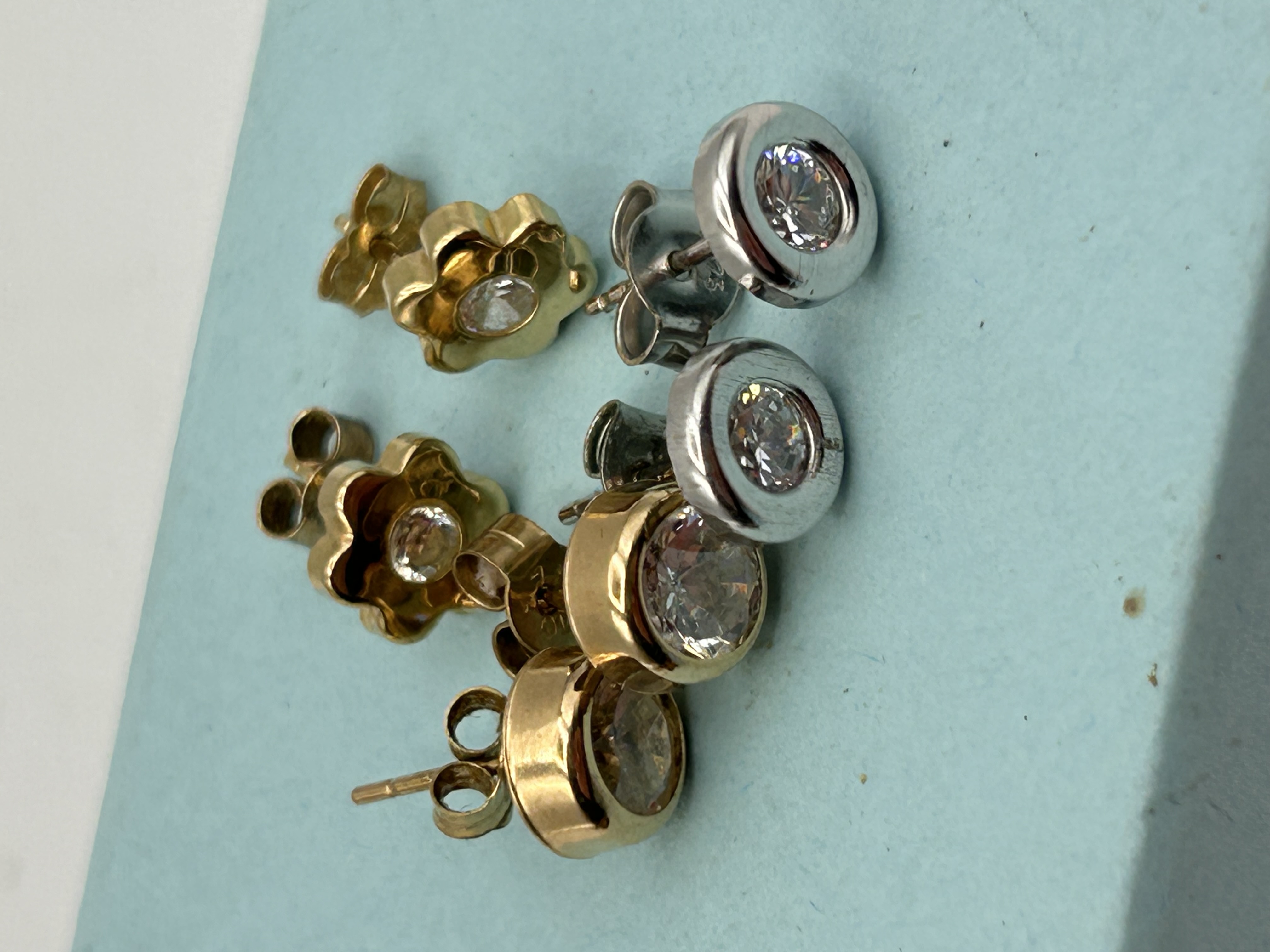 A collection of three pairs of stud earrings, totaling six individual studs and six corresponding butterfly backs. The lot includes two pairs constructed from yellow-toned metal and one pair constructed from white-toned metal. All earrings feature colorless, brilliant-cut stones secured by full or partial bezel settings. The designs comprise a pair of round bezel studs, a pair of floral/petal-shaped studs (both yellow metal), and a pair of oval bezel studs (white metal). Research suggests similar items are commonly marketed as 14K gold plated or lower karat gold, set with lab-created diamonds or cubic zirconia. No specific hallmarks or textual inscriptions are visible on the exterior surfaces.