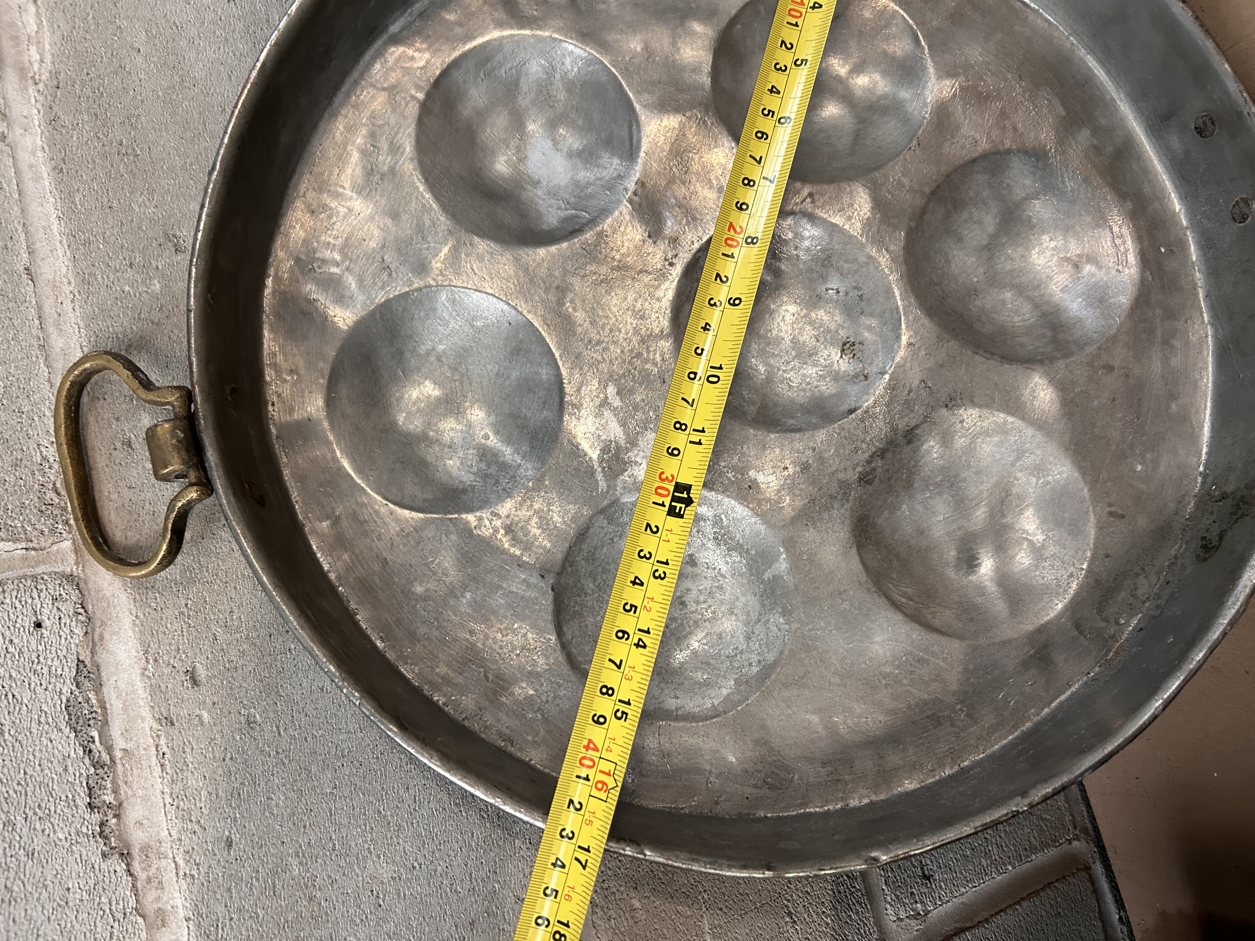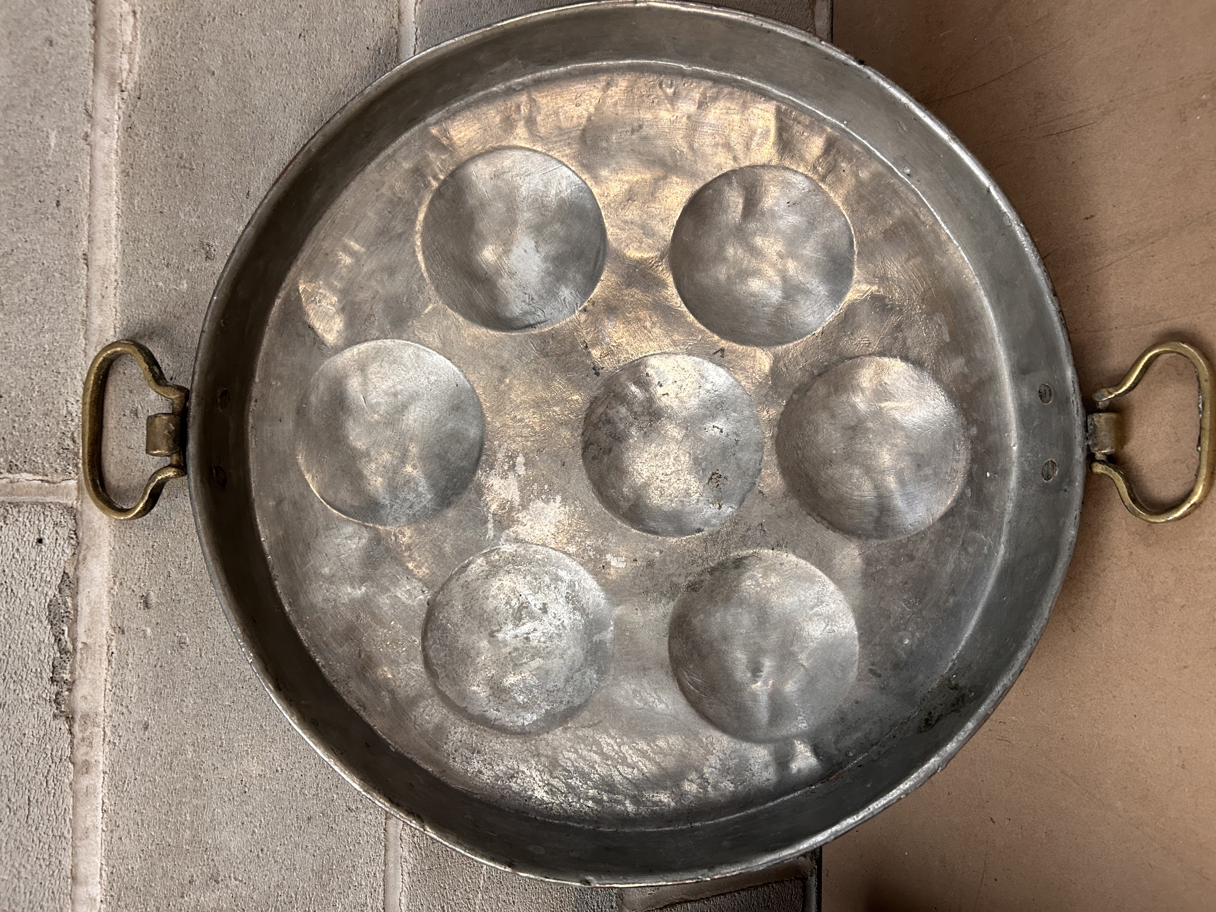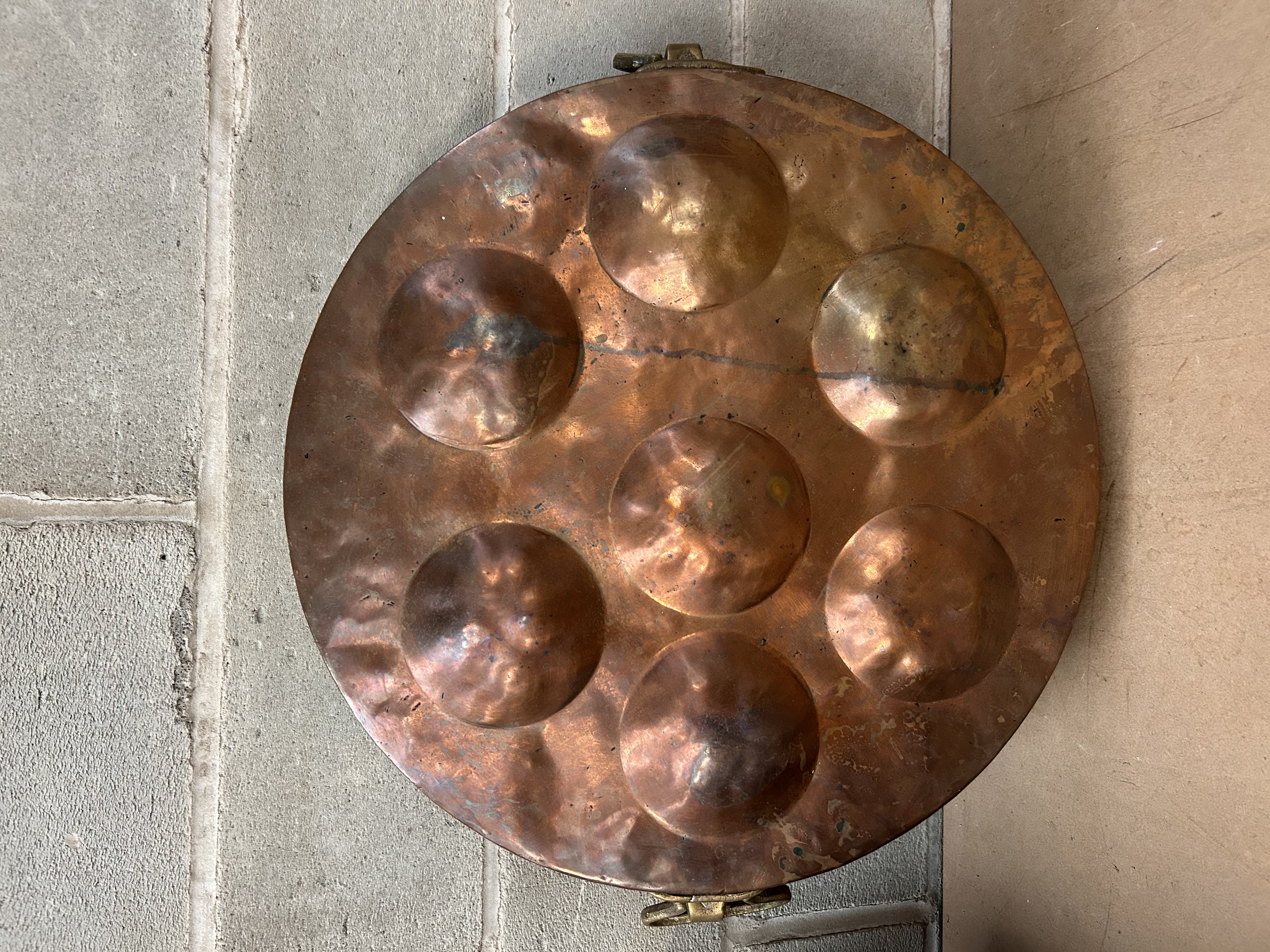 A specialized cooking vessel identified in the market as a French copper escargot and egg poacher pan. The circular pan is constructed of hammered copper with a tinned interior lining. It features seven deep, circular depressions, arranged in a pattern of two, three, and two, intended for specific baking or poaching preparations. Opposing loop handles, constructed of brass or bronze, are affixed to the rim. No discernible maker’s marks or inscriptions are visible.