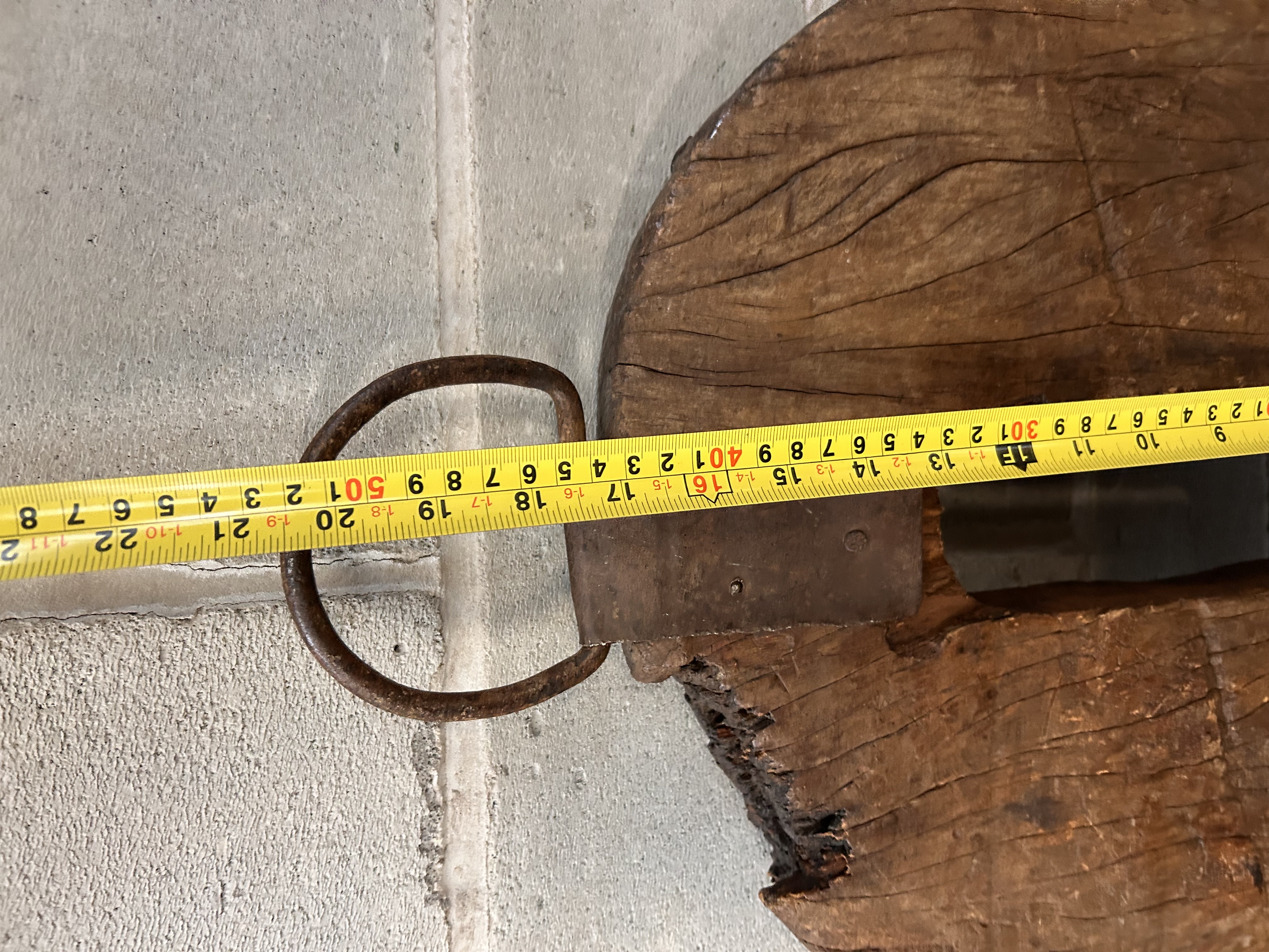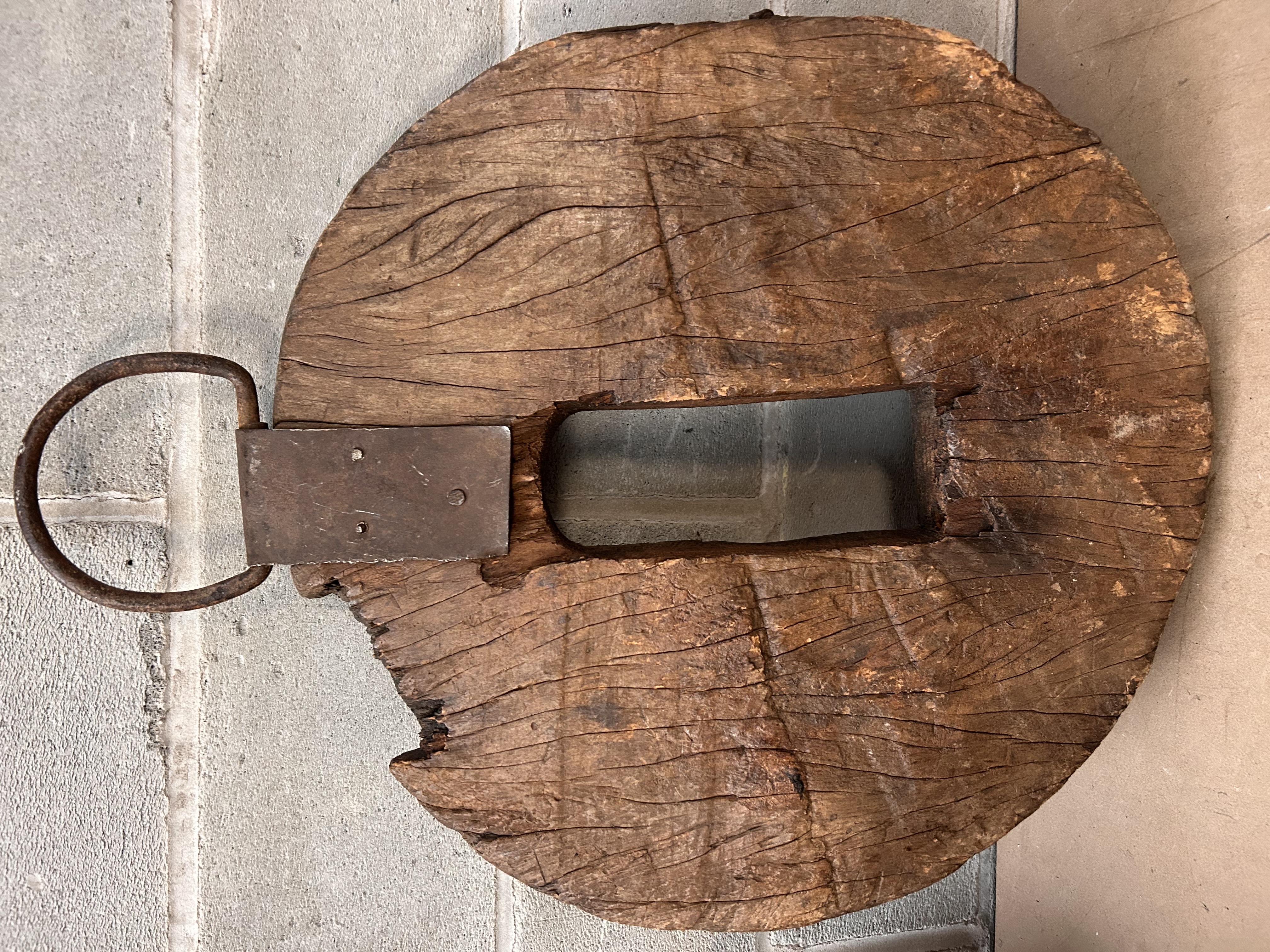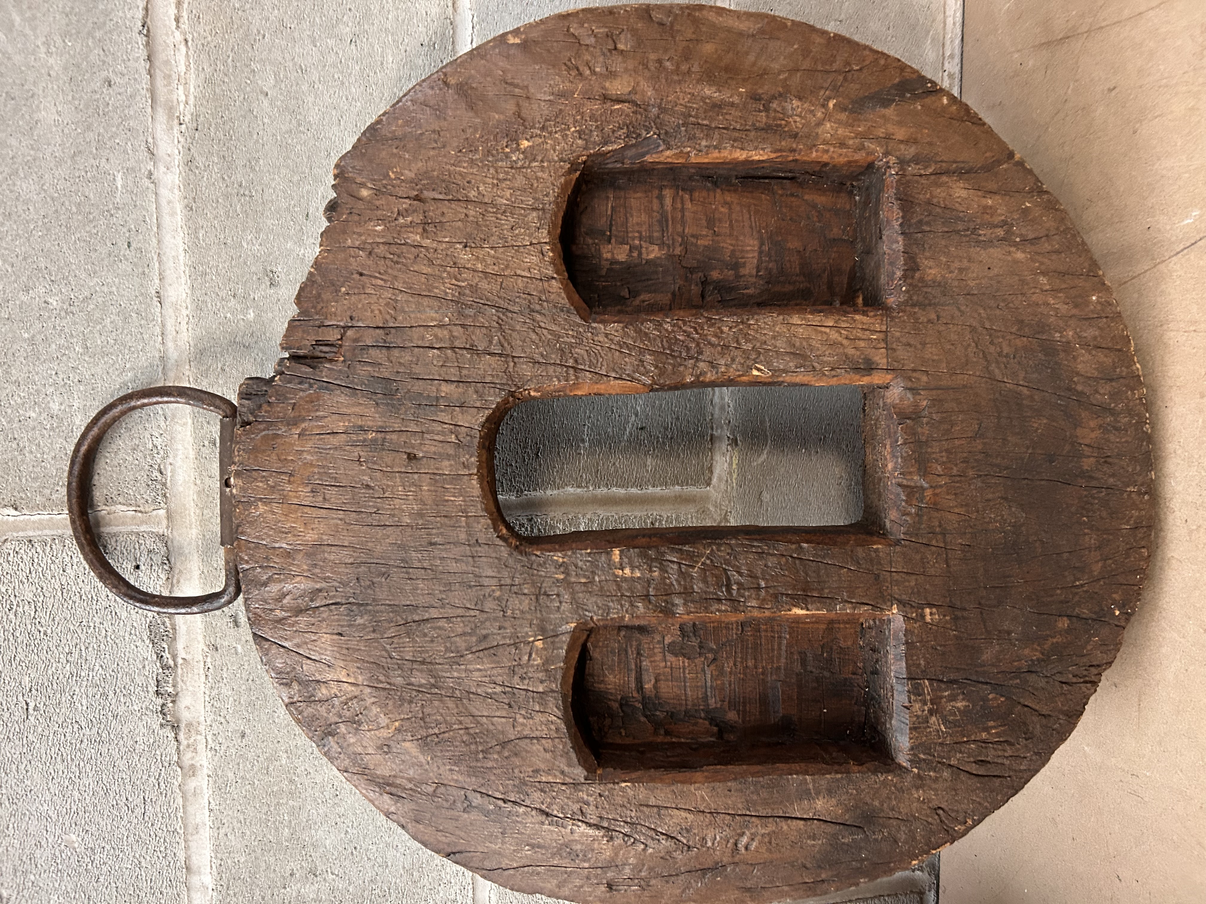 A single, large primitive object constructed of heavy, dark hardwood, likely serving as a component from an antique mill mechanism, pulley system, or large agricultural wheel. The circular wooden disk exhibits deep, visible grain separation and fissuring consistent with prolonged exposure and age. The front face features three vertically oriented, arched rectangular recesses. The reverse side contains a single, central vertical rectangular aperture. An oxidized iron suspension ring is secured to the top edge of the disk by a piece of distressed metal hardware. No discernible maker’s marks or inscriptions are present.