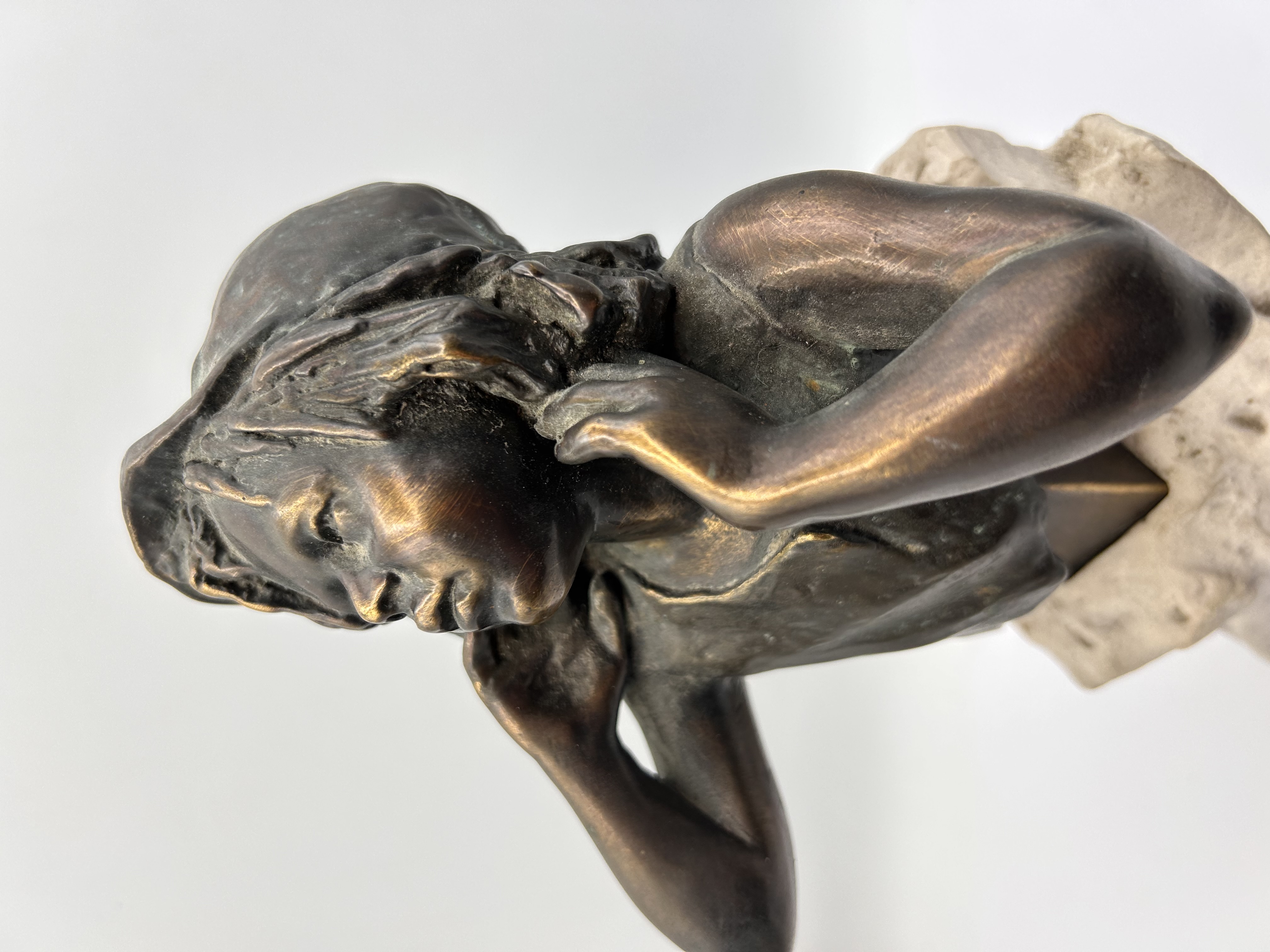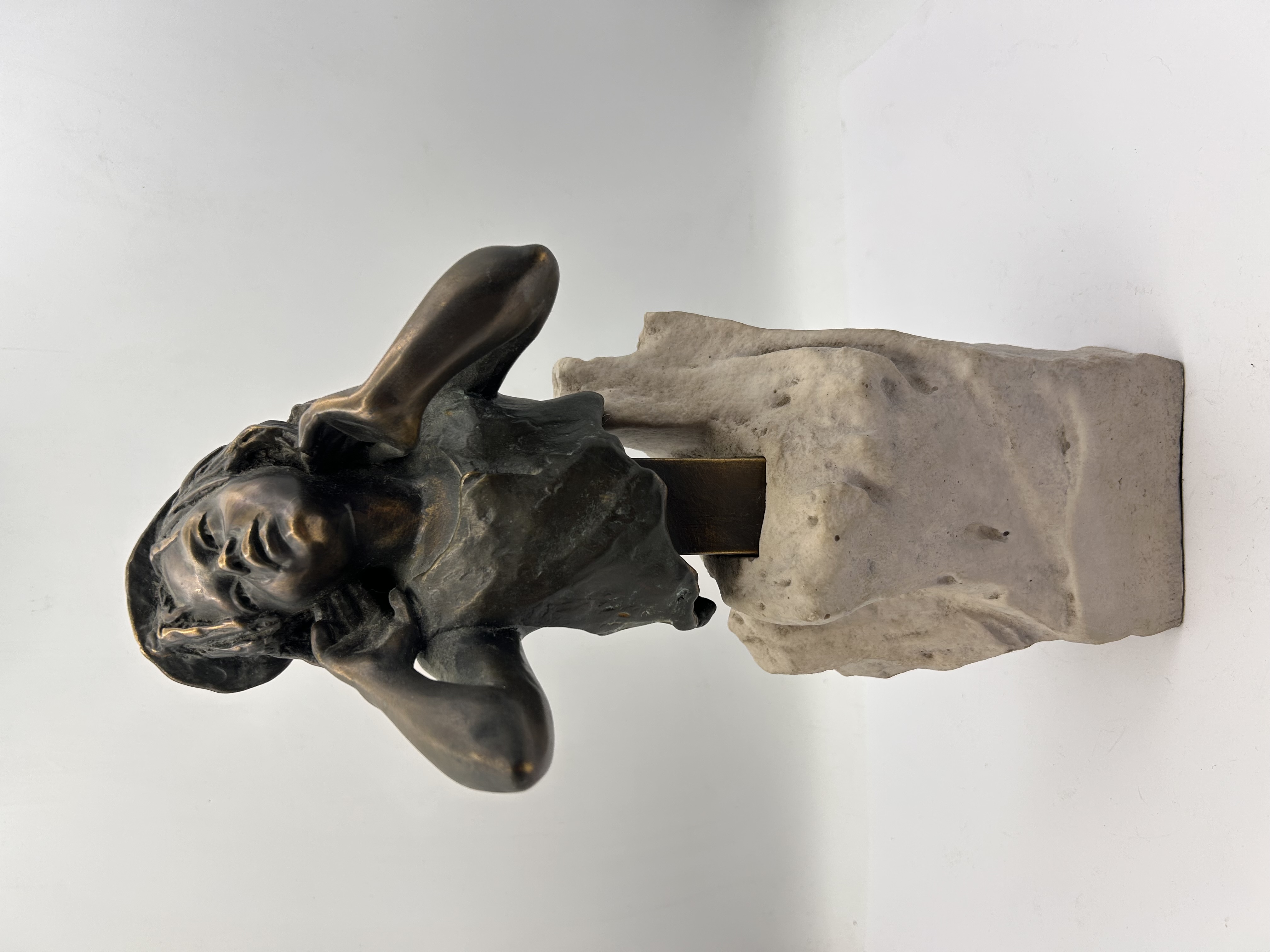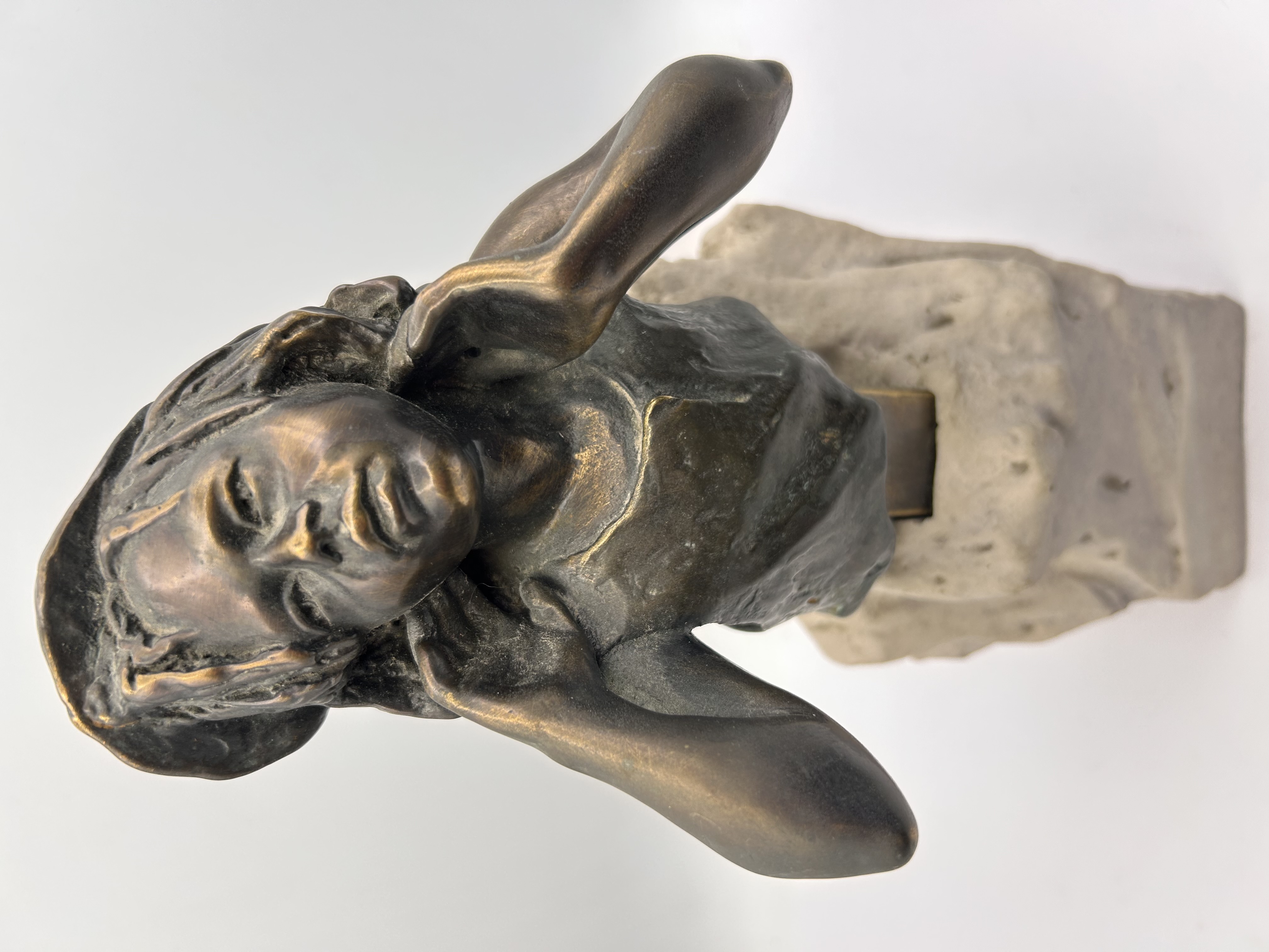 A single figurative bronze sculpture depicting the bust and upper torso of a young person, possibly a child, wearing a cap. The figure is rendered with both hands raised toward the ears, suggesting a listening or playful pose. The bronze exhibits a warm, dark brown patina with coppery highlights. The sculpture is mounted via a square bronze armature piece onto a rough-hewn, light-colored plinth, which appears to be stone or a composite material designed to simulate rough stone. A faint inscription, possibly a signature, reading “Amorga” is visible on the side surface of the rough-hewn base.