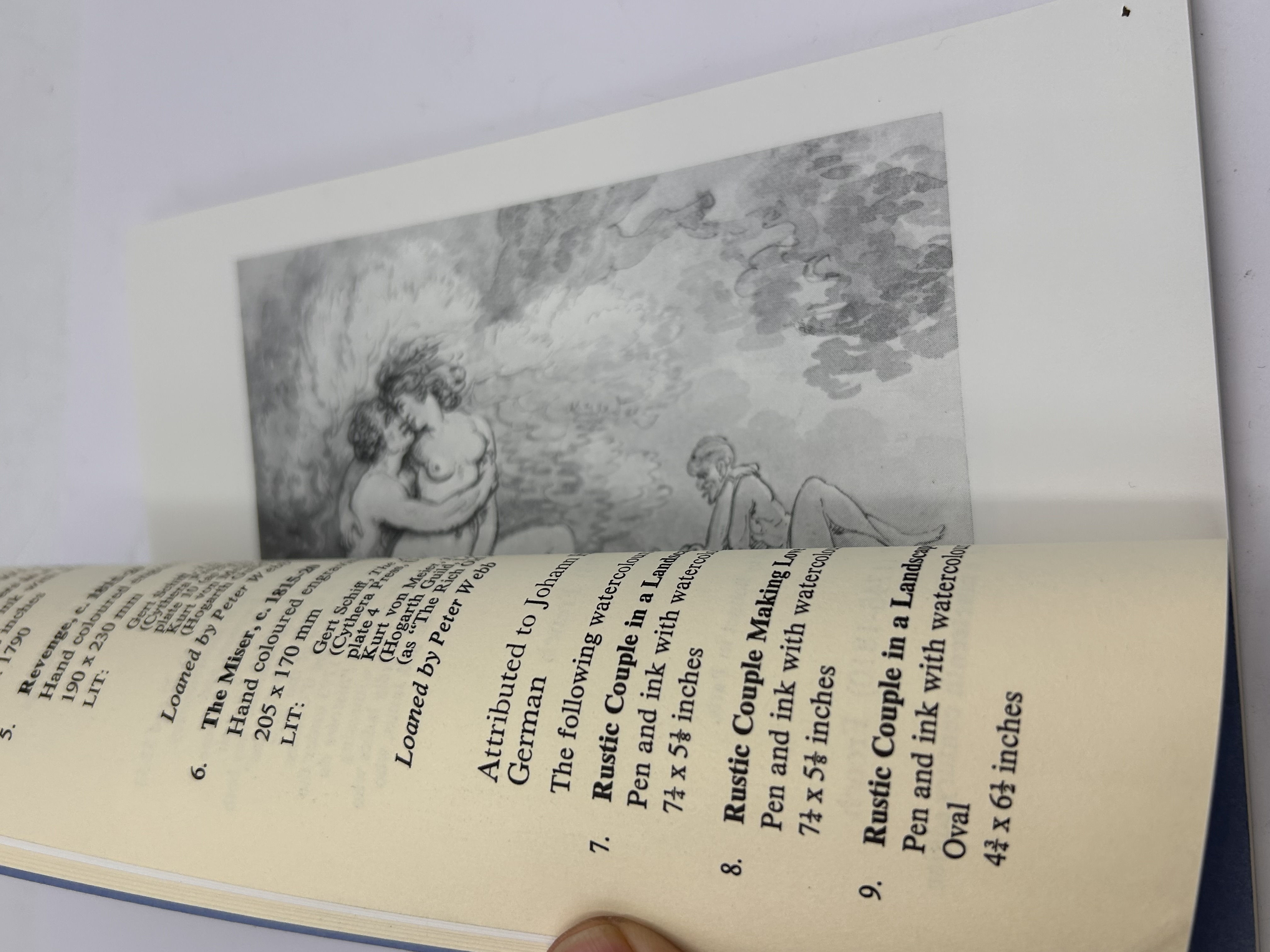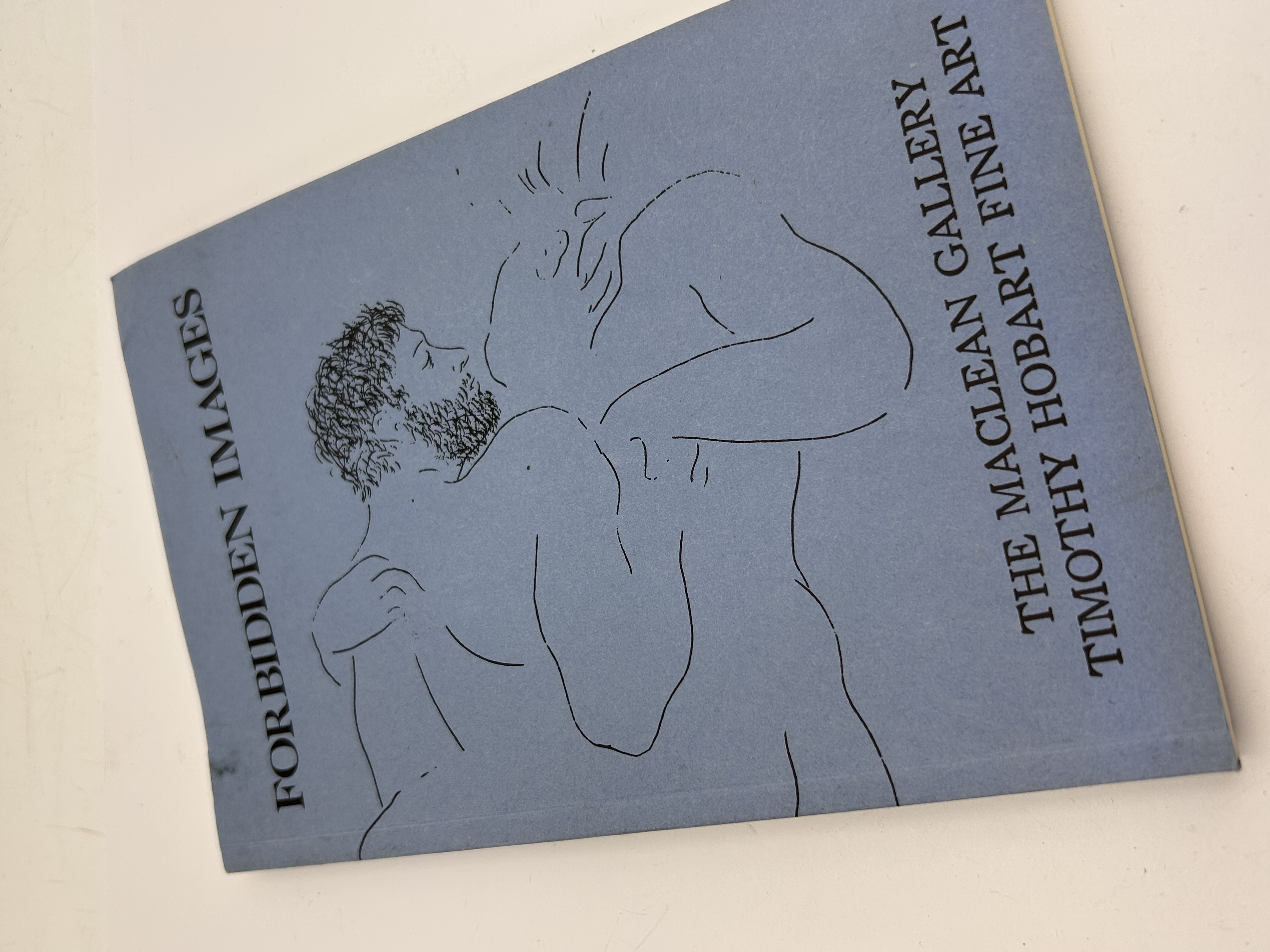This is a single softcover exhibition catalogue titled Forbidden Images: An Exhibition of Eastern and Western Erotica. The booklet was published by THE MACLEAN GALLERY and TIMOTHY HOBART FINE ART, likely dating to the late 20th century. The cover is constructed of blue cardstock and features a stylized black line drawing depicting embracing nude figures. The interior pages contain detailed catalog entries for the exhibited art objects, including specific descriptions (such as Rustic Couple in a Landscape), dimensions (e.g., 7½ x 5⅝ inches), and lender information (e.g., Loaned by Peter Webb). The entries are accompanied by monochrome photographic reproductions of the artwork.