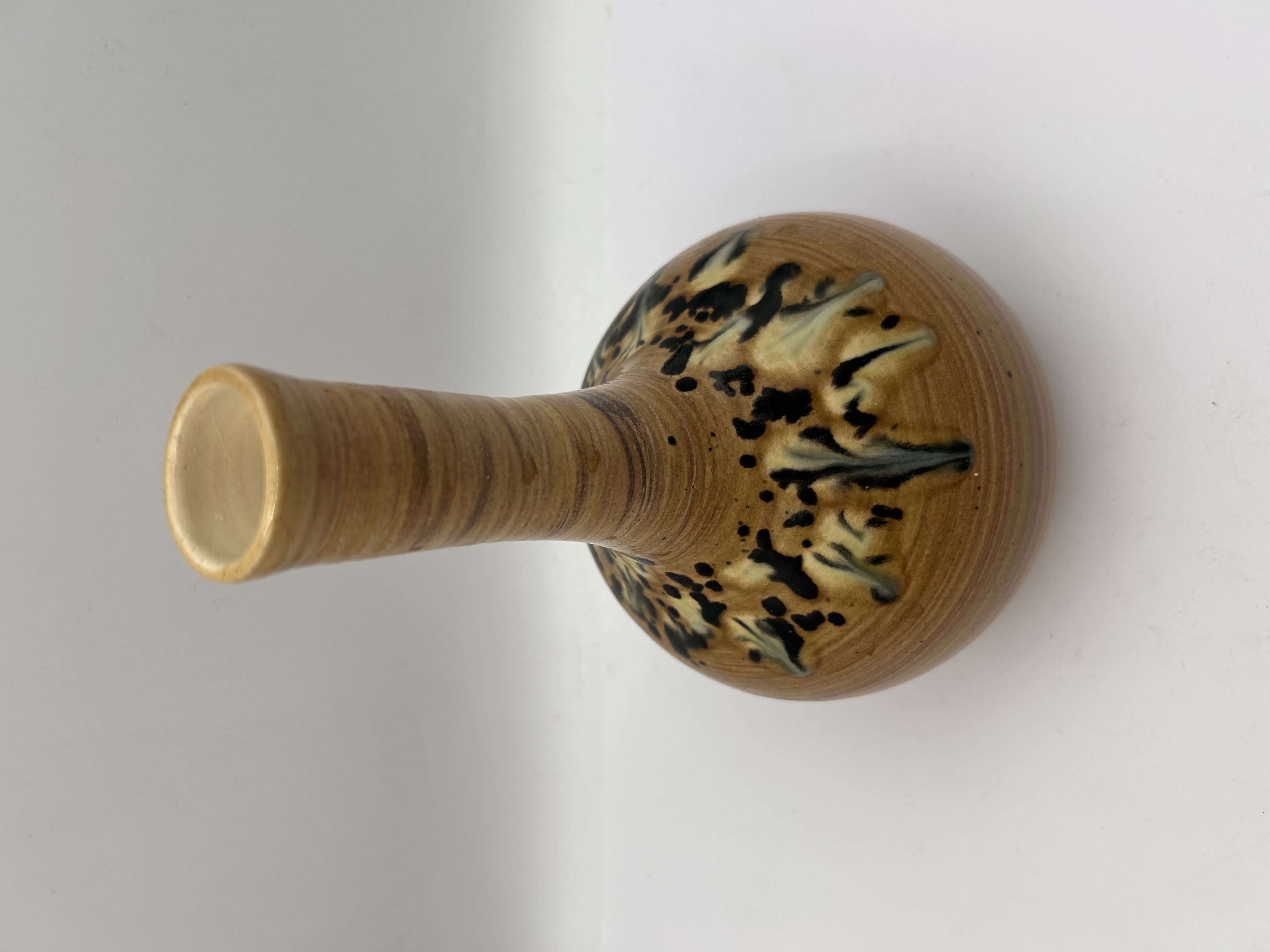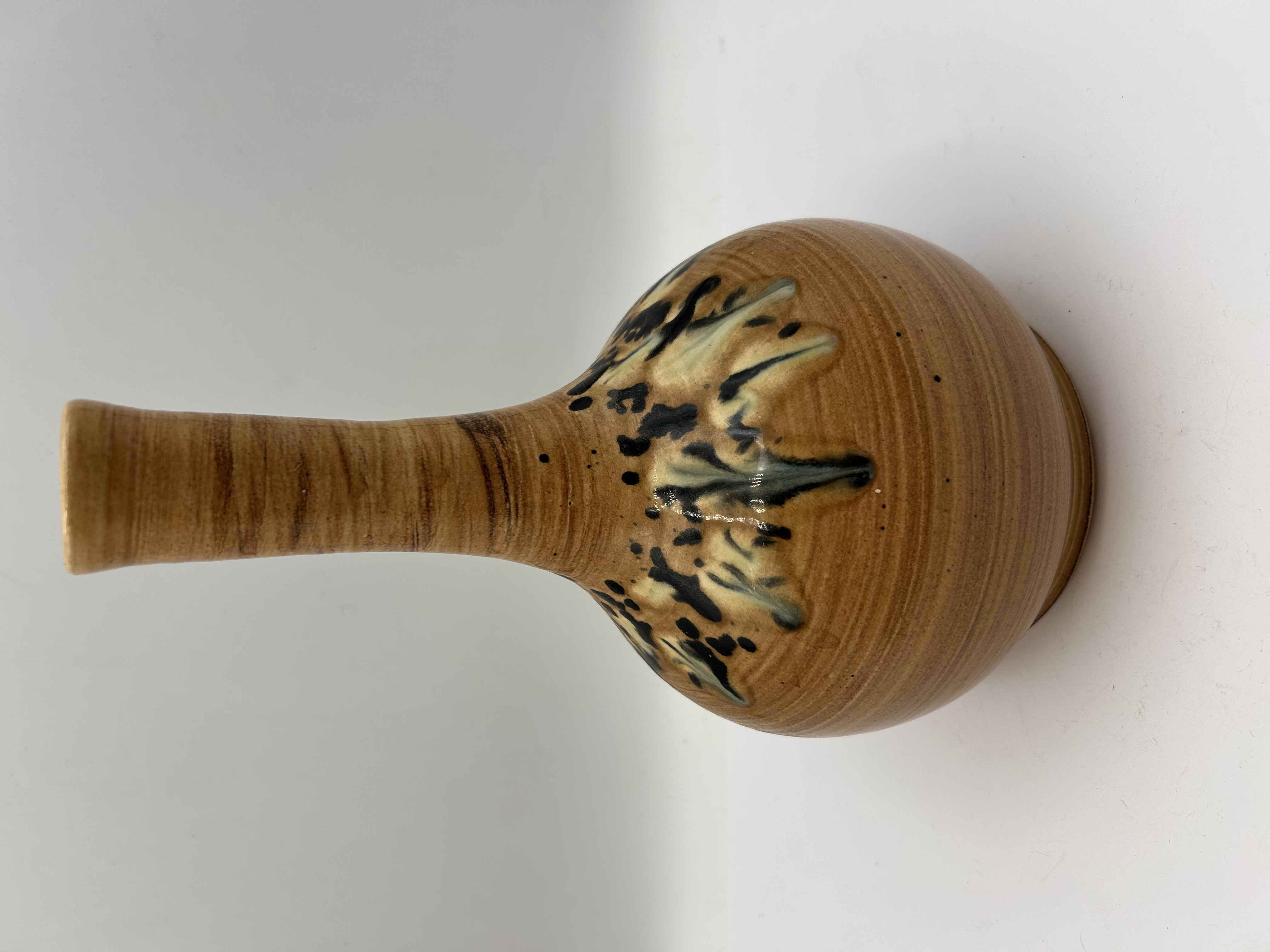 A single wheel-thrown studio pottery bottle vase by Janet Upton of Slindon Pottery, Sussex. The piece is executed in reddish-brown stoneware, featuring a classic gourd shape defined by a bulbous body and a tall, narrow neck. The surface is covered in a glossy glaze that highlights the horizontal throwing lines. Decoration consists of an abstract, speckled band around the shoulder featuring sweeping foliate motifs rendered in black, dark green, and creamy yellow glazes. The base bears the impressed initials J U and the impressed text Slindon Pottery, supplemented by an affixed paper label confirming the maker and location.