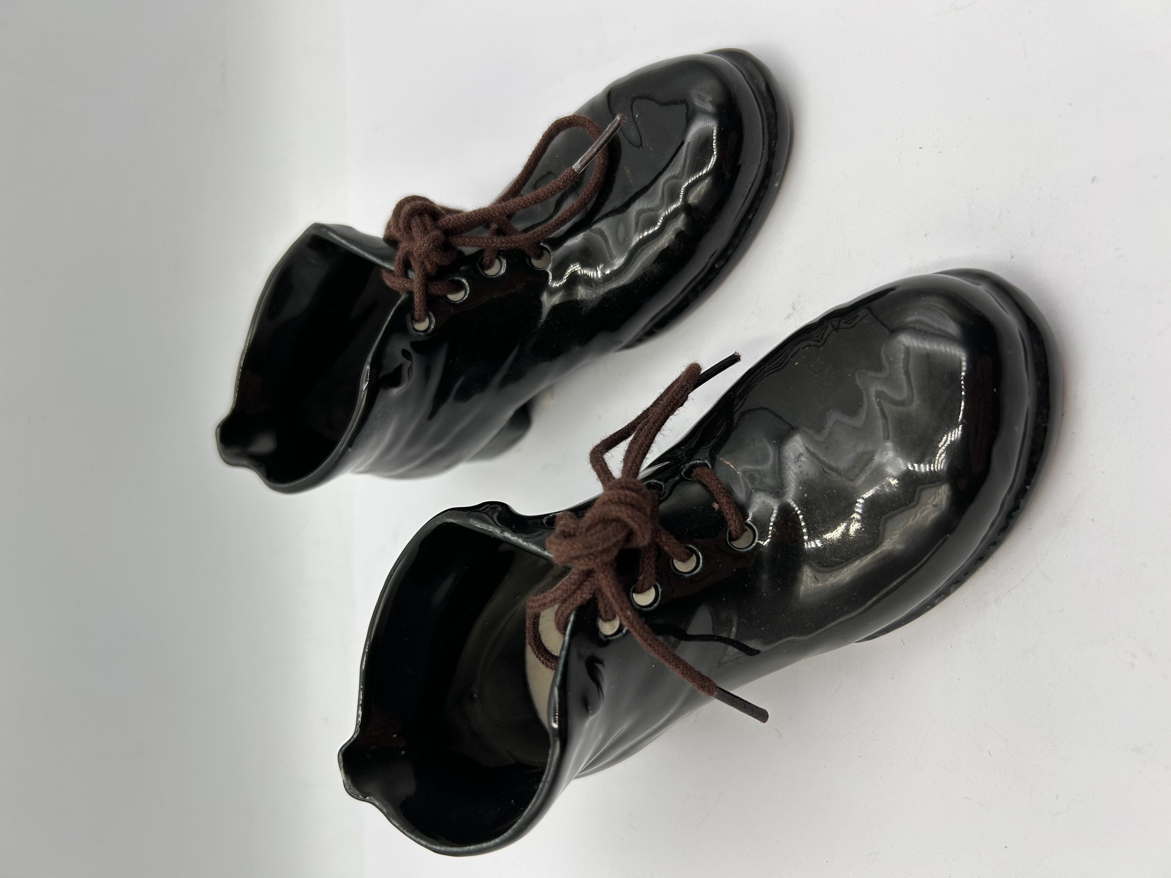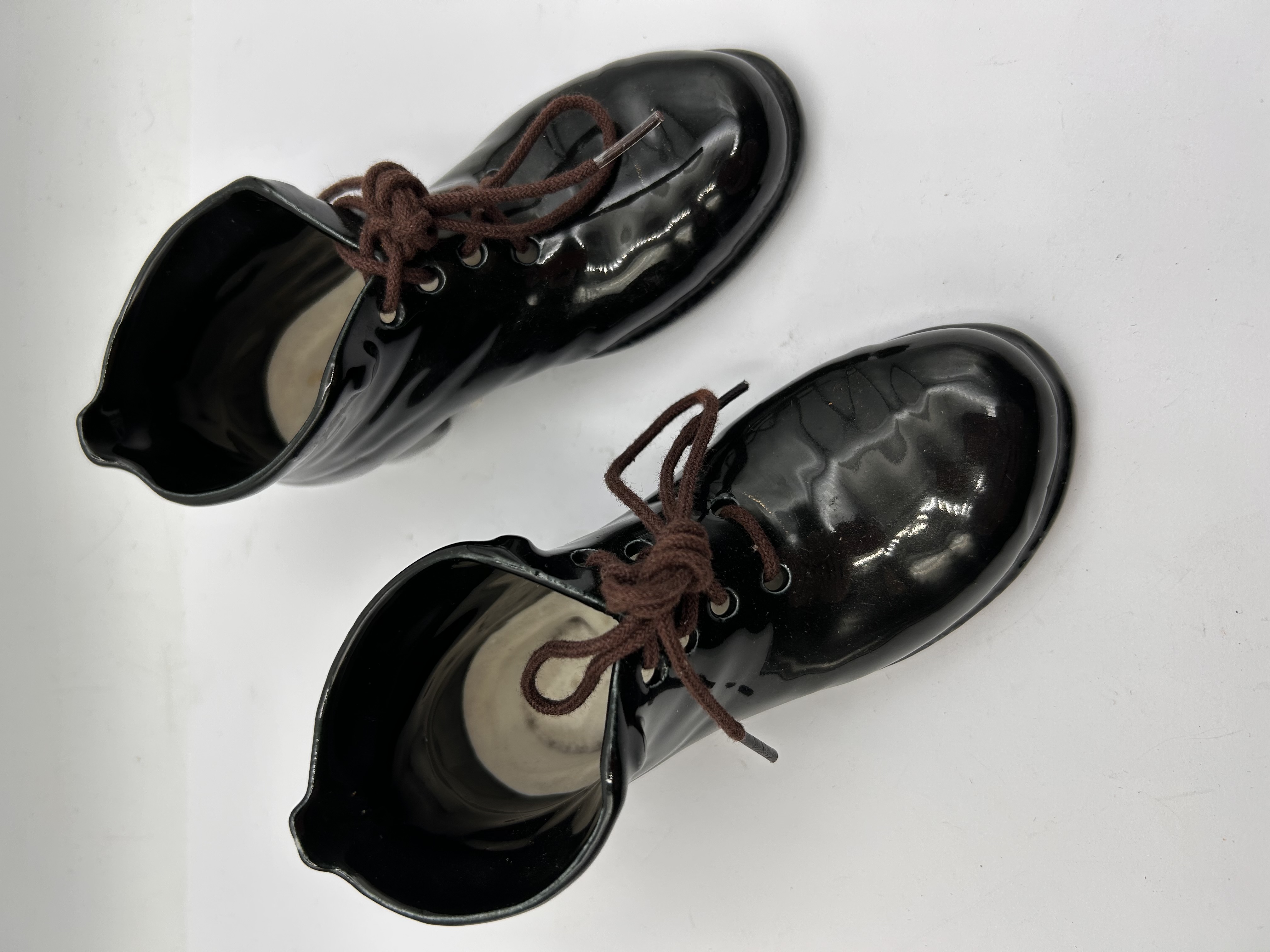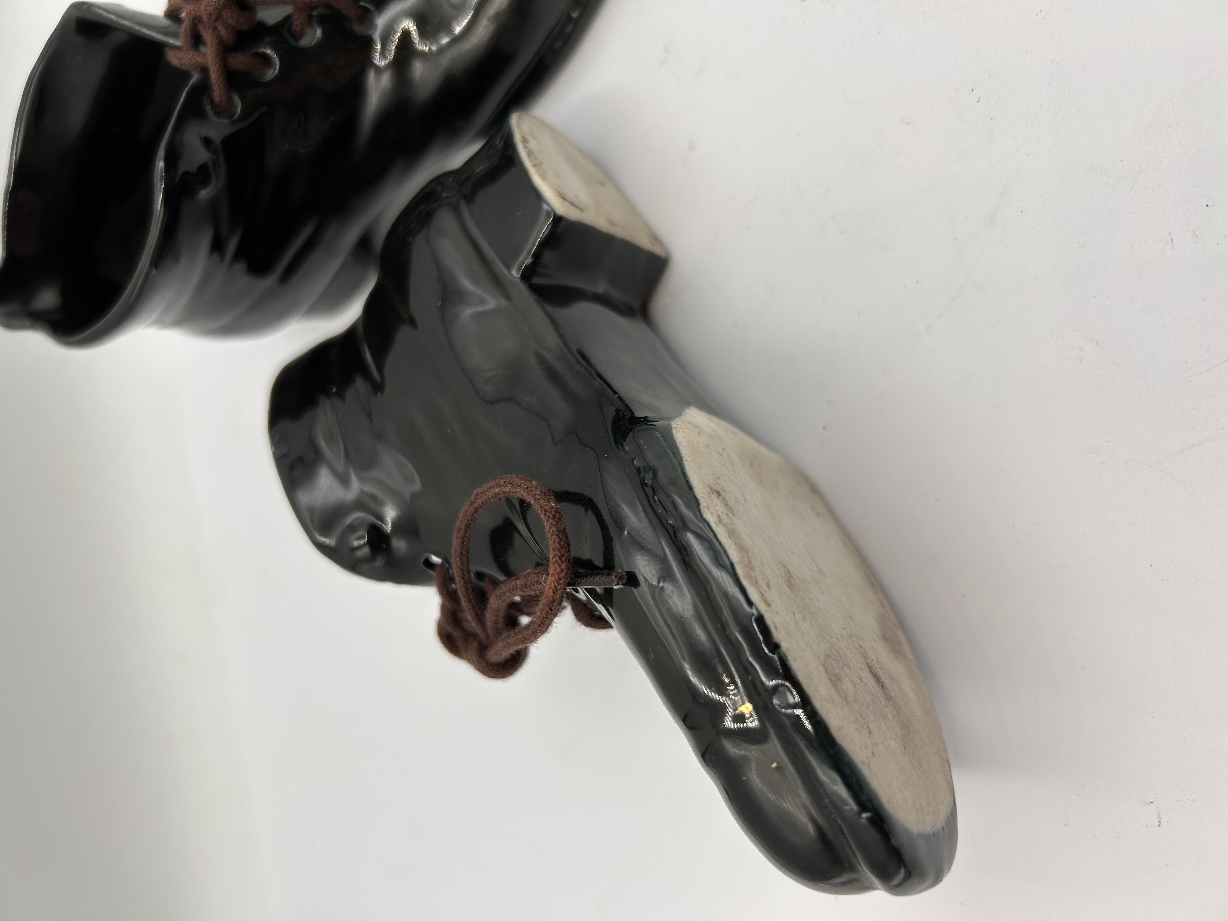 A pair of decorative containers or vases molded from ceramic, styled in the form of high-top laced boots. Each piece is finished with a high-gloss black glaze intended to mimic the appearance of patent leather. The interior is glazed black, contrasting with a cream-colored inner sole area. The boots feature molded eyelets threaded with functional brown fabric shoelaces, tied at the front. The exterior base is unglazed, revealing the natural, rough ceramic material. No manufacturer marks, stamps, or inscriptions are visible.