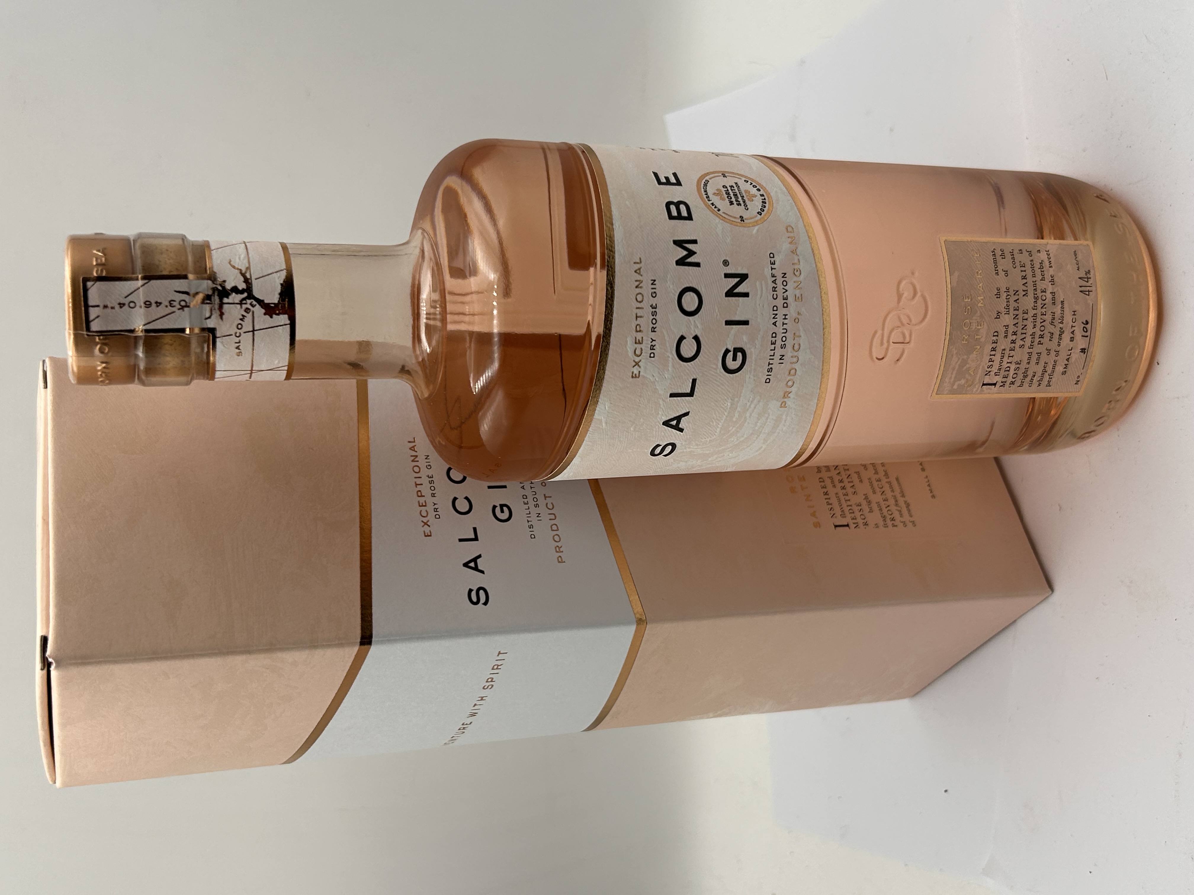 A set of two items consisting of a sealed bottle of Salcombe Rosé Sainte Marie Exceptional Dry Gin and its original presentation carton. The spirit is distilled and crafted in South Devon, England, and is labeled as a Small Batch product (No. 106). The gin is pale rose-tinted and features an alcohol content of 41.4% ALC/VOL. The glass bottle is sealed with a wooden cork and foil and bears a Double Gold medal seal from the San Francisco World Spirits Competition. The aesthetic design of both the bottle and the carton utilizes a consistent scheme of soft matte pink/peach, white, and metallic gold accents.