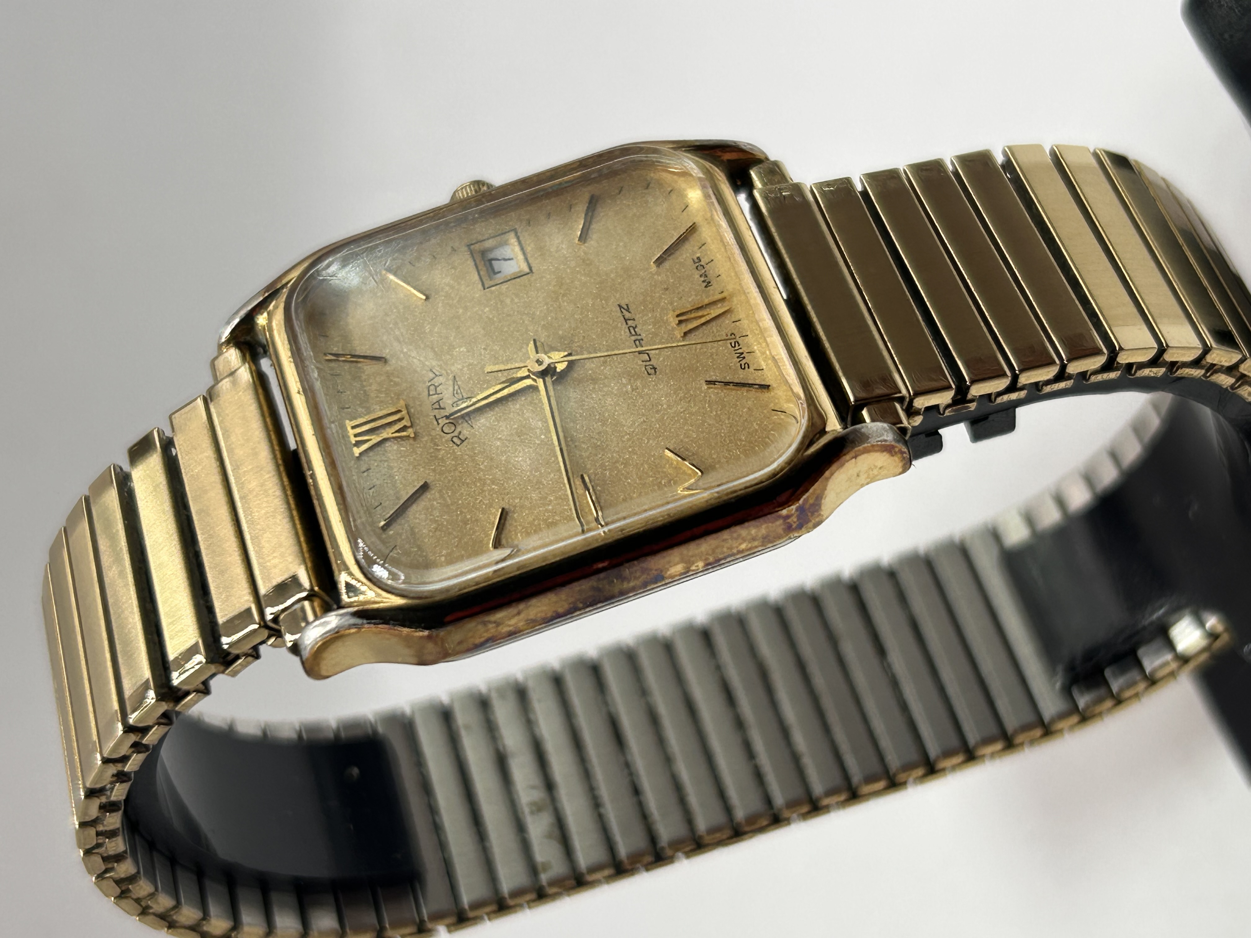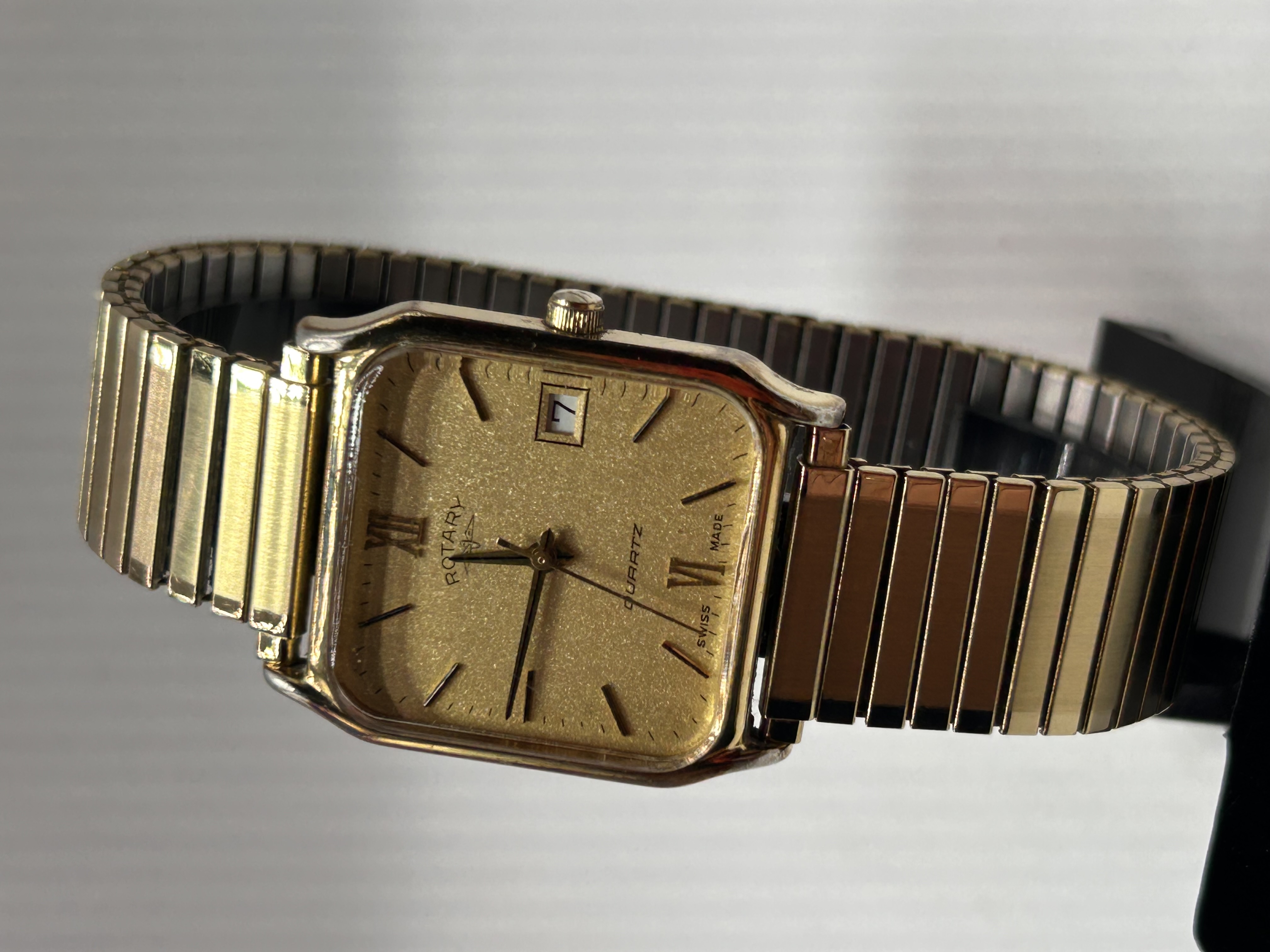 A single Rotary quartz wristwatch featuring a rectangular gold-toned case. The watch is fitted with a two-tone gold and silver expansion bracelet. The textured gold-toned dial displays applied baton indices, with Roman numerals marking the twelve (XII) and six (VI) positions. A date aperture is present at the three o’clock position, currently displaying the number ‘7’. The dial is marked “ROTARY,” “QUARTZ,” and “SWISS MADE.” The brushed metal case back displays the faint stamped number “2185.”