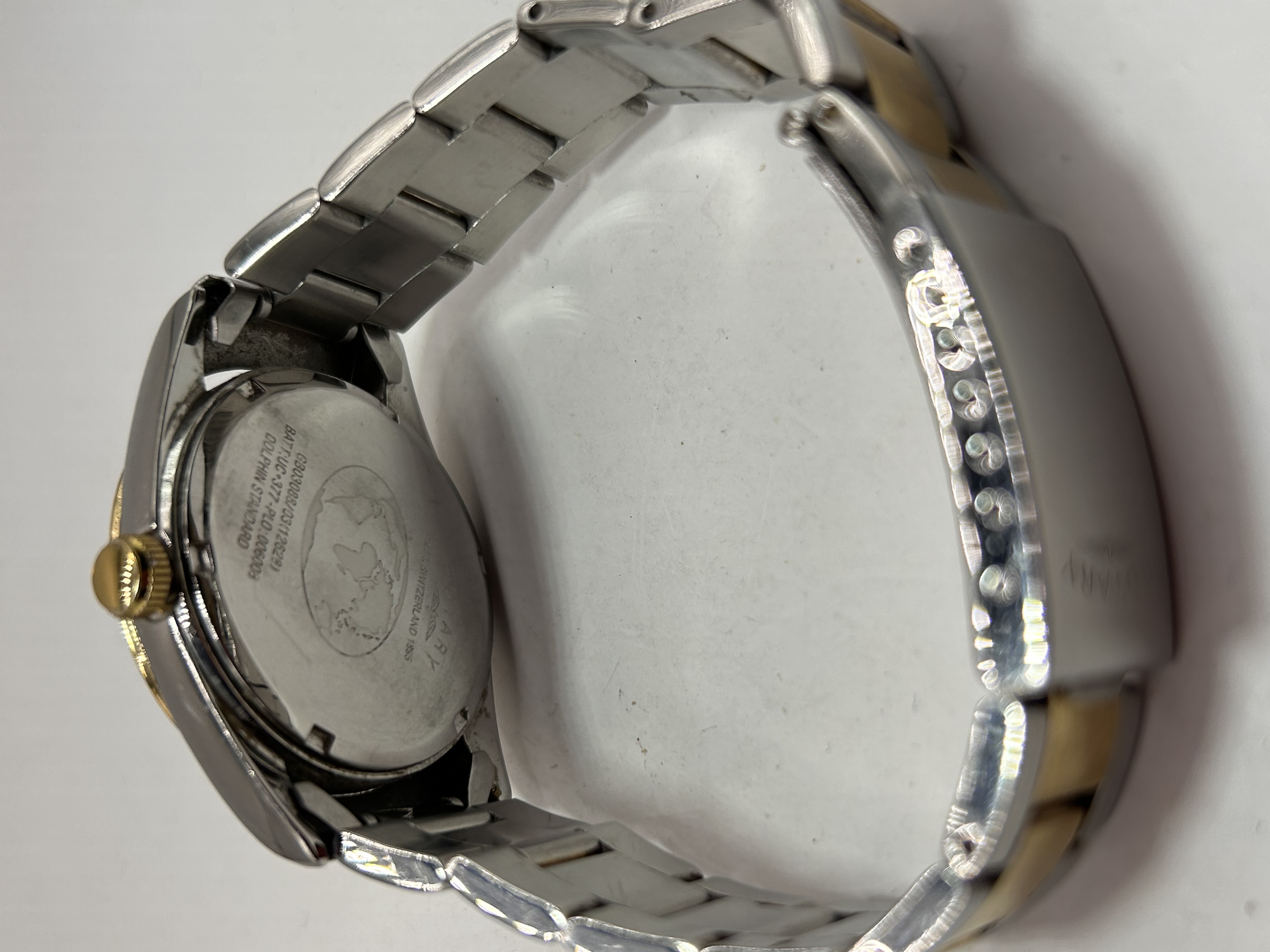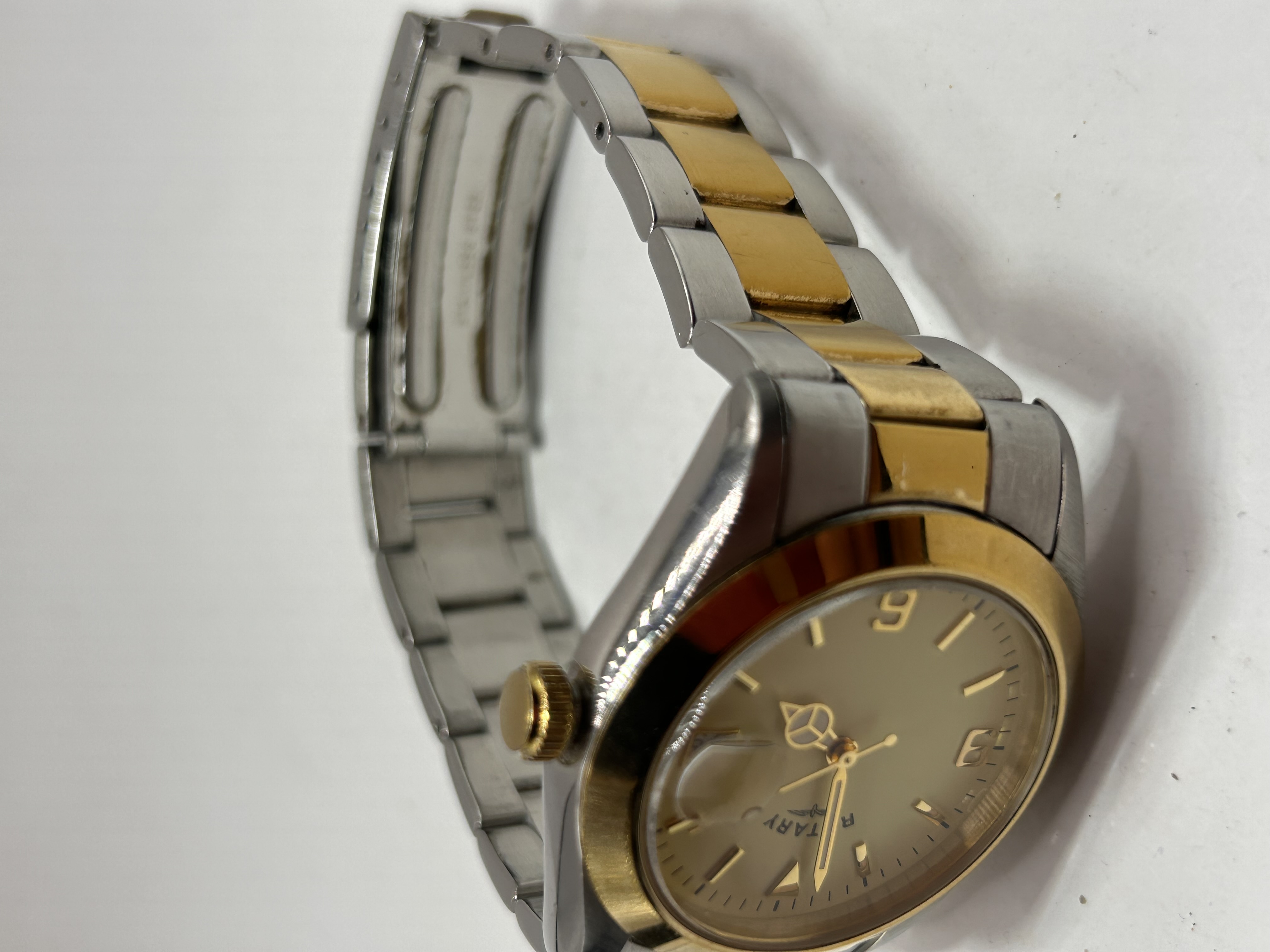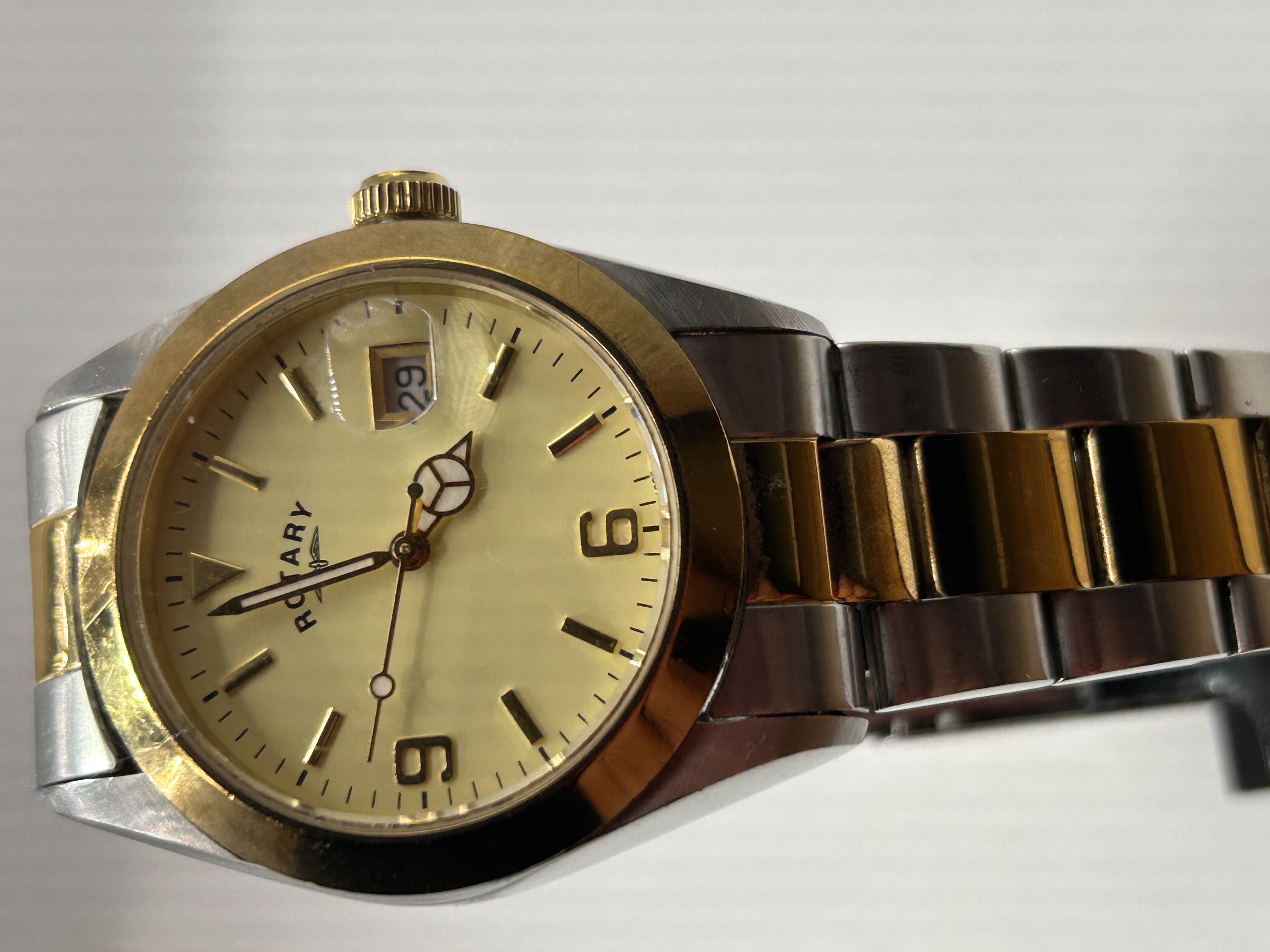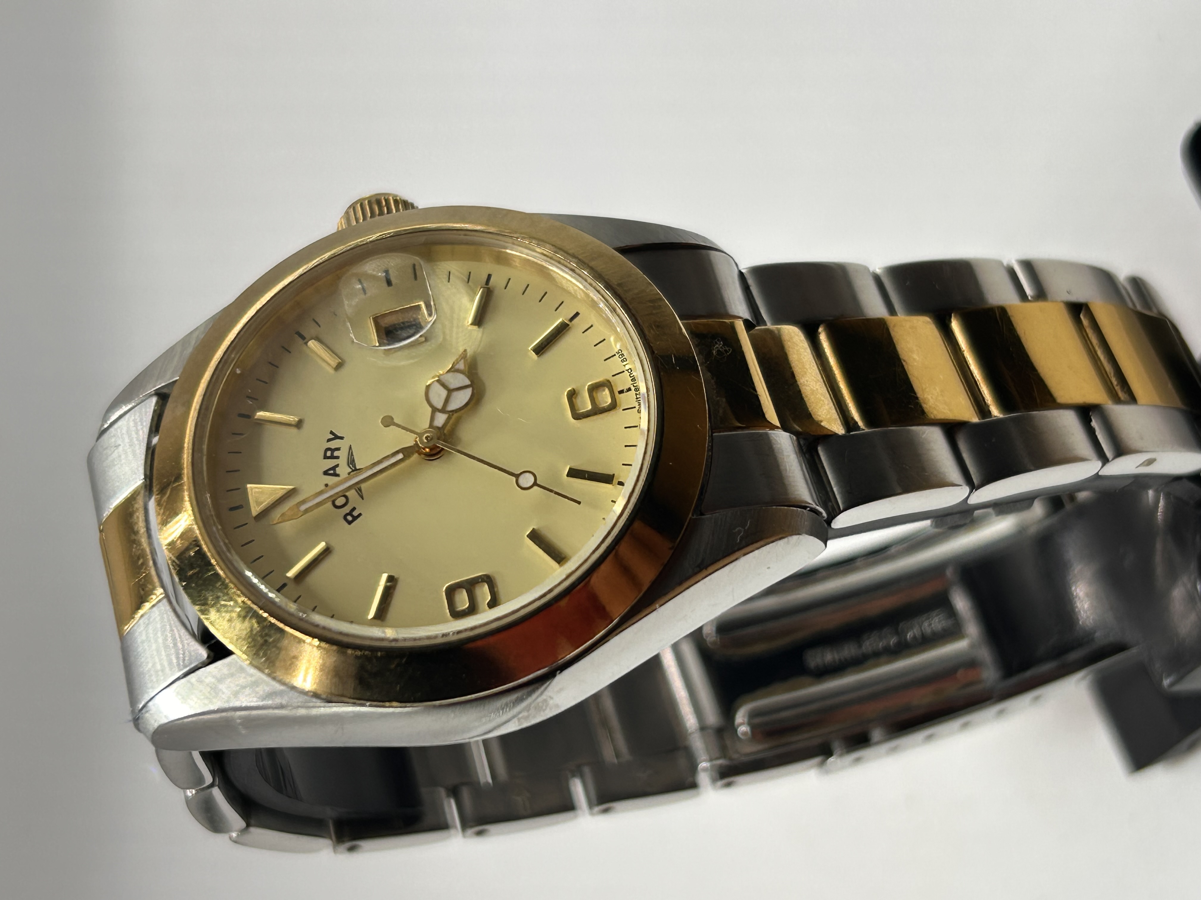 A Gents Rotary two-tone wristwatch, identified in the market as the Oyster Explorer Style, constructed with a stainless steel case and bracelet accented by gold-tone plating. The watch features a champagne-colored dial with applied gold-tone baton indices, Arabic numerals at the 6 and 9 positions, and a magnified date window (cyclops) at the 3 o’clock position. The dial is inscribed “ROTARY” below the 12 o’clock marker and “SWITZERLAND 1895” near the 6 o’clock marker. The stainless steel caseback is engraved with “ROTARY,” “SWITZERLAND 1895,” the reference number GB00008/03/25281, and the designation “DOLPHIN STANDARD.” The bracelet closure is marked “STAINLESS STEEL.”