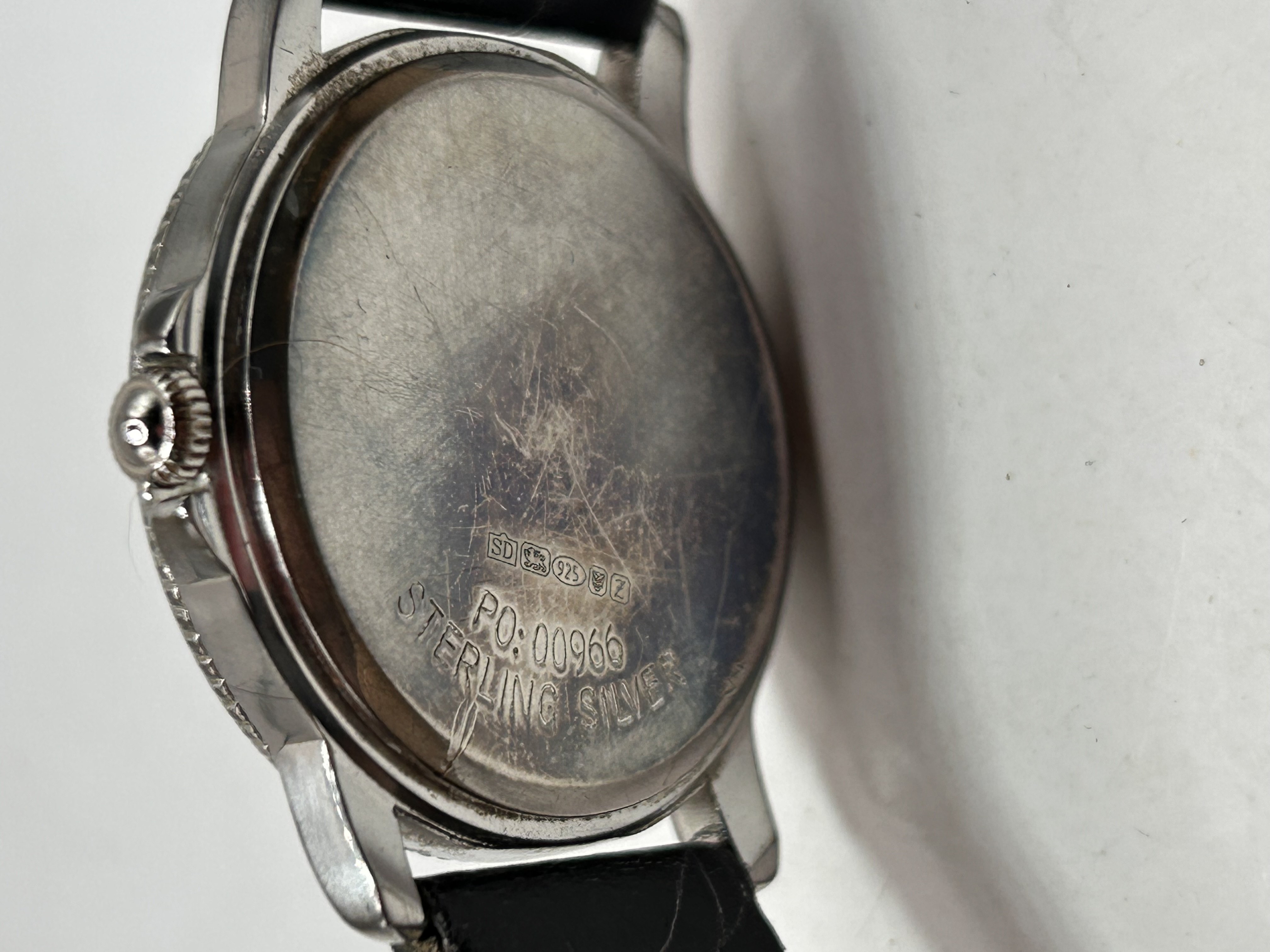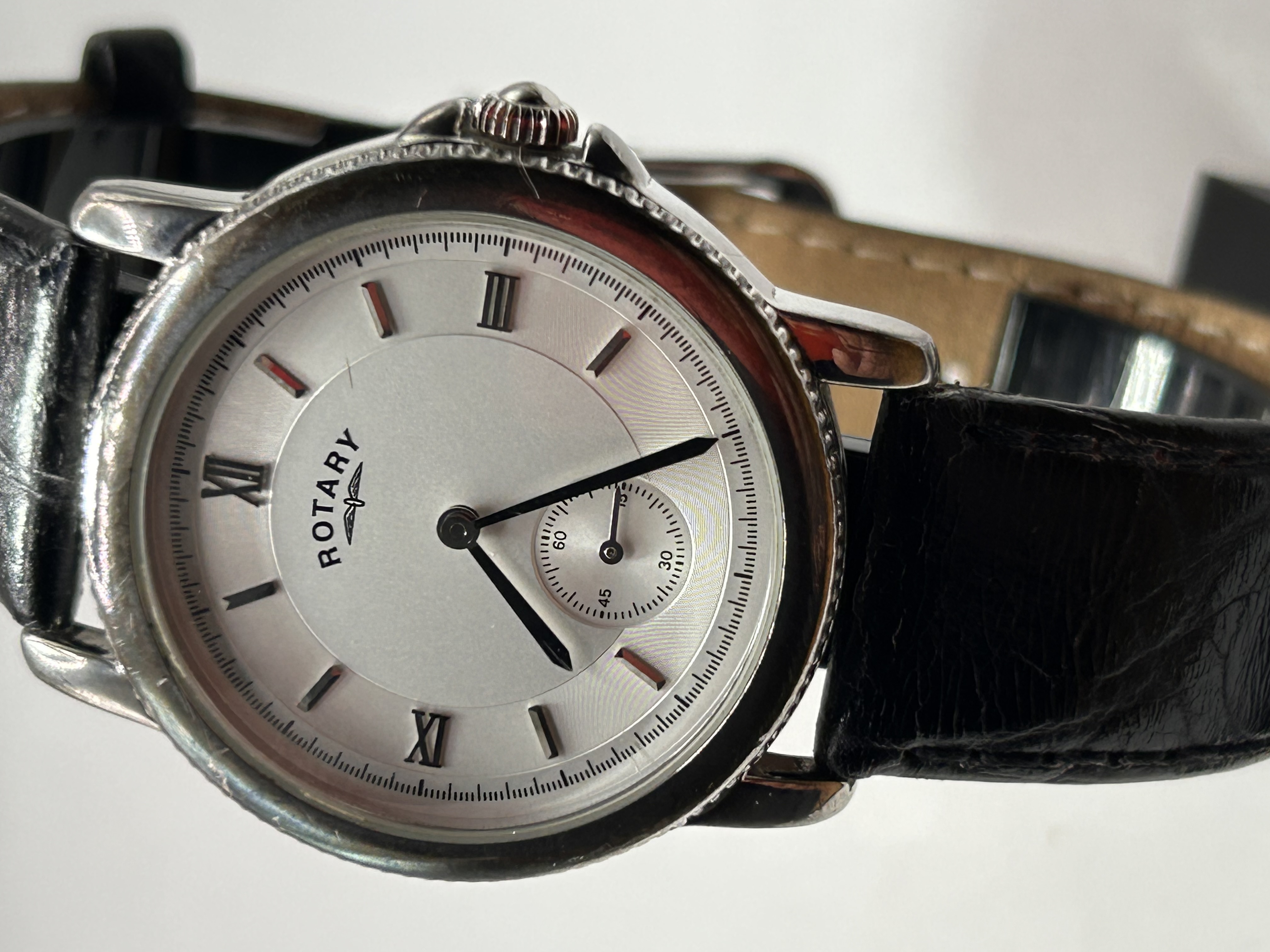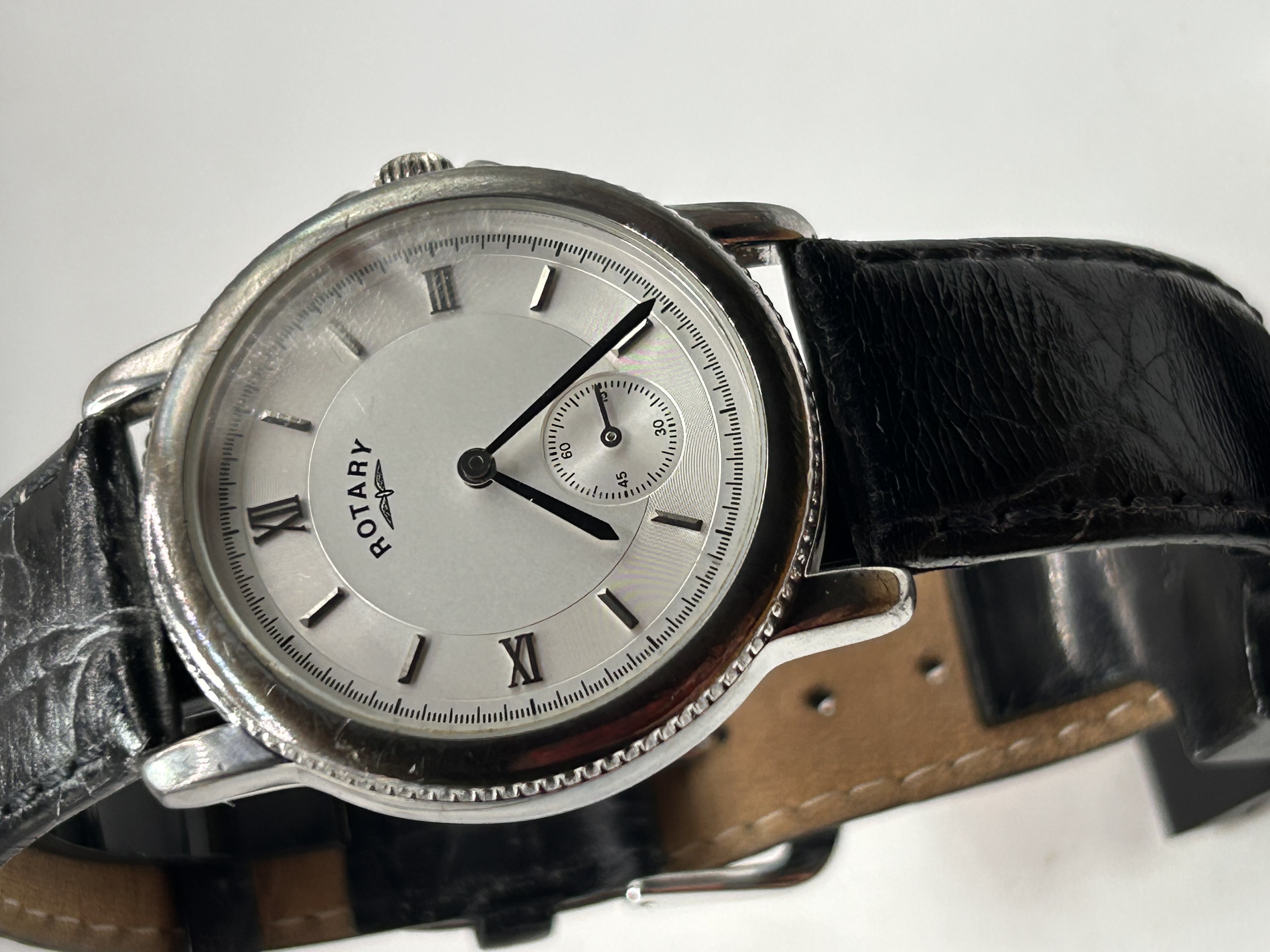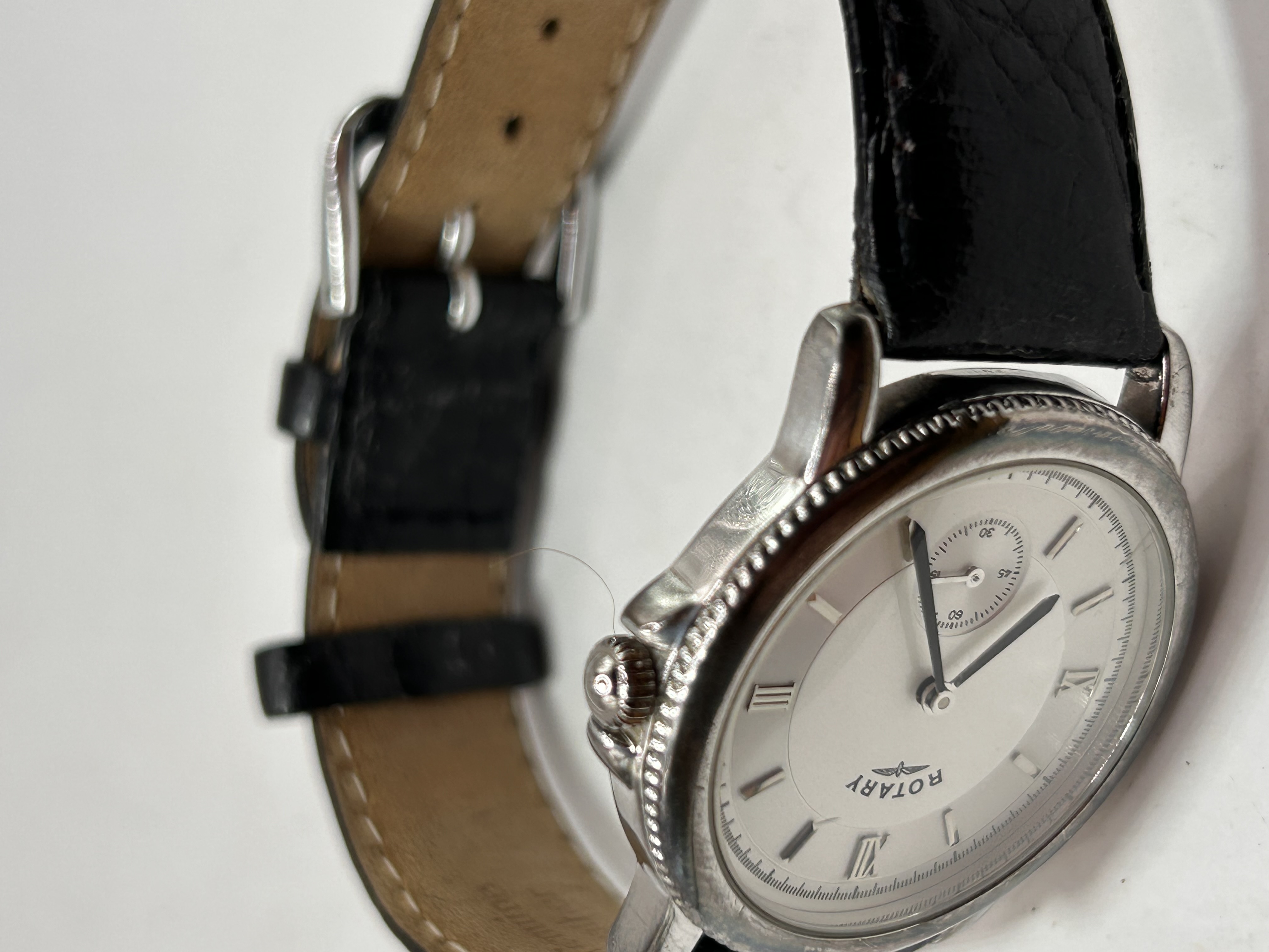 A single Rotary Canterbury dress wristwatch, identified by market consensus as the style popularized as the “Sherlock Watch.” The watch features a round, silver-toned case with a textured bezel. The caseback is explicitly marked “STERLING SILVER” along with the identification number “P.O. 00960” and a series of four visible hallmarks, confirming the material. The white dial is signed “ROTARY” beneath the company’s winged logo. Time is indicated by applied Roman numerals at the cardinal points and stick hour markers. A subsidiary seconds sub-dial is located at the 6 o’clock position. The watch is fitted with a black leather strap featuring a crocodile grain pattern.