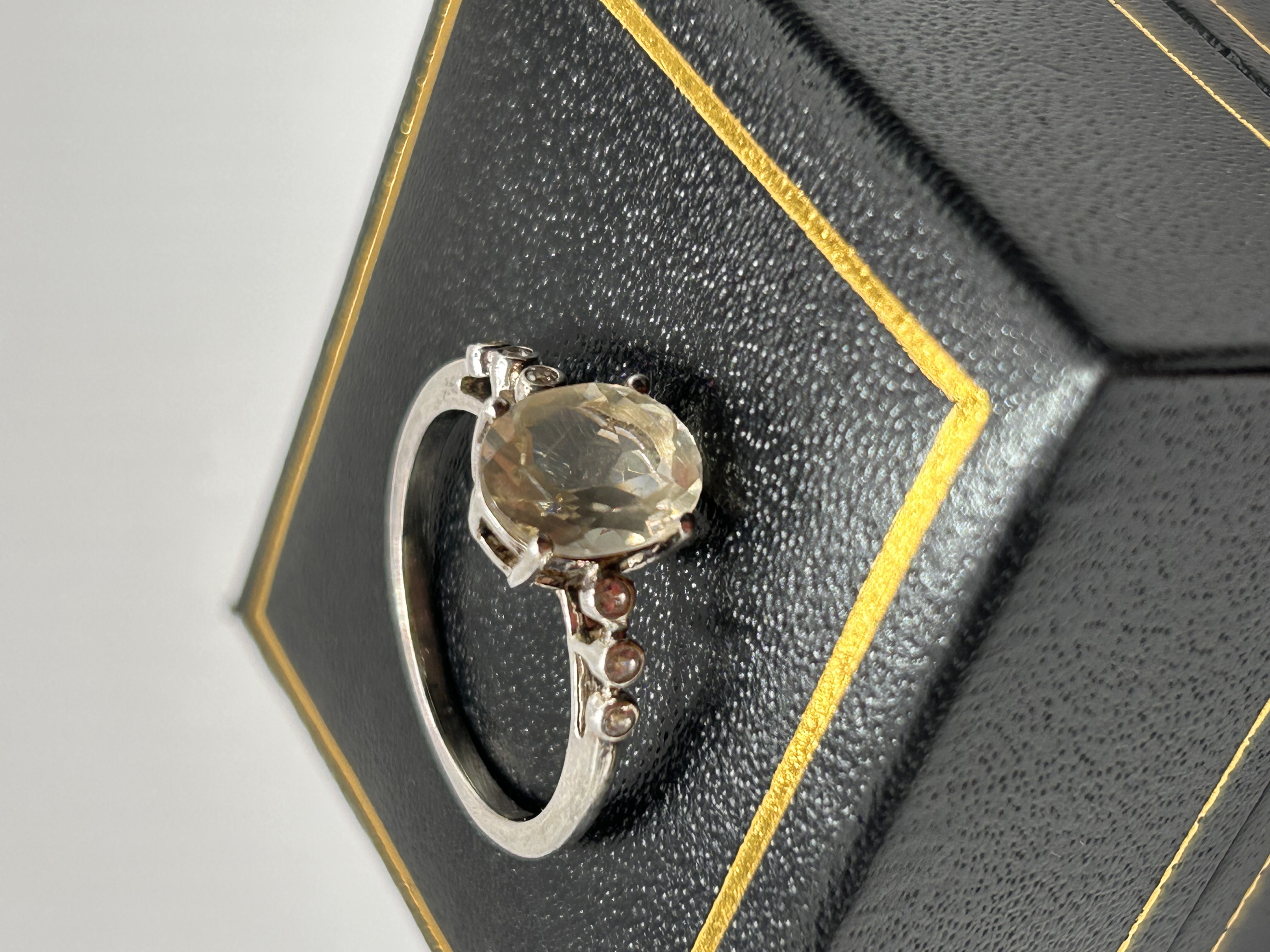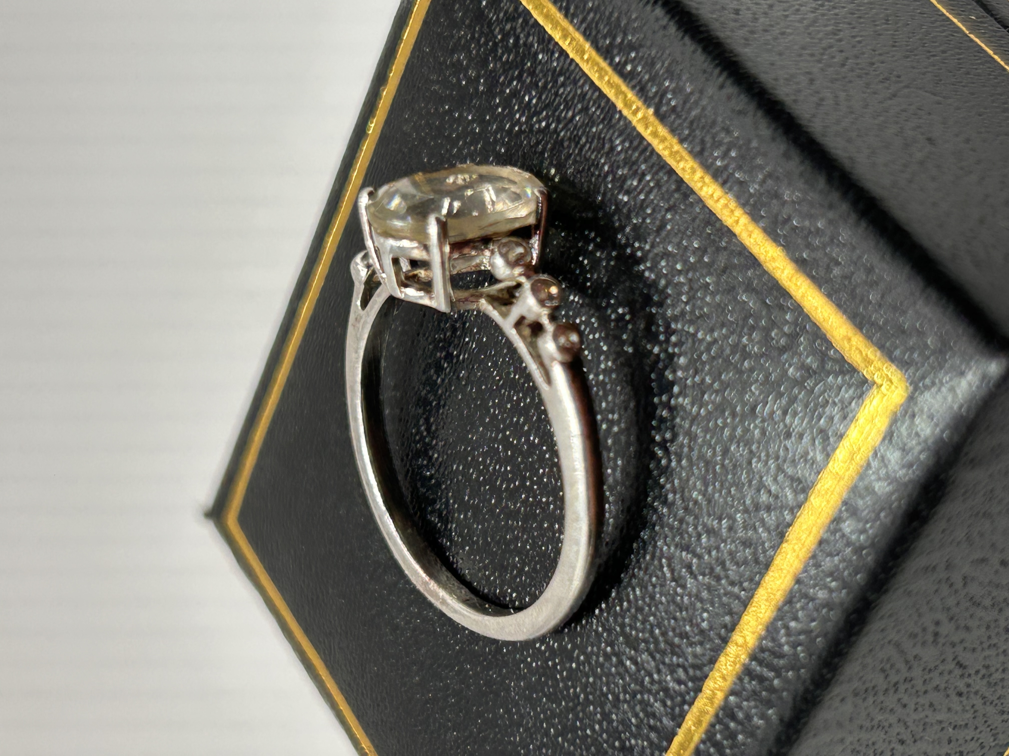 A single finger ring constructed of white metal, attributed as sterling silver based on strong consensus from market comparables and visual style. The ring features a large, centrally mounted oval-cut gemstone, which presents a colorless to pale yellow hue. The stone is secured in a raised six-prong basket setting. The shoulders of the silver band are accented with small, round-cut colorless stones, three visible on each side, integrated into the design. The band exhibits a polished finish. No visible hallmarks or inscriptions are discernible.